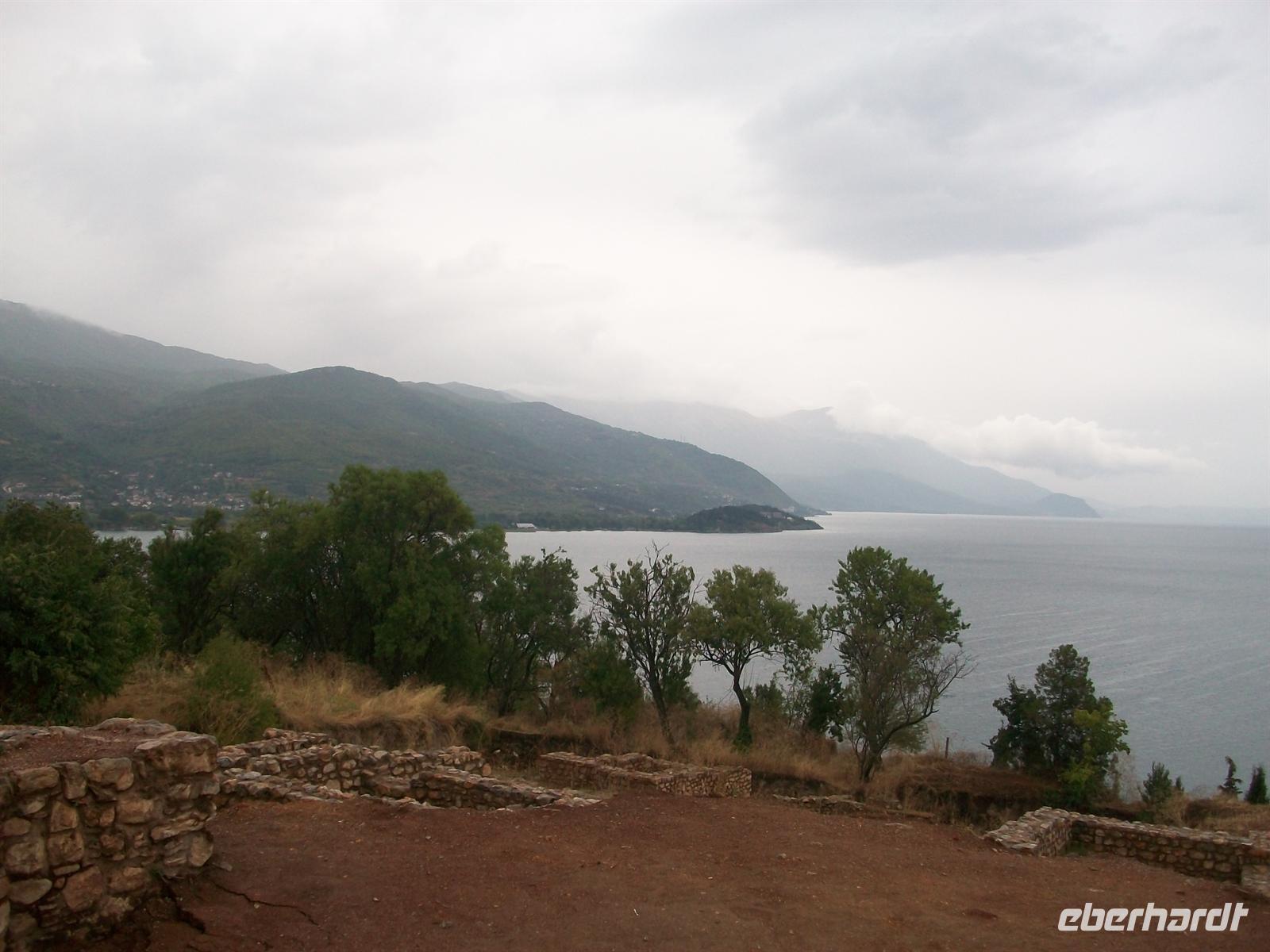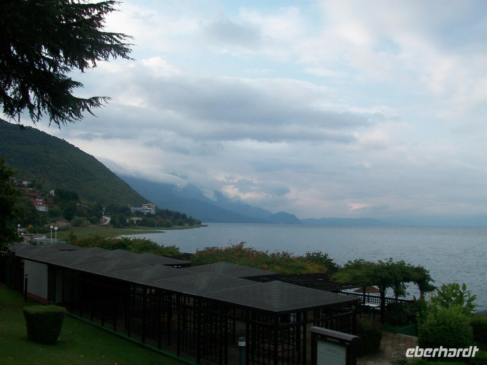 Leider ist das Wetter trüb und regnerisch und das Unwetter hat die Luft auch etwas abgekühlt. Aber das stört unseren Tatendrang nicht im Geringsten; vor uns ausgebreitet liegt der Wasserspiegel des Ohridsees, der eine Fläche von rund 270 Quadratkilometern einnimmt und dabei mehr als doppelt so groß ist als unsere Müritz.
