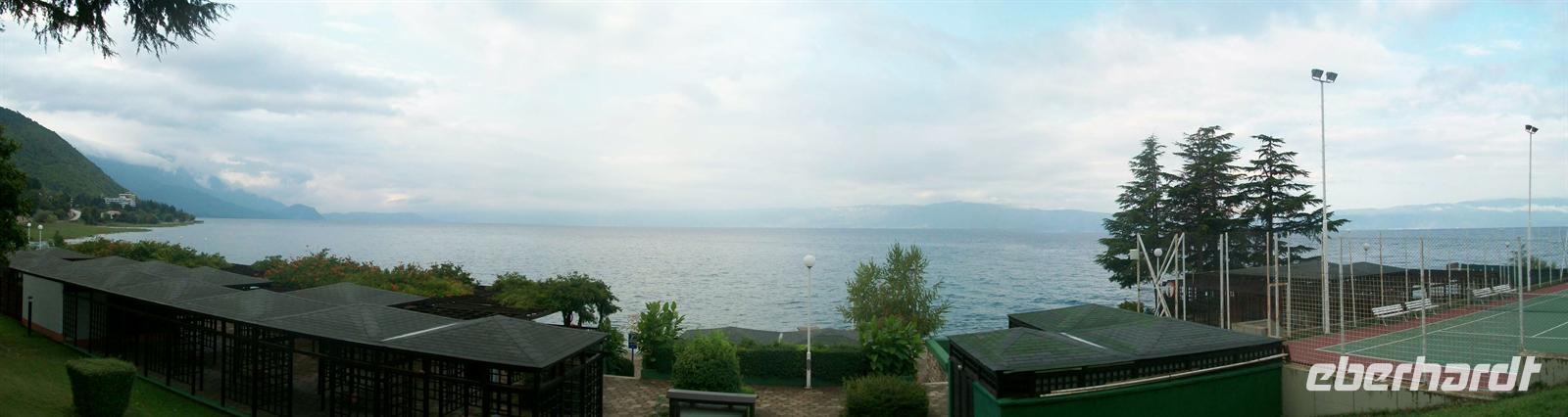 11.9.2010. Am Morgen dann trifft sich unsere kleine Reisegruppe beim Frühstück wieder. Von hier haben wir auf den großen See und die gegenüberliegenden Höhen, von denen wir gestern von Albanien kommend hinuntergefahren sind, einen schönen Blick.