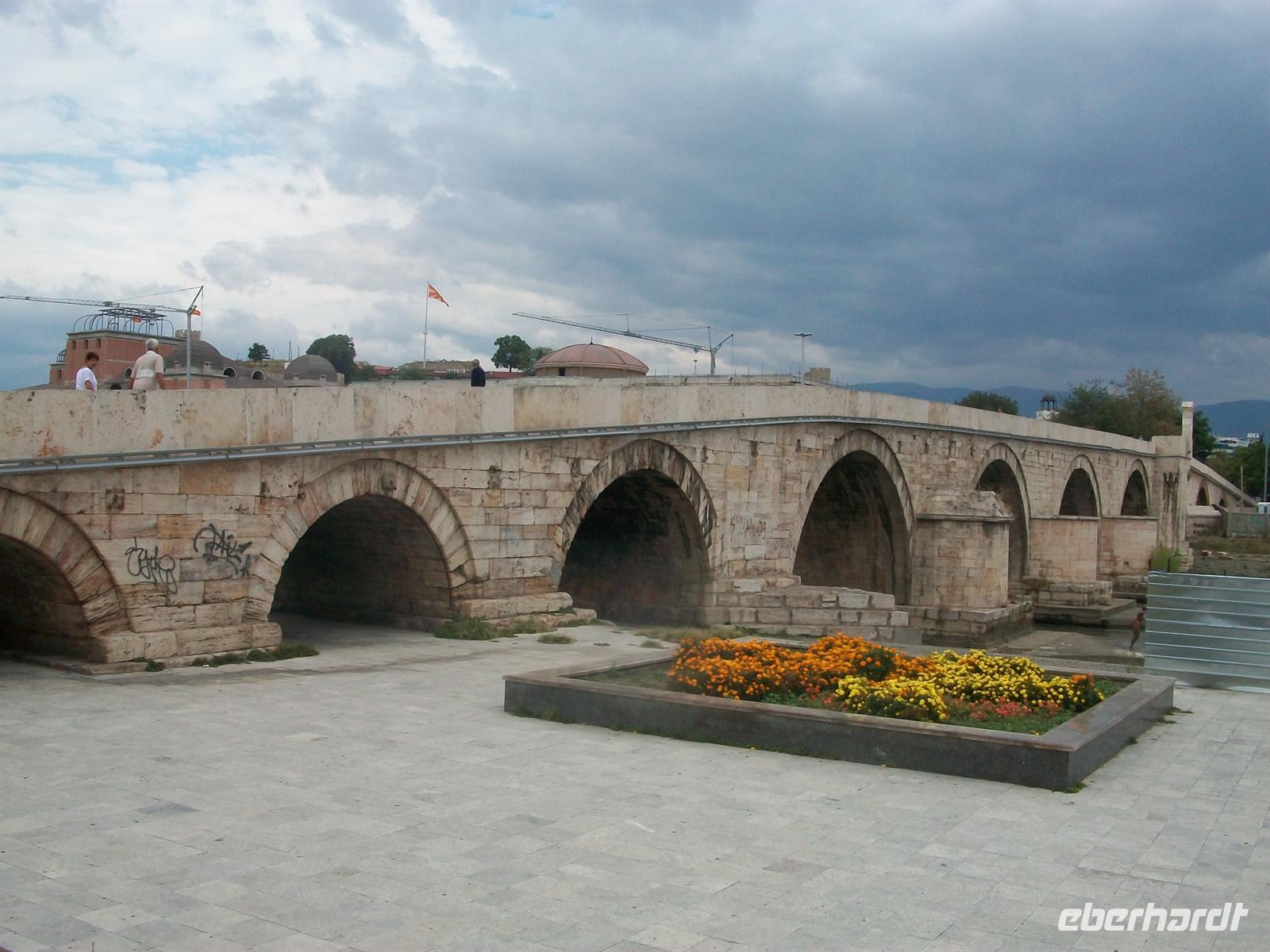 Gegen 11.45 Uhr erreichen wir Skopje und wir können gleich mit der Stadtführung beginnen. Auch hier ist ein wichtiges Wahrzeichen die Festung welche auf einer Anhöhe liegt und uns einen schönen Blick auf die Hauptstadt bietet. Unser Stadtführer weiß viele Einzelheiten aus der bewegten Stadtgeschichte zu erzählen, dann beginnen wir den Rundgang durch den historischen Teil. Ähnlich wie in Sarajevo gibt es hier einen osmanischen Stadtteil mit den typischen niedrigen Häusern, Moscheen und interessanter Architektur dieser Zeitepoche. Dann führt uns der Weg über den Vardar, dem Fluss, der die Stadt in zwei Hälften teilt. Wir betreten nun den modernen Teil der Stadt.
