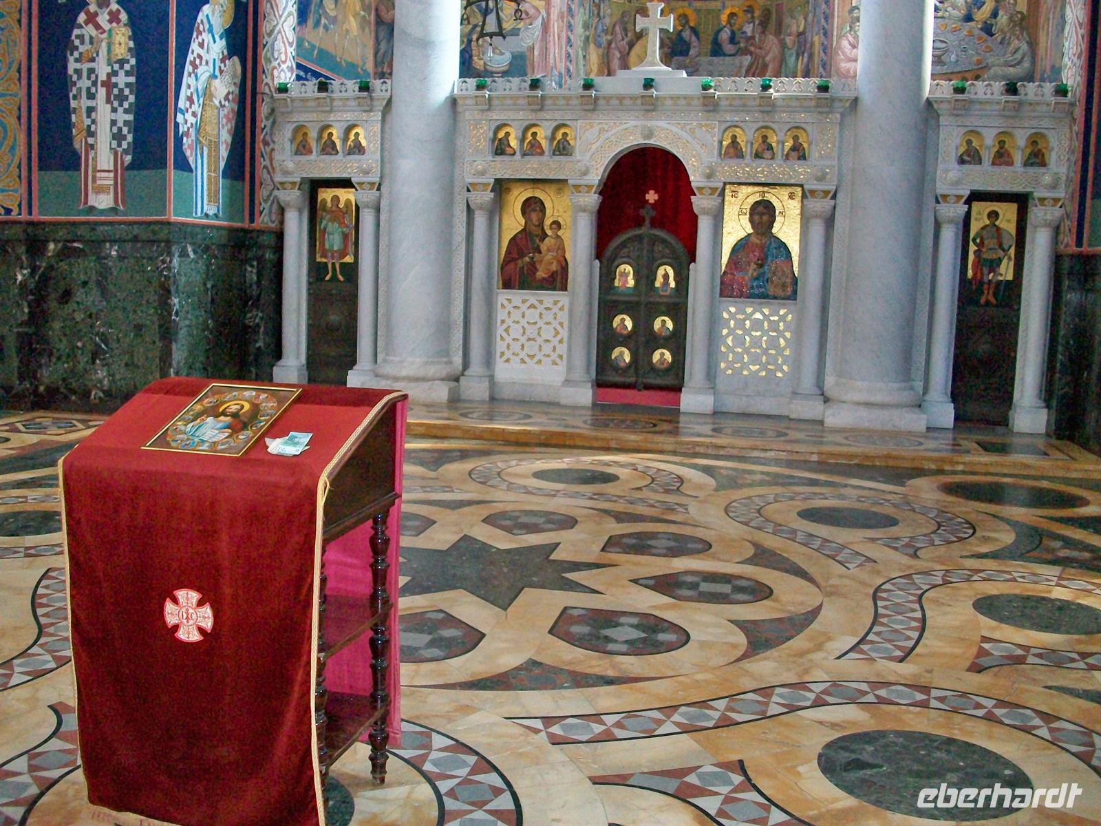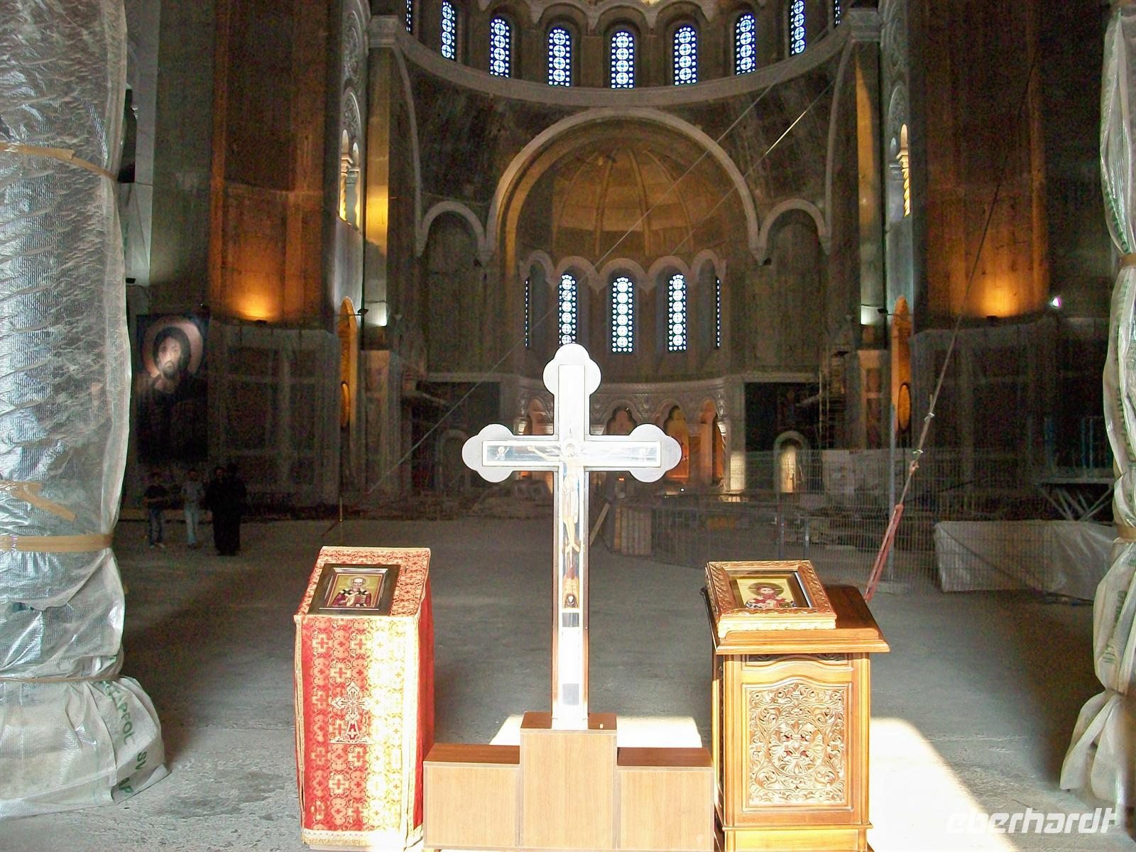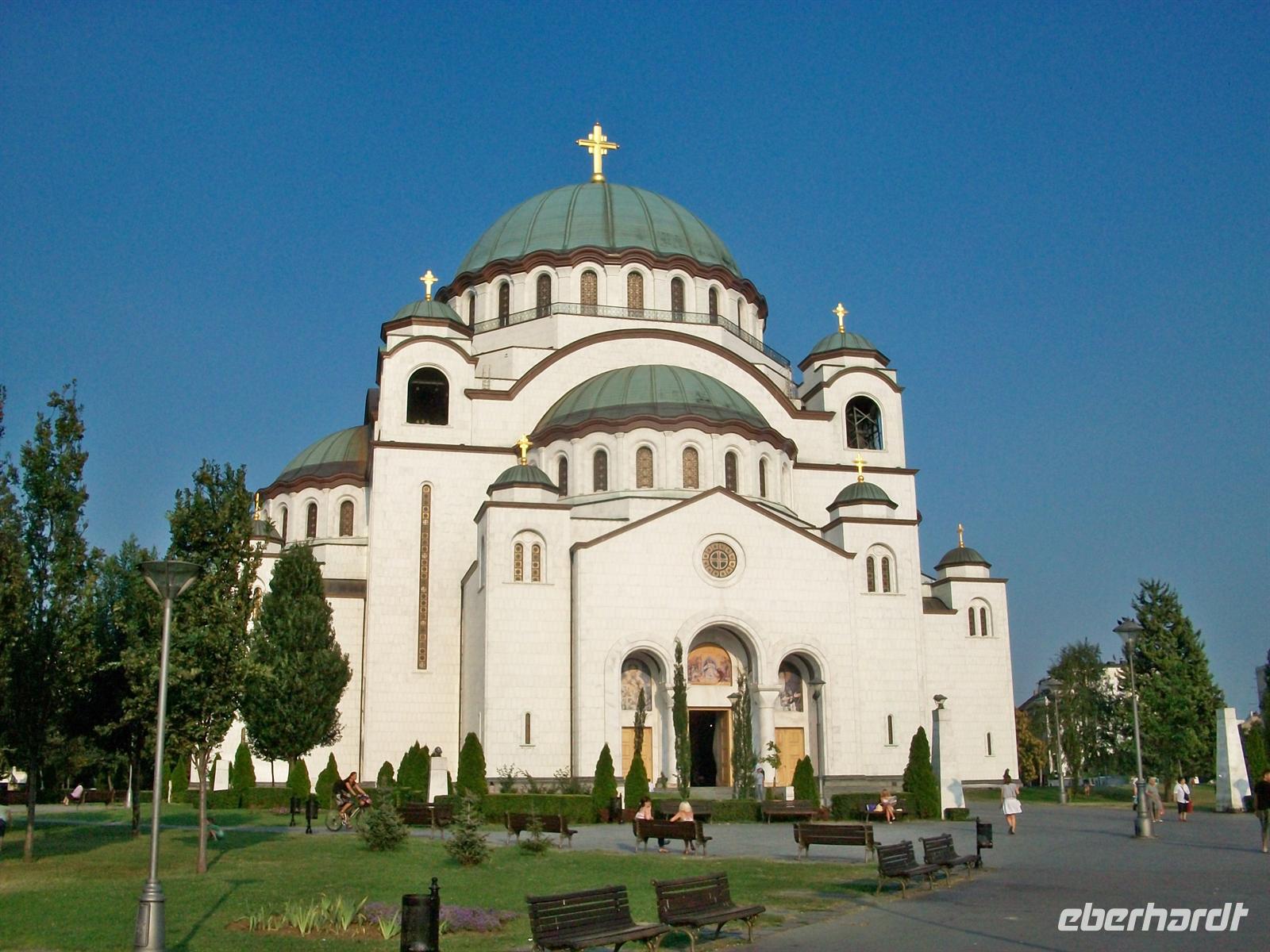 Am Aussichtspunkt vorbei von dem man weit ins Land schauen kann und den Zusammenfluss von Save und Donau sieht, gehen wir in großem Bogen zur Hauptfußgängerzone der „Kneza Mihaila“. Es ist ein schöner und sehr warmer Tag in Belgrad, alle Cafes und Restaurants haben die Stühle und Tische herausgeräumt an denen ein munteres Volk sitzt und den Nachmittag genießt. Auch wir machen hier eine Pause, ein Kaffee tut gut und an der nahen Wechselstube kann auch Geld getauscht werden, die Währung hier in Serbien ist der Dinar. Dann geht es mit dem Bus zu einem ganz wichtigen Wahrzeichen Belgrads, der Kirche zum heiligen Sava. Das ist ein gigantischer Kuppelbau in der typischen Architektur der orthodoxen Kirchen, leider im Inneren noch nicht fertig gestellt, trotzdem sehr sehenswert.
