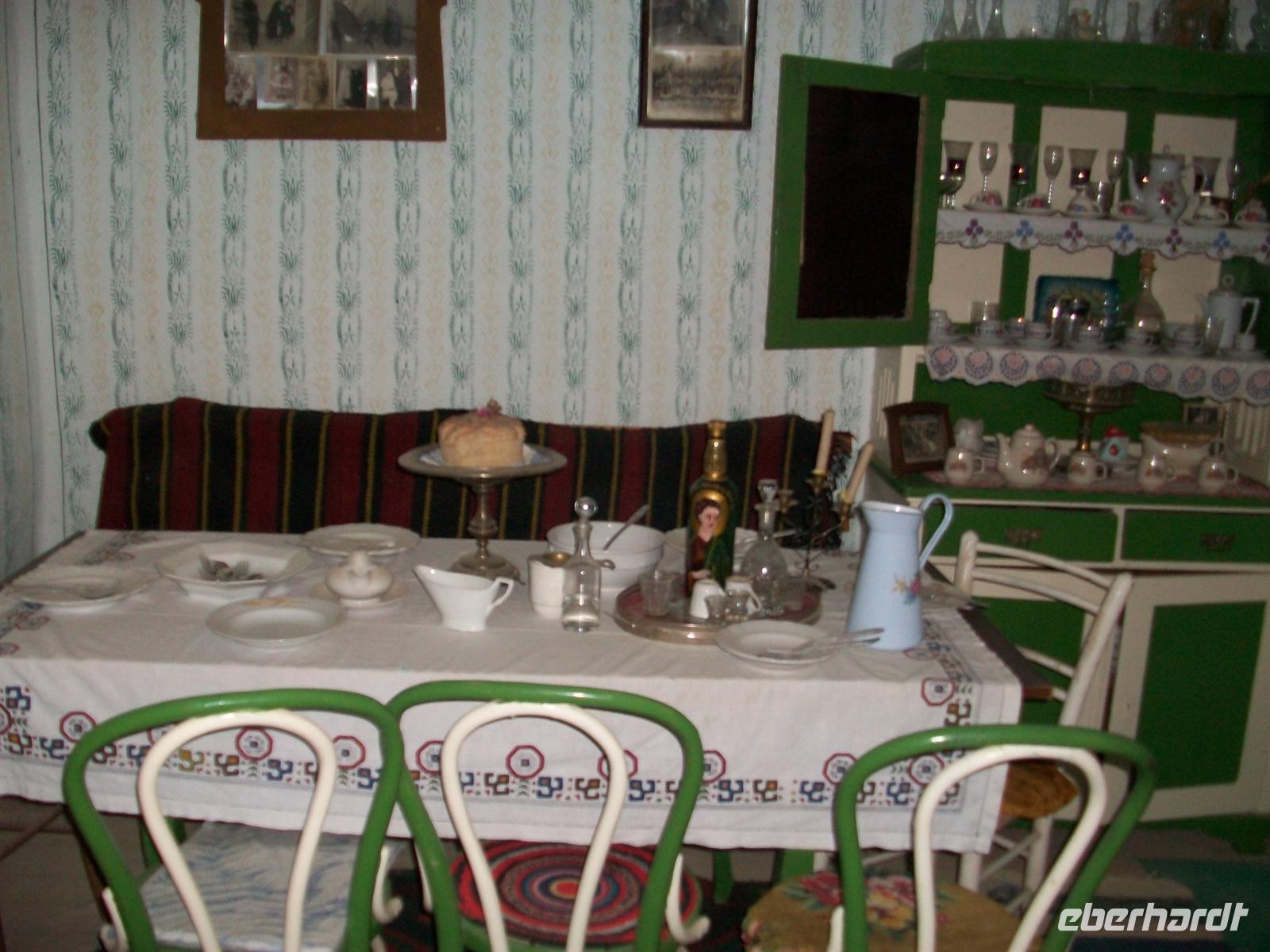 Und dann begeben wir uns auf eine Zeitreise in das bäuerliche Dasein der Serben; die Rekonstruktion des Dorfes zeigt uns alle Aspekte dieses Lebens. Wir schauen in die Wohnhäuser hinein, werfen einen Blick in die Schlafzimmer lernen Küche und Vorratskammern kennen und sehen auch das bescheidene Geschirr dieser Zeit. Vorbei an Heuschobern und Speichern kommen wir zu dem kleinen Museum, welches wir nun besuchen werden. Wir sind hier im Ethnodorf die einzige Gruppe und diesen schönen Nachmittag können wir in größter Ruhe genießen; nach dem Rundgang verbleibt noch Zeit für individuelle Erkundungen.