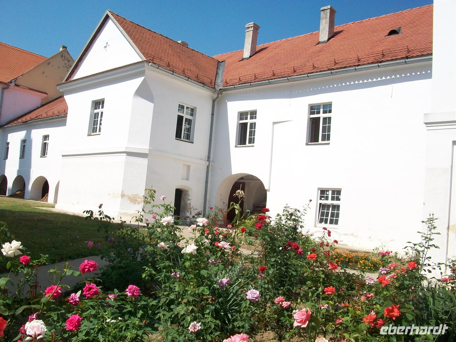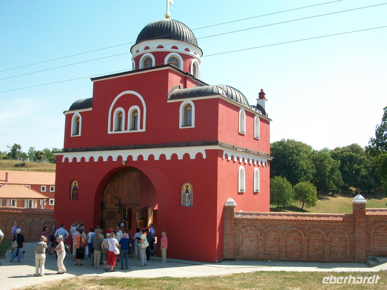 Kloster ´ia angekommen. Auch hier sticht die typisch dunkelrote Farbe ins Auge; das Gebäude wurde sehr wehrhaft angelegt, oft brauchte man eine effektive Verteidigung gegen die Osmanen. Wir besuchen die Kirche, bummeln durch die sehr schöne Gartenanlage und fügen hier einen weiteren Edelstein unserer Balkanreise hinzu.