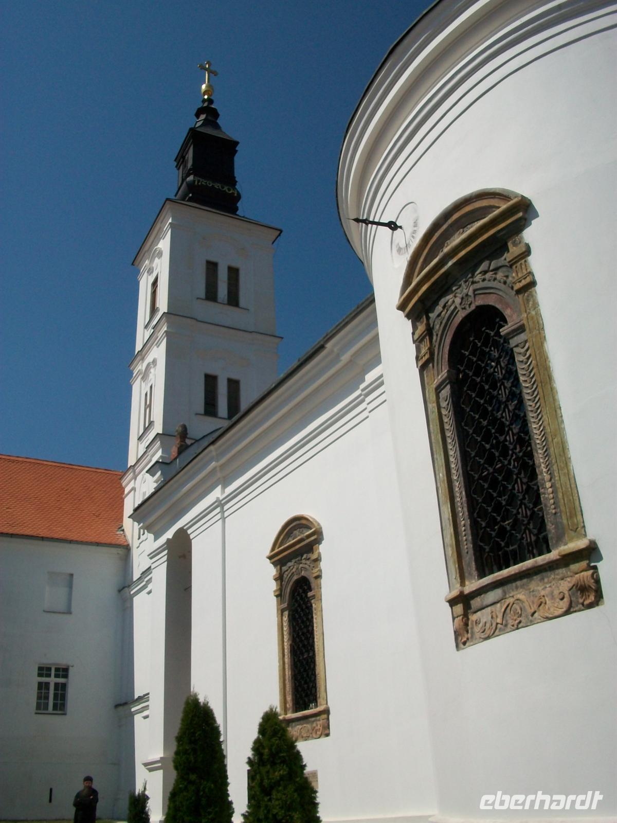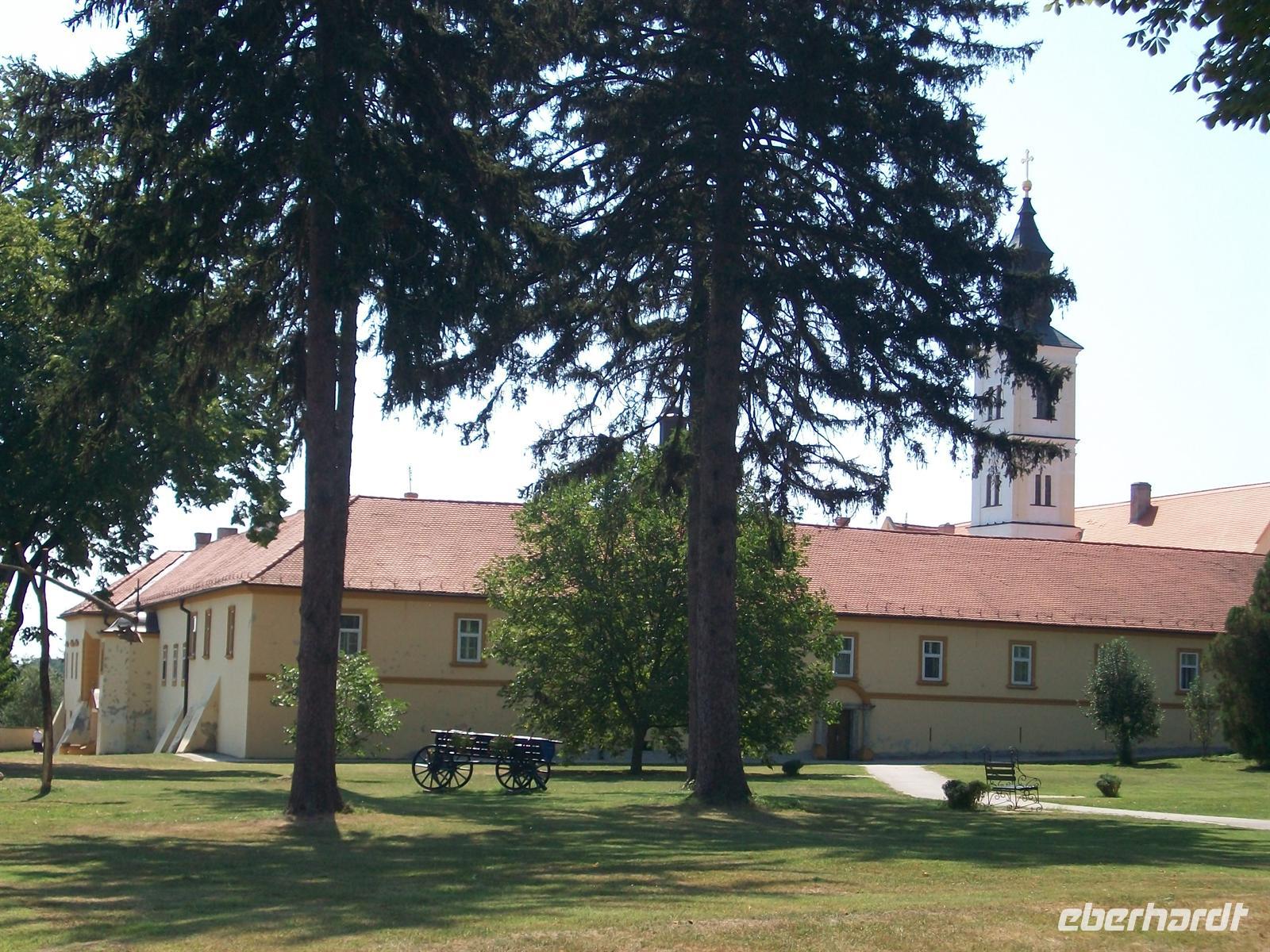 Doch unser Programm geht weiter, nach dieser bäuerlichen Impression wollen wir uns das religiöse Leben hier anschauen- wir besuchen das Kloster Krušedol. Es befindet sich am Fuße des Nationalparks „Fruška Gora“ und ist ein kleines Juwel. Es hat die typisch dunkelrote Farbe, Bogdanka wird uns auf dieser Tour erstmalig mit der serbischen Orthodoxie vertraut machen. Sehr gepflegt ist der Innenhof mit schönen Gärten, in der Kirche werden die letzten Vorbereitungen zu einer Hochzeit getroffen. Nachdem Bogdanka gefragt hat gibt uns der Geistliche die Genehmigung dieser Eheschließung beiwohnen zu können; ein Ereignis das von uns wohl noch keiner in dieser Form gesehen hat. Am Ende der Zeremonie wird dem