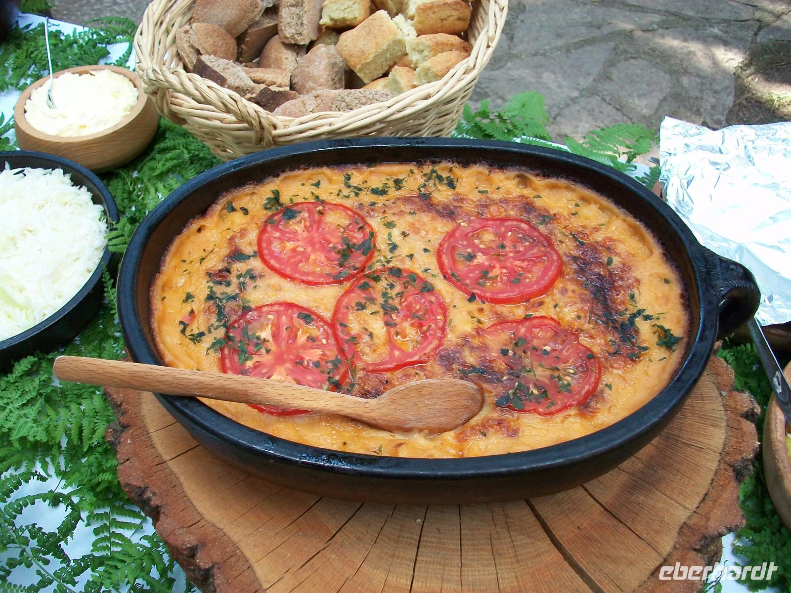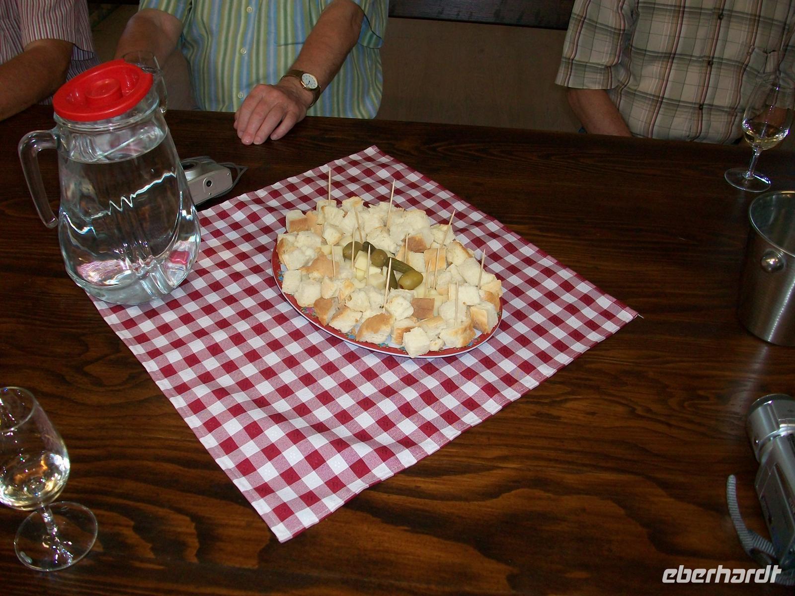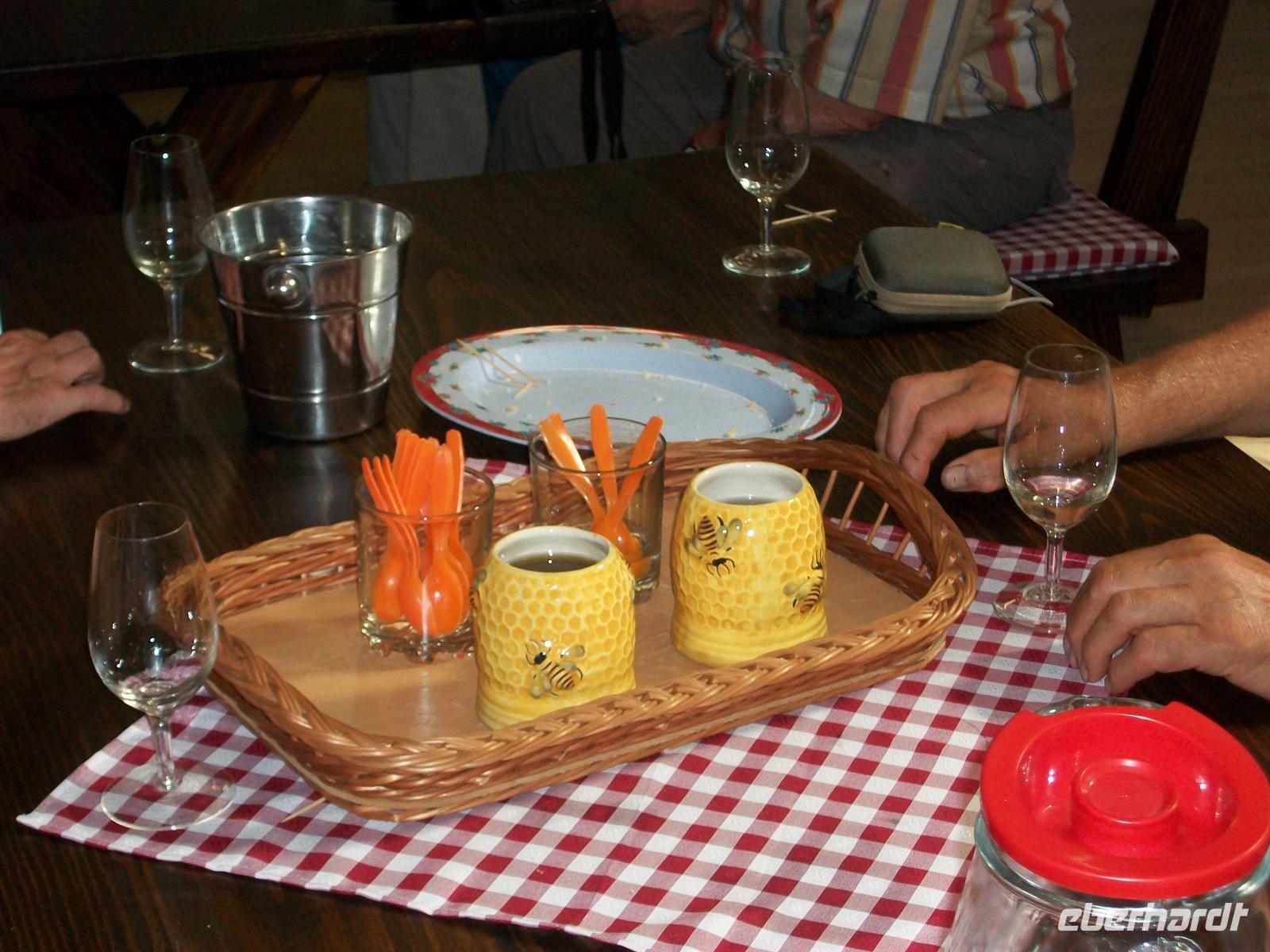 Nach dem Besuch von Topola sind wir nun auf sehr abenteuerlichen Wegen unterwegs zu unserem Restaurant um unser Mittagessen einzunehmen. Über schmale Hohlwege inmitten unberührter Landschaft erreichen wir gegen 12.50 Uhr das Lokal. Hier werden wir ganz authentisch mit dem balkanischen Lebensgefühl vertraut gemacht. Wir sitzen auf der halboffenen Veranda, eben werden die großen runden Weißbrote aus dem Backofen geholt um dann gleich, noch dampfend, auf unseren Tischen zu landen. Die Speisen sind typisch für die Region, es gibt einen leckeren Vorspeiseteller mit Schinken, Käse, Kajmak (eine Art Frischkäse) und Salat. Dann werden uns auf Tellern Kartoffeln und Fleisch serviert welches unter der Gussglocke gedünstet wurde und dadurch einen besonders delikaten Geschmack bekommt. Den Abschluss bilden dann leckere Süßspeisen und ein türkischer