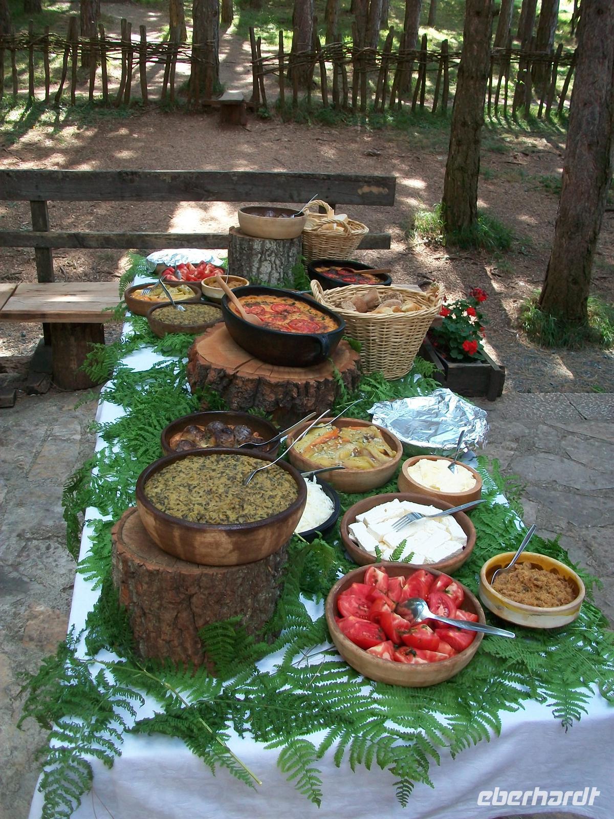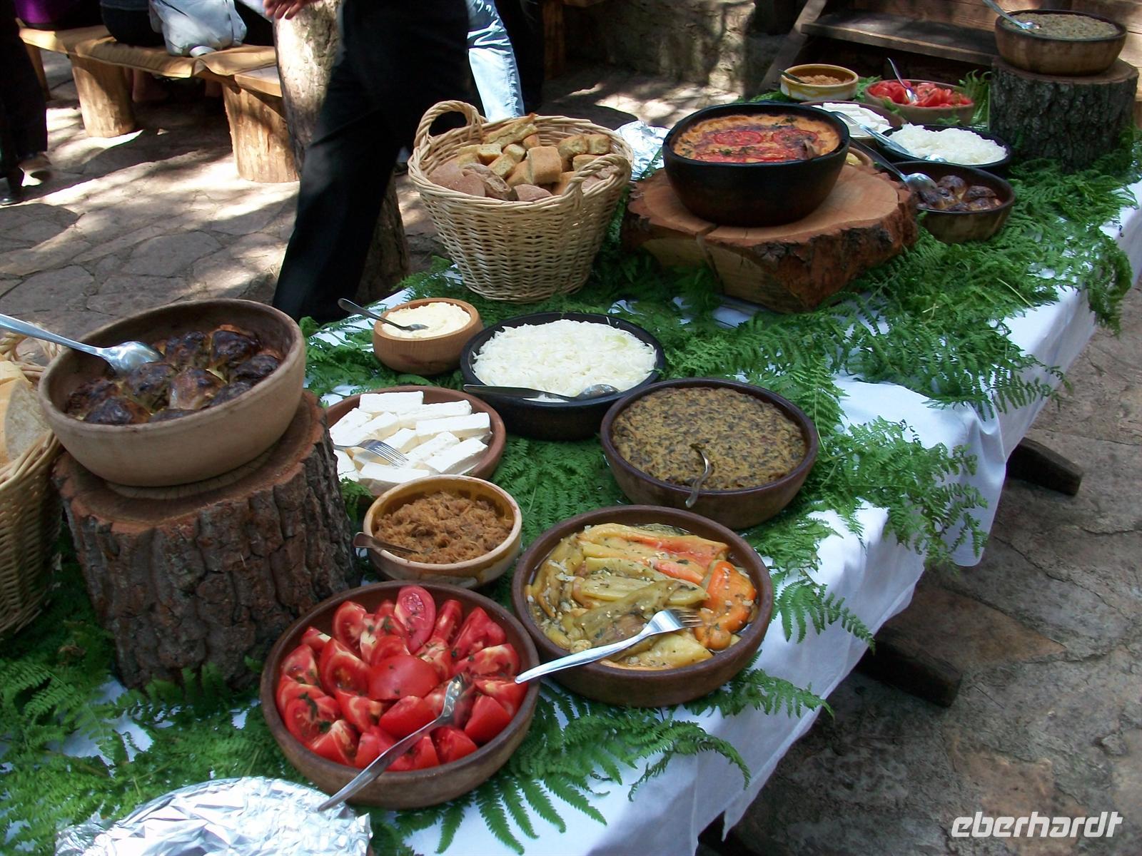 Dieses Gebirgsdorf ist komplett aus den für die Gegend typischen Holzhäusern rekonstruiert worden, mit sehr viel Liebe zum Detail. Es ist wieder sehr sonnig und zuerst gehen wir zu unserem Mittagessen welches auch heute leckere Spezialitäten der Region zu bieten hat. Mitten im Wald, vor einem urigen Restaurant, ist für uns ein Buffet im Freien vorbereitet. Bogdanka stellt uns die einzelnen Speisen vor und dann genießen wir dieses Essen inmitten dieser herrlichen Natur. Die würzige Luft hat uns den nötigen Appetit beschert und die Vögel des Waldes geben ein Gratis-Konzert zu unserem Mittagsmahl.