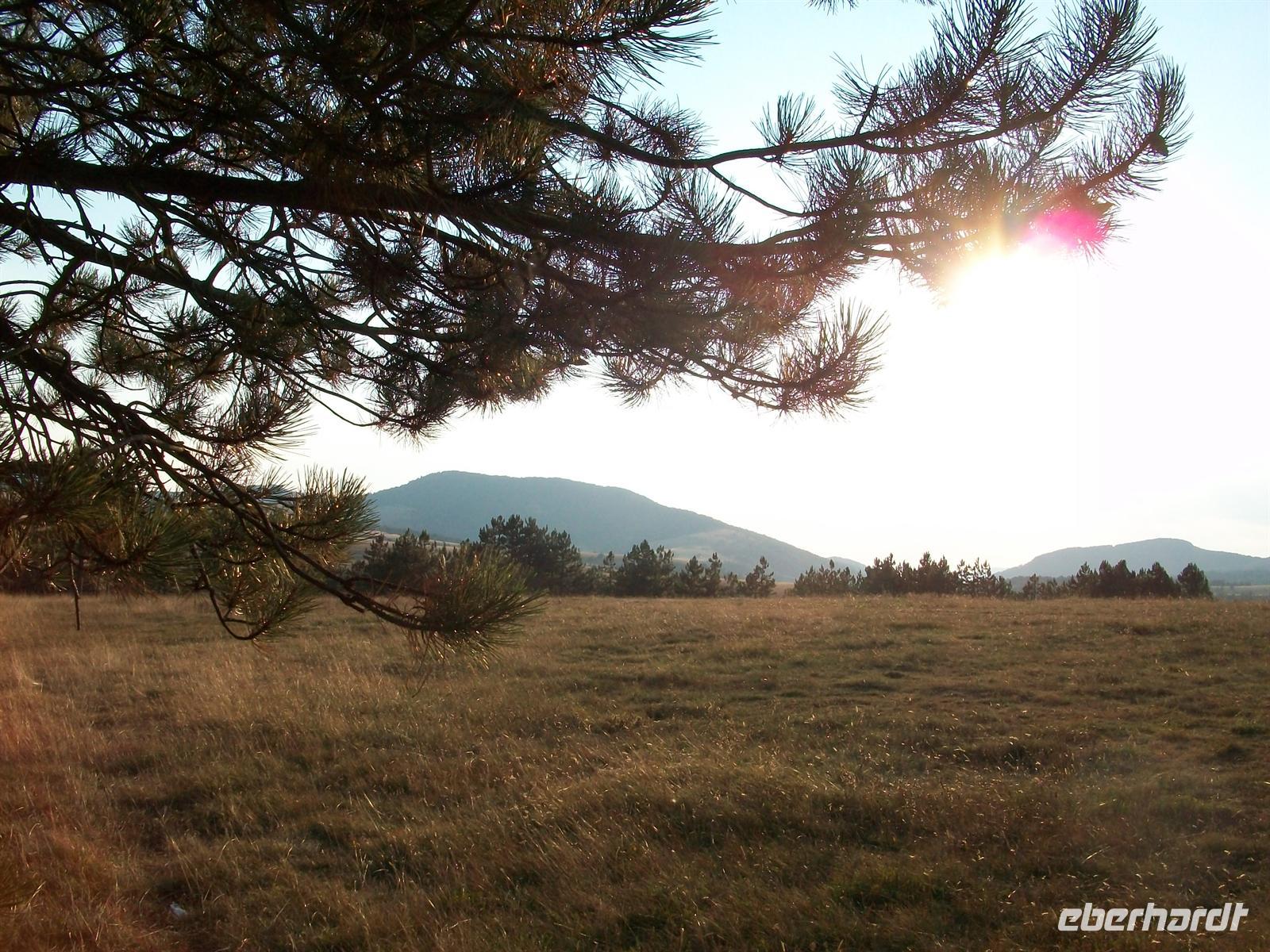 wenig Bummeln zu gehen. Es ist wieder ein sonniger Tag, aber hier oben angenehm frisch, ein kühler Wind durchweht den Wald, an einer Lichtung im Südwesten hat man einen schönen Blick auf das weite Land und die Weinberge.