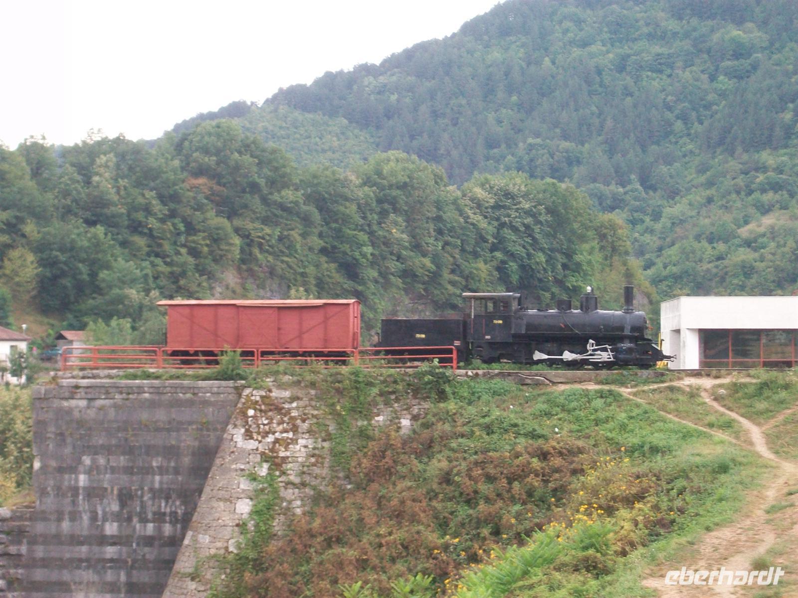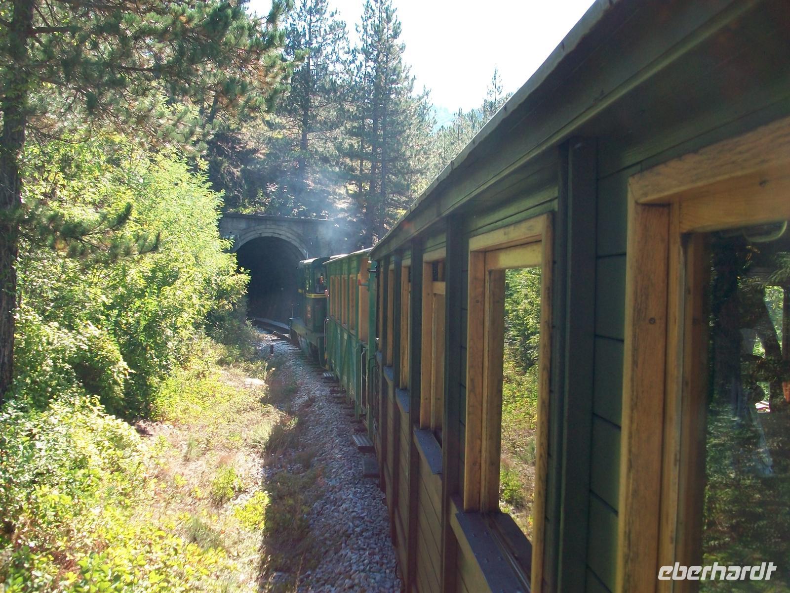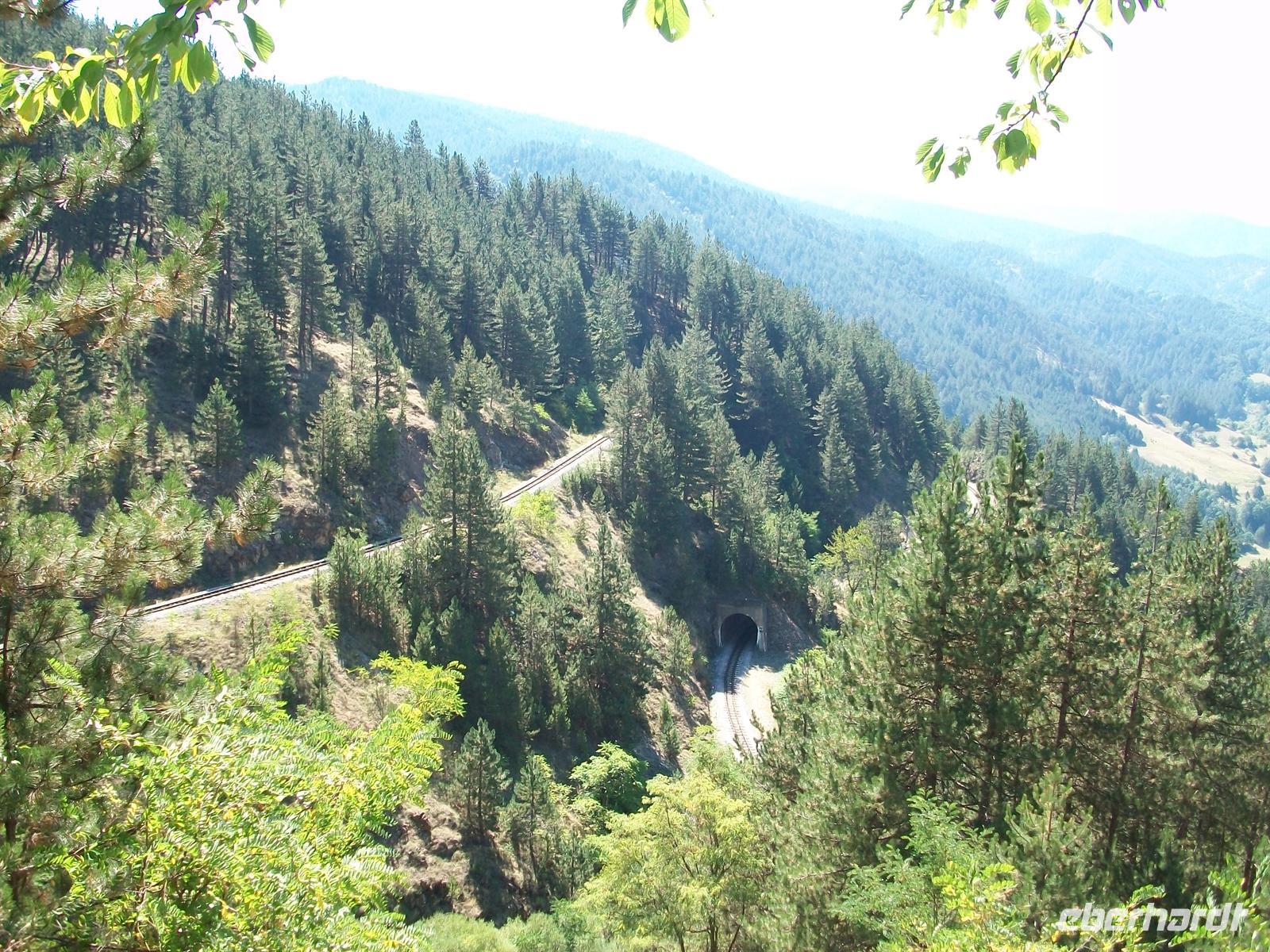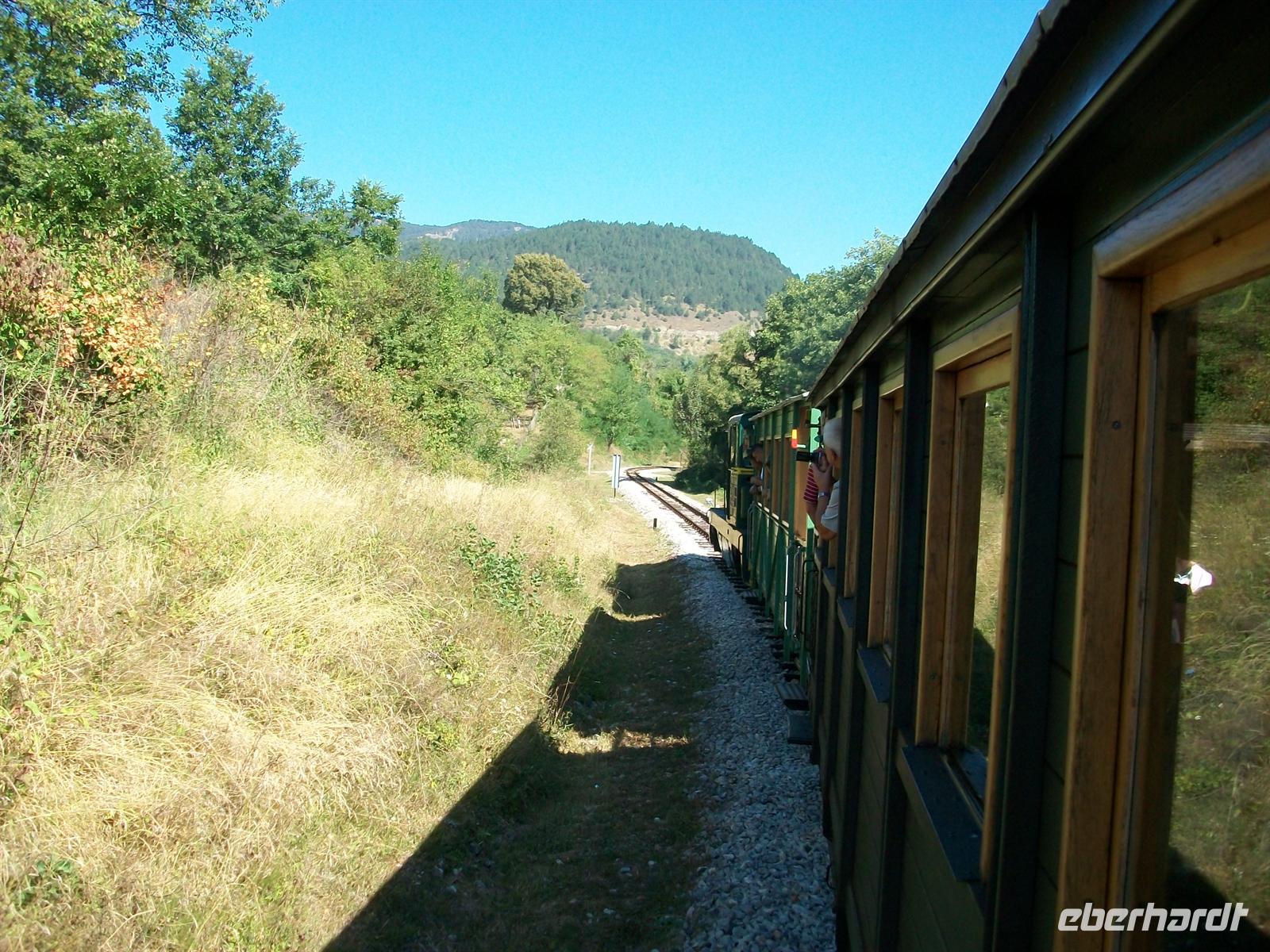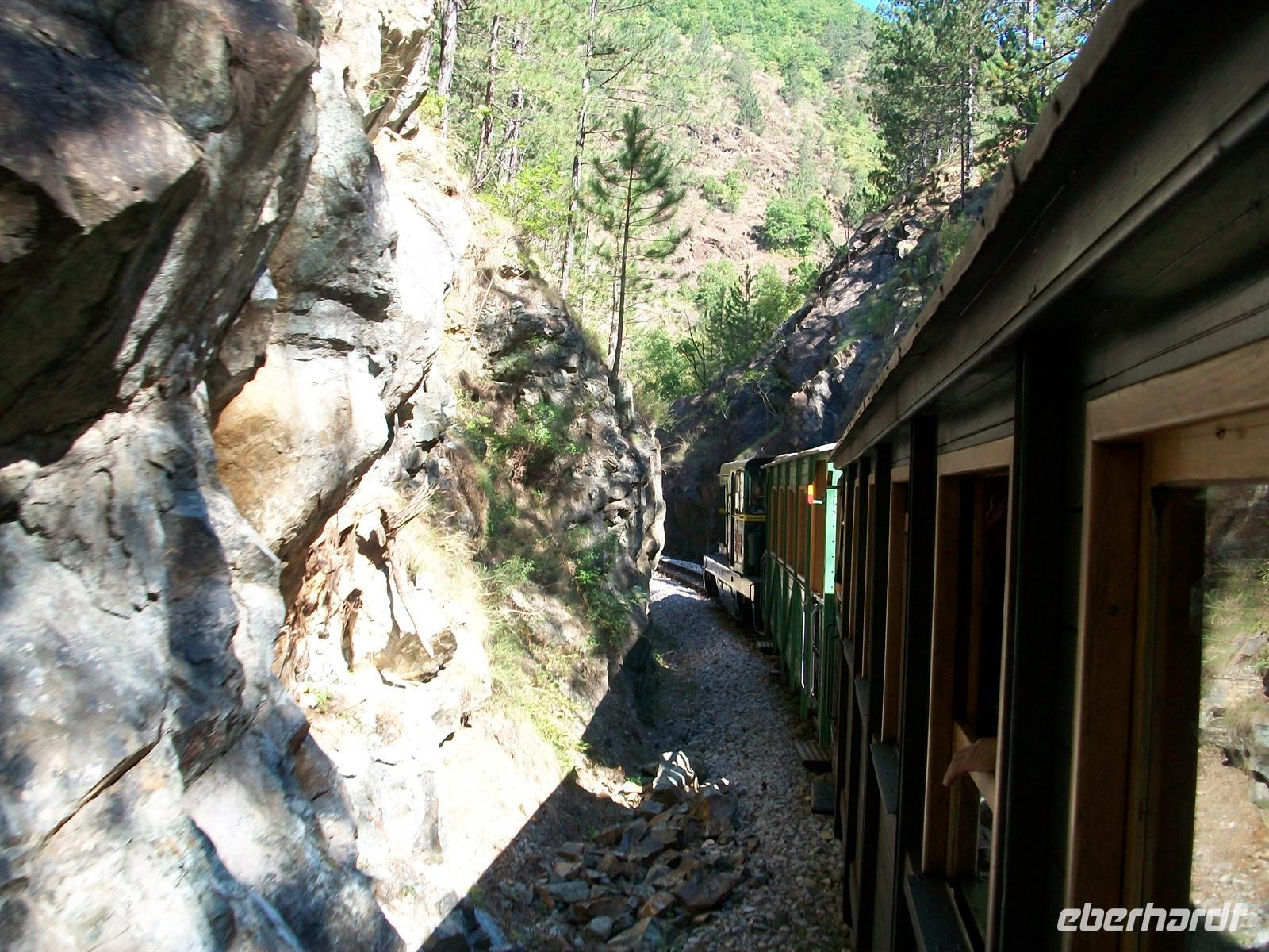 erschrillt das Pfeifsignal und mit einem Ruck geht die abenteuerliche Bahnfahrt in den Schluchten des Balkan los. Sehr abwechslungsreich ist die Fahrt, mal im dichten Wald, dann wieder hoch über dem Tal, durch schmale in den Fels gesprengte Passagen und hinein in dunkel gähnende Tunnelschlünde, es ist ein Wechselspiel der interessantesten Eindrücke. Am oberen Endpunkt Šargan Vitassi wird die Lok umgespannt und dann geht es wieder abwärts. Beim Hinunterfahren gibt es an den besonders schönen Punkten Stopps von denen man weit ins wilde Land hineinschauen kann und über die Unberührtheit der Natur staunt.
