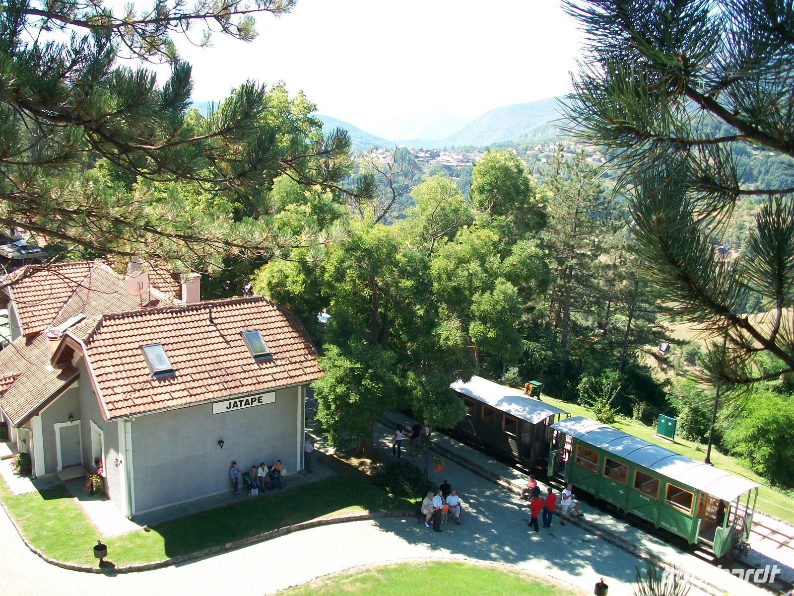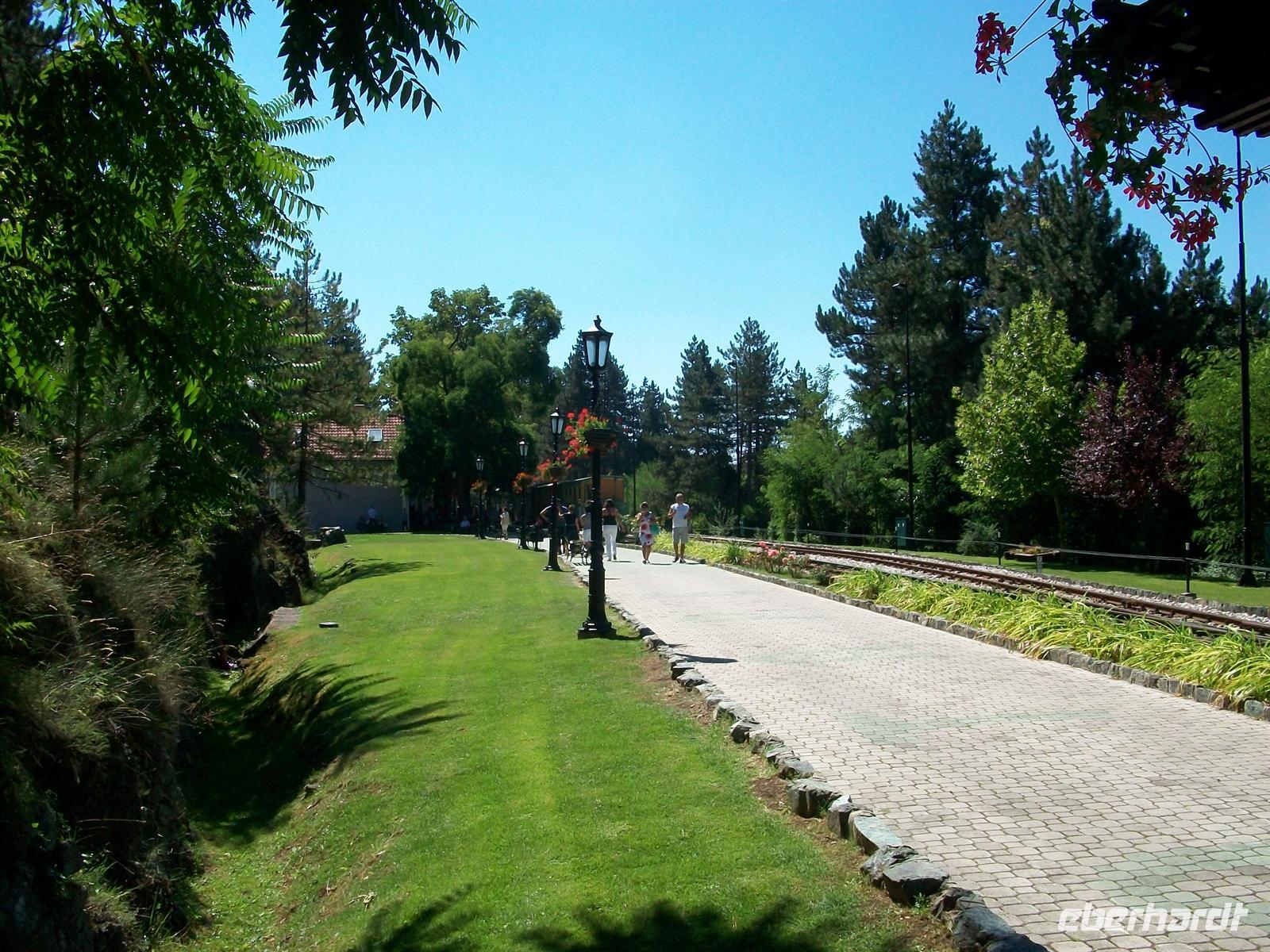 An einem Zwischenbahnhof legen wir eine halbstündige Pause ein, genügend Zeit für einen Kaffee und dem Besuch des Aussichtspunktes innerhalb der sehr gepflegten Bahnanlagen. Dann geht es weiter und 13.00 Uhr endet diese einmalige Eisenbahnfahrt wieder in Mokra Gora.