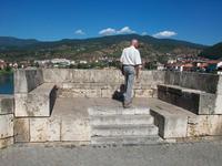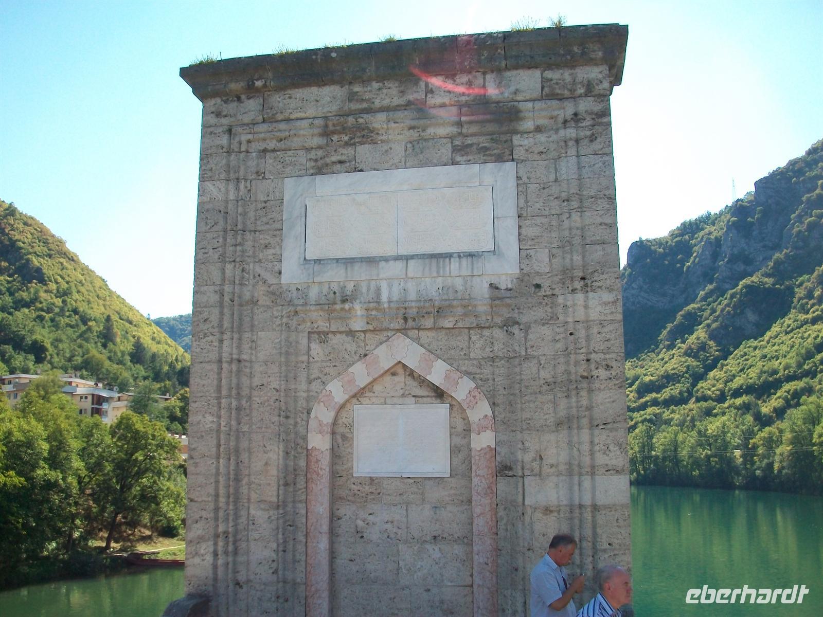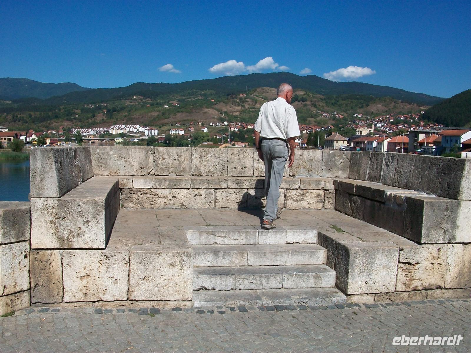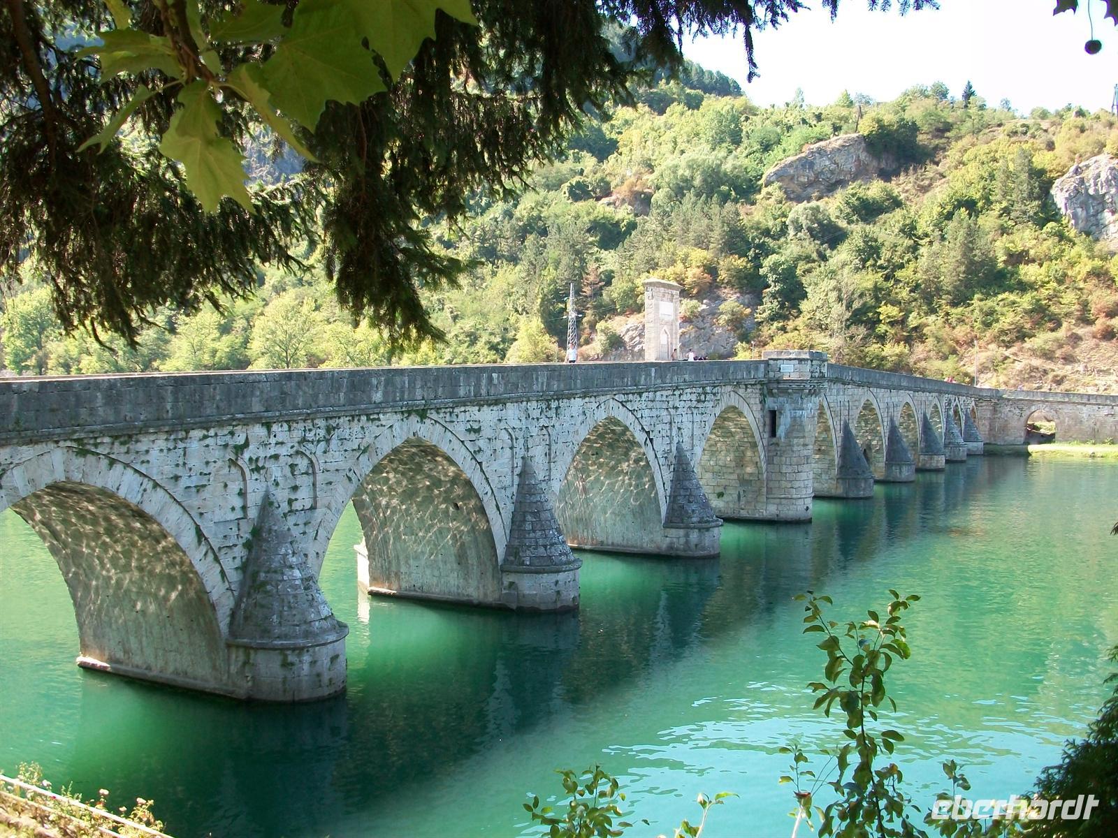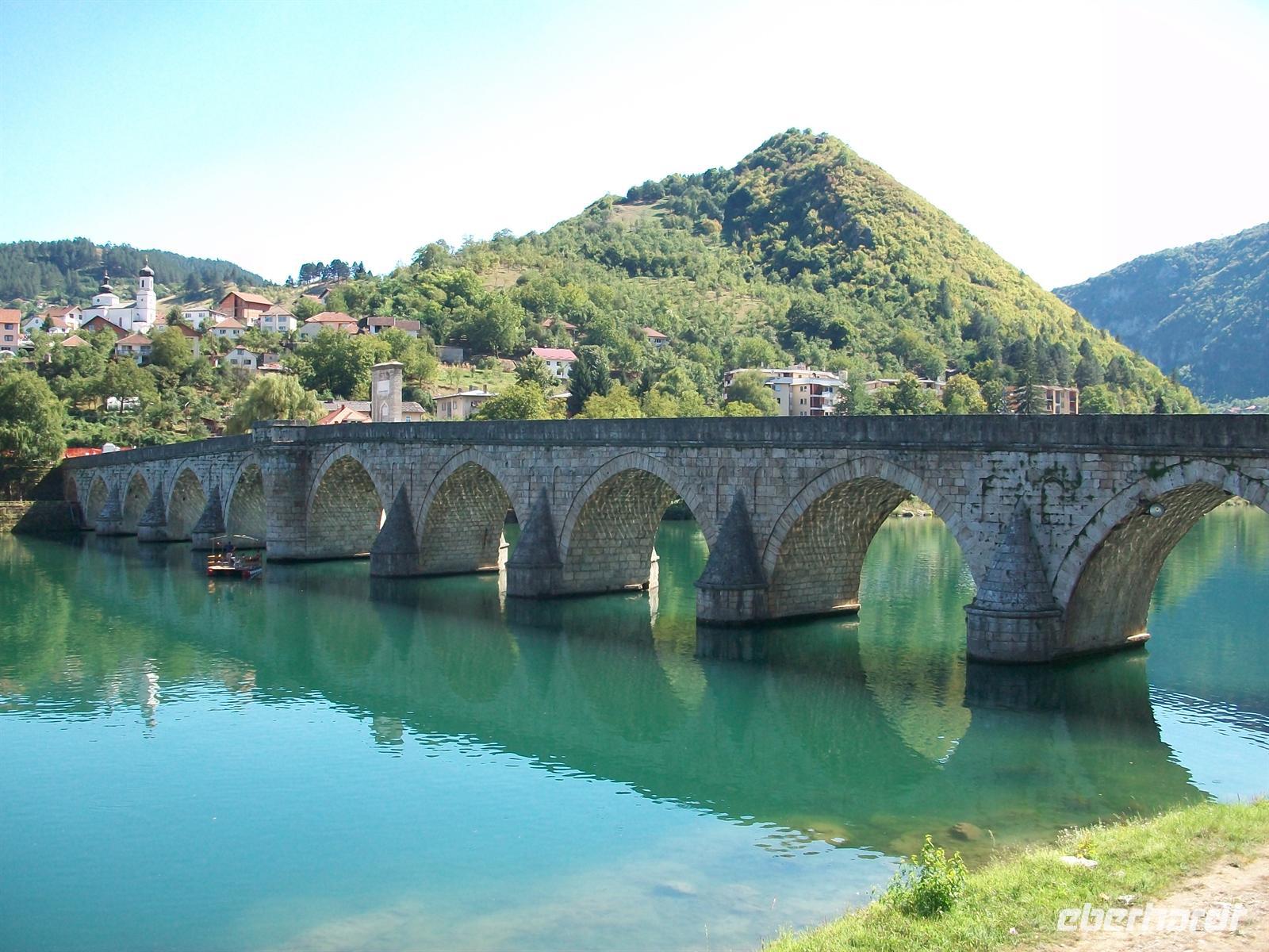 unterwegs. Der Ort, den wir jetzt besuchen werden, hat mit seiner Brücke Literaturgeschichte geschrieben- Višegrad. Eine knappe halbe Stunde später sind wir da und zu Fuß auf dem Weg zu diesem Bauwerk. Ivo Andri verfasste 1945 das Buch „Die Brücke über die Drina“ in dem er das schwierige Zusammenleben der verschiedenen Volksgruppen mit ihren Sorgen und Nöten, Liebe und Hass in einer Intensität beschrieb, die es in sich hat. Die Ereignisse in den 1990er Jahren haben diese Fiktion erneut bestätigt, die Probleme von denen Andri schrieb schienen überwunden zu sein doch die nationalen Konflikte blieben bestehen. Trotz allem, es ist doch etwas Besonderes hier zu stehen, zumal das Leben heute (2011) ein Friedliches ist. Die Lage der Brücke ist sehr schön, die grünlichen Wasser der Drina widerspiegeln die nahen Berge. Wir überqueren langsam die Brücke und erkennen auch all diese Stellen wieder die Andri beschrieb. Am gegenüberliegenden Ufer erwartet uns der Bus, von hier hat man noch einmal einen schönen Blick hinüber zum Ort mit seinen Gebäuden und Minaretten der Moscheen.