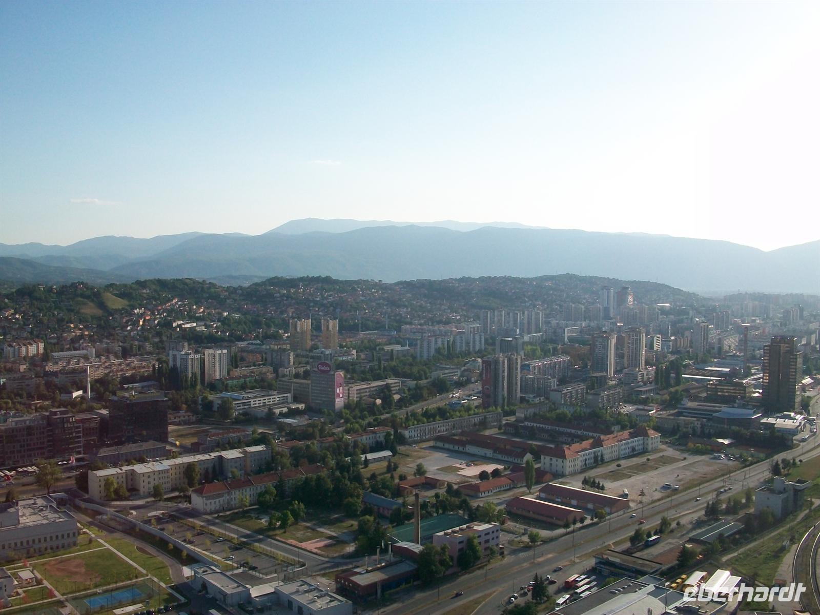 Gegen fünf sind wir im Großstadtverkehr von Sarajevo angekommen. In der Nähe des Hauptbahnhofes, fast im Zentrum der Stadt, befindet sich der hypermoderne Büroturm „Twist-Tower“ zu dessen Spitze ein Aufzug hinaufführt. Diese Auffahrt mit einem grandiosen Blick auf die Hauptstadt von Bosnien- Herzegowina ist eine kleine Überraschung die ich unserer „Eberhardt“ Reisegruppe bringe und sie soll auch auf den morgigen Tag einstimmen, an dem wir diese interessante Stadt kennenlernen werden.