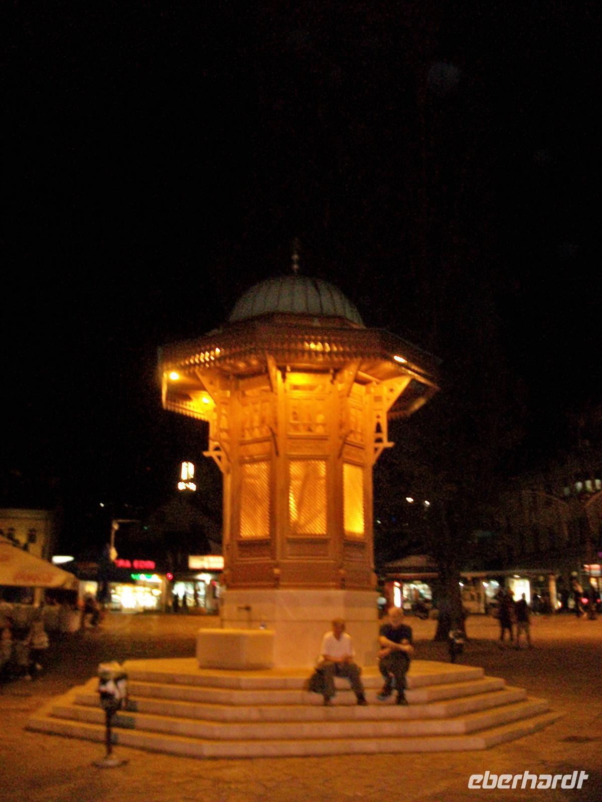 Nach dem Zimmerbezug gehen wir zu Fuß durch den ältesten und schönsten Teil von Sarajevo- Bašaršia. Wie in den Märchen aus Tausend- und- einer- Nacht erscheint uns dieser durch und durch orientalische Teil mit seiner magischen Beleuchtung, den Cafes vor denen Einheimische Wasserpfeife rauchen und den Souvenirhändlern die rätselhafte Gegenstände feilbieten. In einer Seitengasse dieses exotischen Treibens befindet sich das Restaurant im osmanischen Stil „Pod Lipom“, deutsch: „Unter der Linde“, hier werden wir heute zu Abend essen, also wiederholt im authentischen Ambiente. In solch schönen Lokalitäten