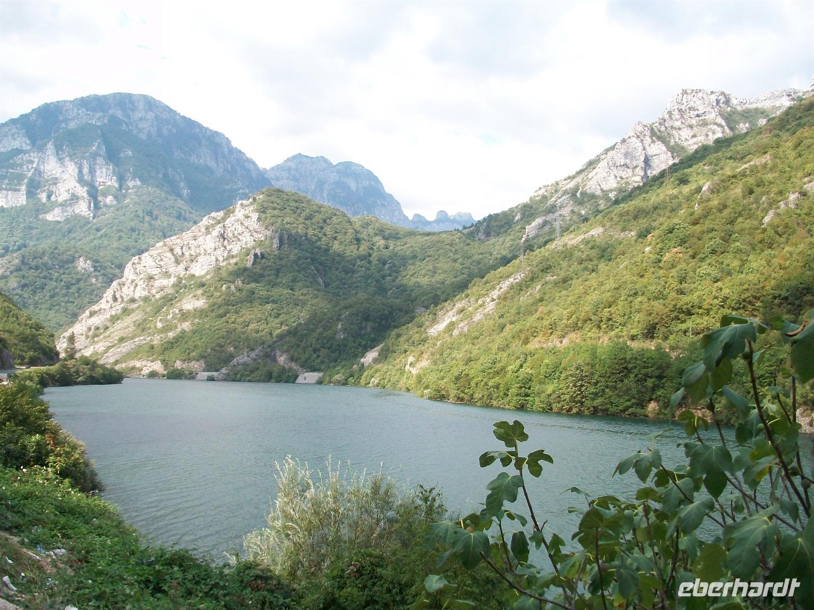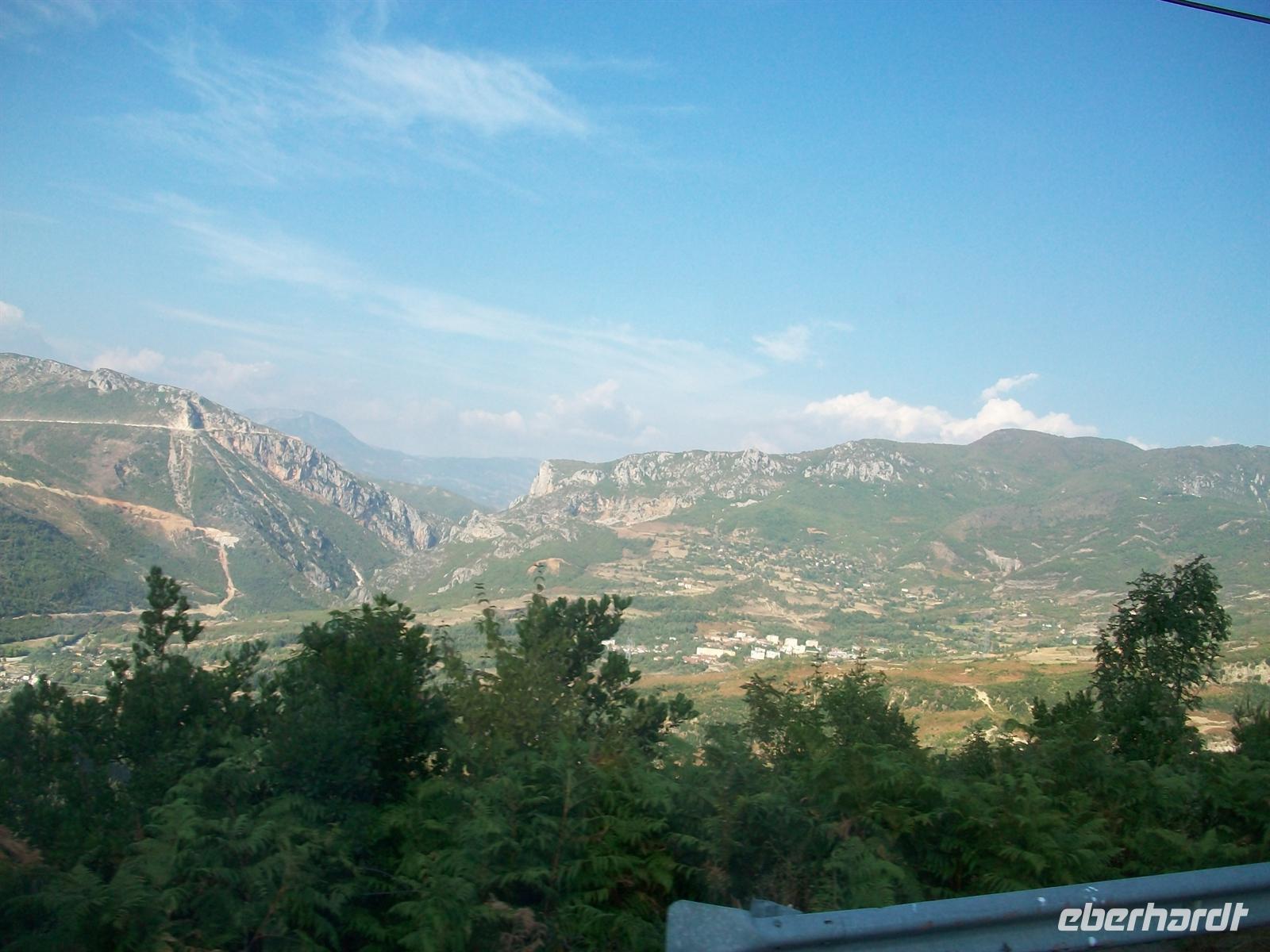 Wir haben halb vier Tirana verlassen, es war sehr heiß in der Stadt und nun sind wir im gebirgigen Hinterland unterwegs. Wir fahren in Richtung Elbasan und sind auf dem Weg zu einem Pass. Hoch türmen sich die Berge auf und unter uns sind weite Täler und schroffe Schluchten zu sehen. Es ist schon ein wildes Bild welches sich vor unseren Augen ausbreitet. Tief unten im Tal sind die Industrieanlagen des Stahlwerkes von Elbasan zu sehen. Hier wird heute kaum noch etwas produziert und die Riesenanlage macht keinen schönen Eindruck. Wir fahren in Serpentinen hinunter, durchqueren den Ort Elbasan und sind bald wieder in der unberührten Natur des Balkangebirges unterwegs. Wir fahren die wilde Schlucht aufwärts die hier vom Fluss Shkumbin gebildet wird, es ist auch eine Scheidelinie in Albanien selbst zwischen Nord und Süd, auch eine Sprachgrenze bildend. Die Nordalbaner sind mit ihren uralten Traditionen noch viel mehr