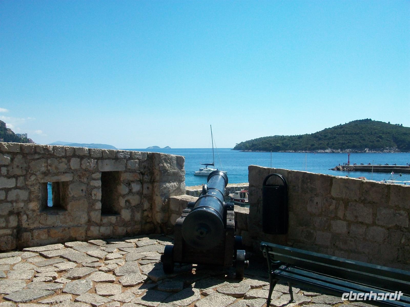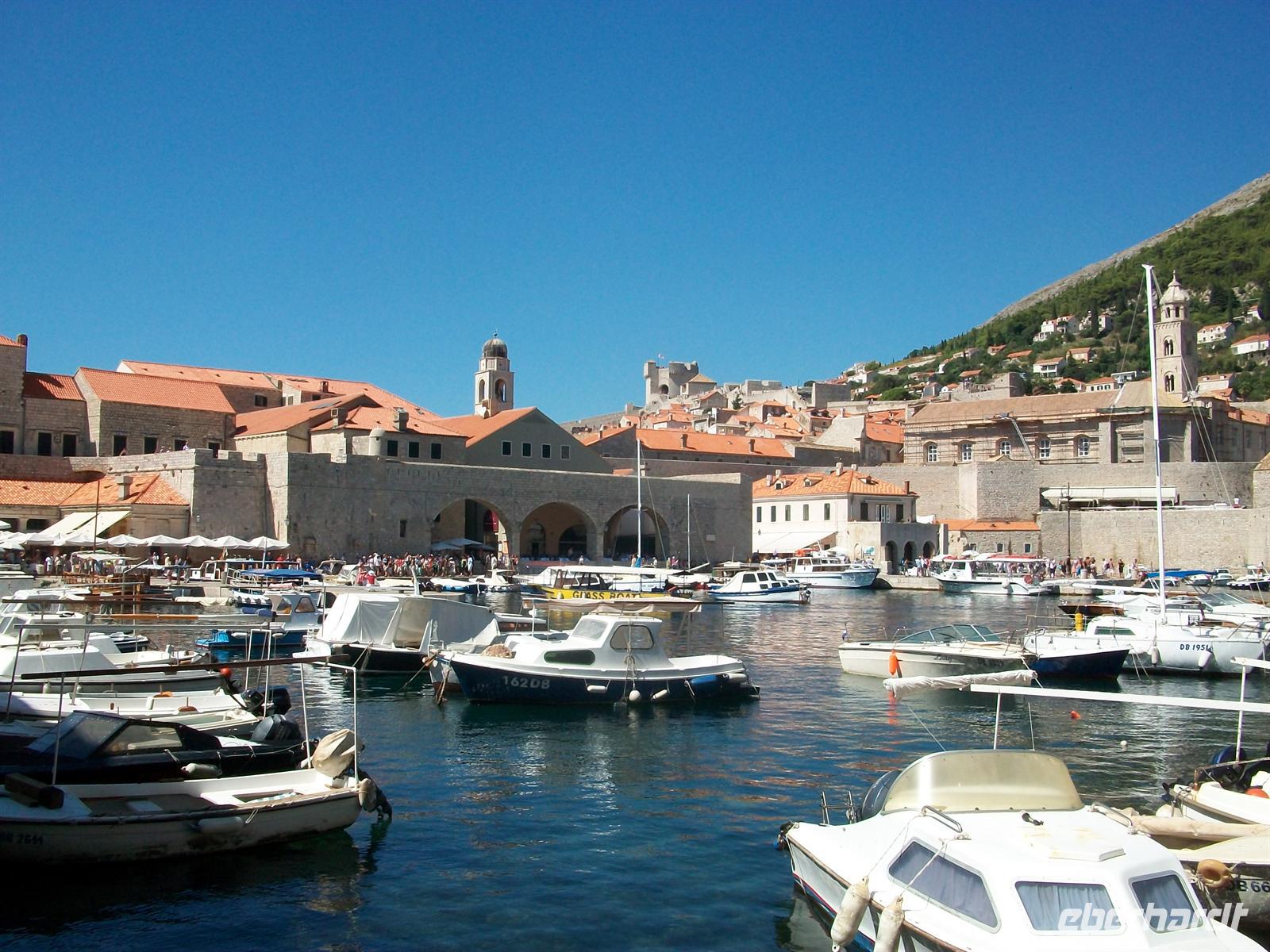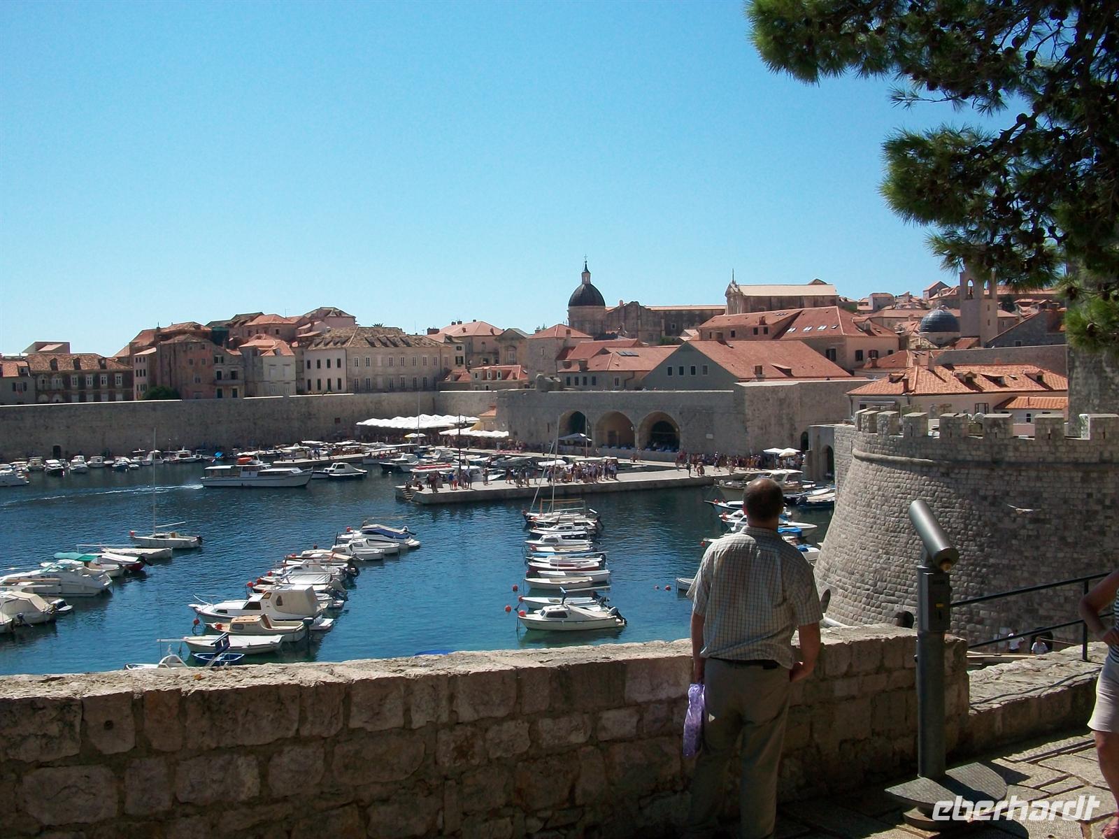 8.15 Uhr. Wir sind gestartet und auf dem Weg zur kroatischen Grenze. Nicht weit und wir sehen nach einem Bergrücken die unermessliche Wasserfläche der Adria. Nach den Formalitäten der Grenze sind wir nun unterwegs zur Perle der Adria- Dubrovnik. Bald taucht die reizvolle Altstadt auf, sie liegt ganz unten auf einer Halbinsel, mit ihren historischen Gebäuden, der Stadtmauer und dem Alten Hafen. Gegen halb zehn kommen wir am sehr belebten Pile- Platz an, hier werden wir von unserem Stadtführer erwartet. In den nächsten 90 Minuten lernen wir nun diese wirkliche Perle kennen. Wir gehen über die Stradun, es ist die Hauptfußgängerzone die an ihrem Ende vom Uhrturm begrenzt wird, schauen in die schmalen