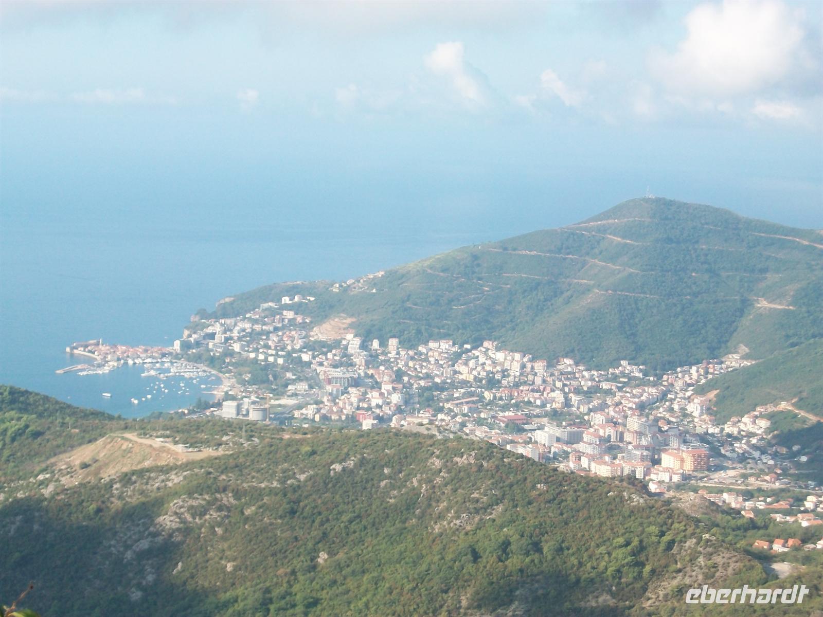 8.9.2011. Unmittelbar vom Strand führt die Straße hinauf in die Berge. Ein schöner Blick hinunter auf den Strand, auf die Halbinsel auf der die Altstadt von Budva liegt und die Karstberge des Küstengebirges begleitet unsere Fahrt. Bald lassen wir die Küste hinter uns und sind im gebirgigen Teil des Landes unterwegs. Auf der linken Seite sind schon die Spitzen des Lovengebirges zu sehen und rechts befindet sich der Skutarisee der allerdings weit entfernt ist und im Dunst verborgen bleibt.