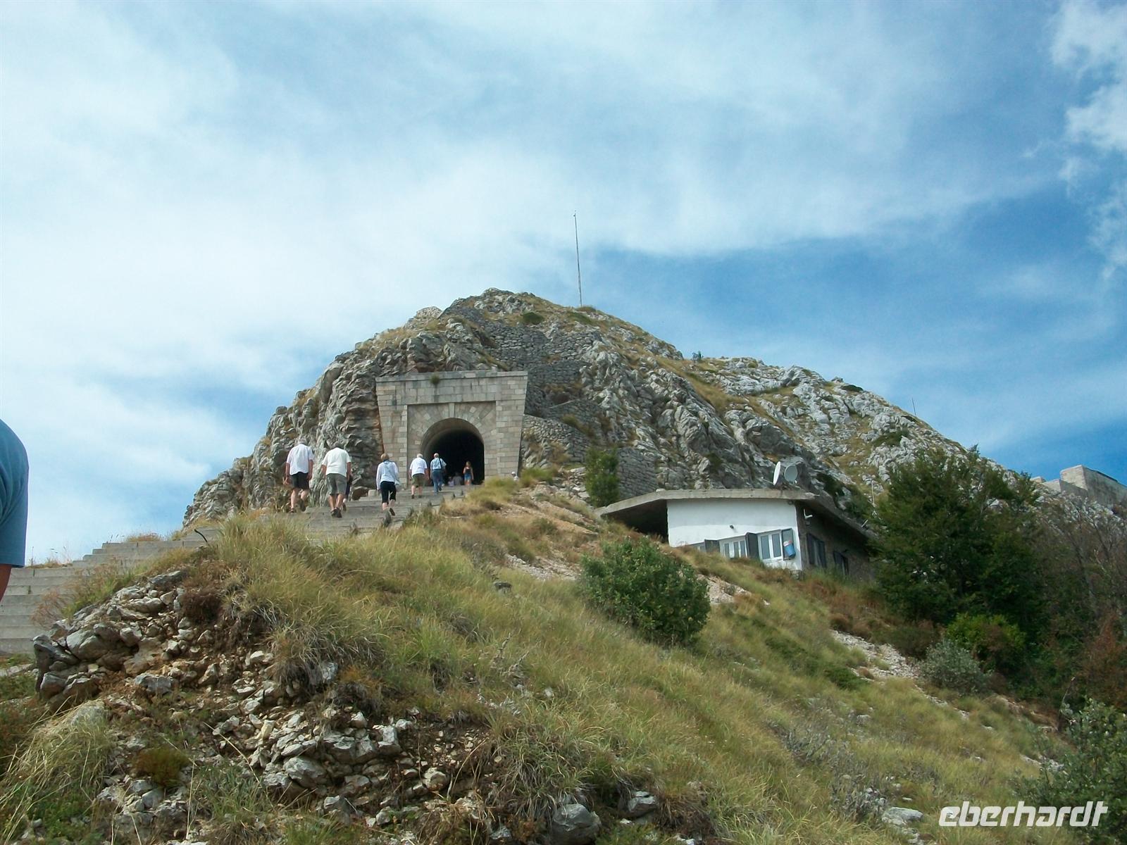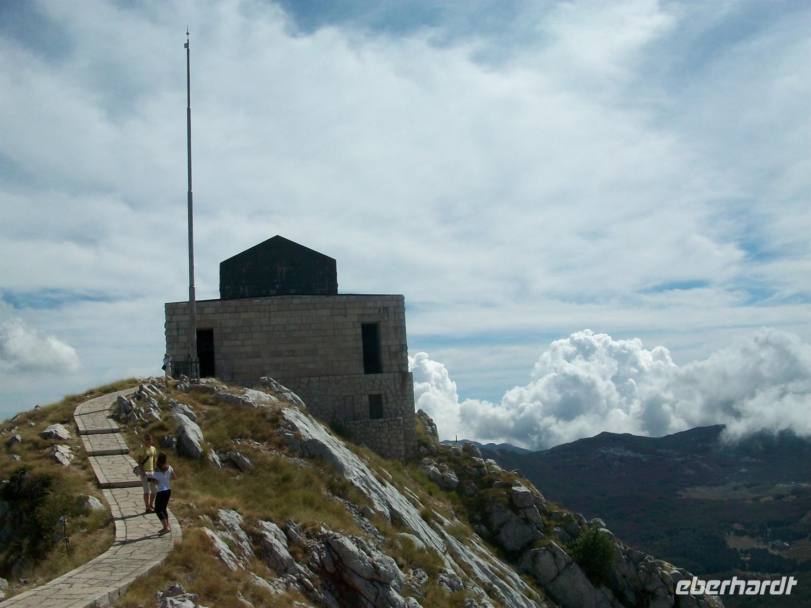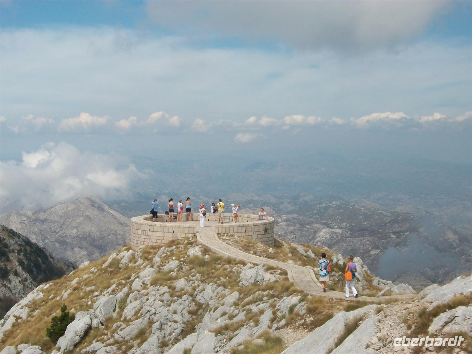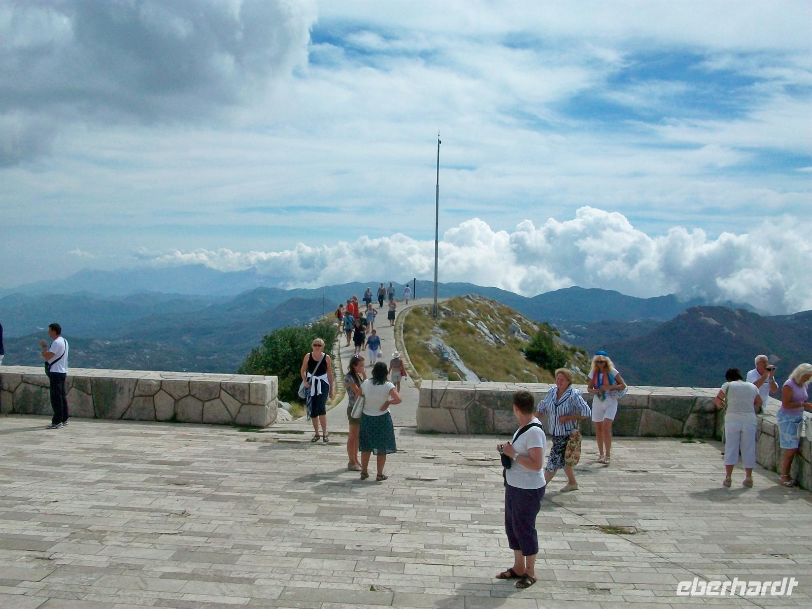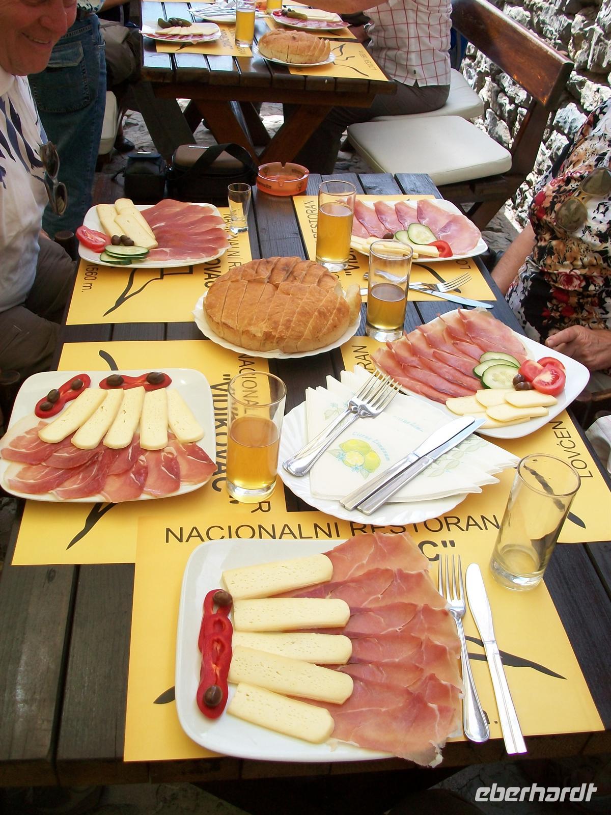 Eine schmale Straße führt hinauf ins Lovengebirge zum höchstgelegenen Mausoleum Europas. Hier oben fand der Dichterfürst Petar 3. Petrovi Njegoš auf eigenem Wunsch seine letzte Ruhestätte welche für die Montenegriner heute Nationalheiligtum ist. Der Herrscher schuf seinerzeit in der Mitte des 19.Jahrhunderts ein modernes Staatswesen und begründete damit auch eine Epoche der Unabhängigkeit. Hoch in den Bergen schuf der bekannte Bildhauer Ivan Meštrovi eine gigantische Tempelanlage zu Ehren des Herrschers die wir uns nun anschauen werden. Die Anfahrt mit dem Bus endet am Restaurant, hier gibt es erst einmal eine Stärkung für uns. Wir werden mit einem Teller überrascht auf dem uns die leckeren Spezialitäten der Region serviert werden: luftgetrockneter Schinken und Schafskäse, dazu lockeres und