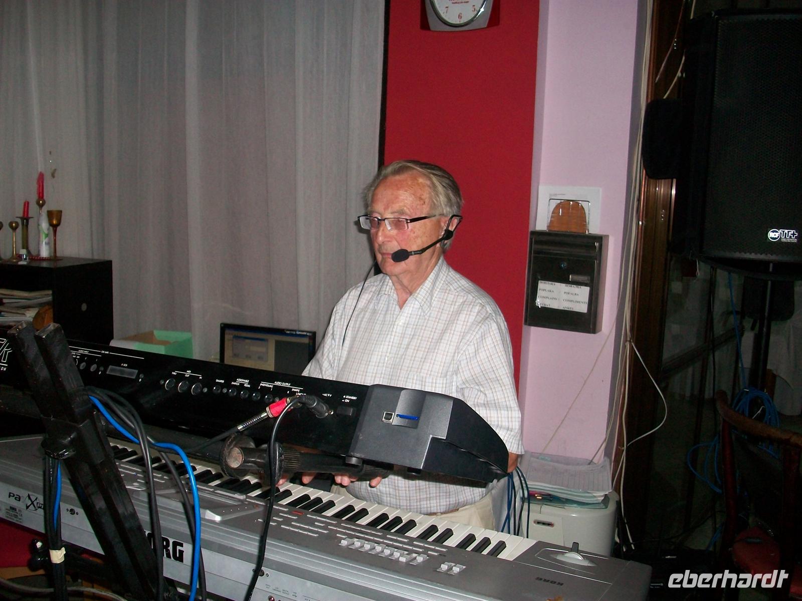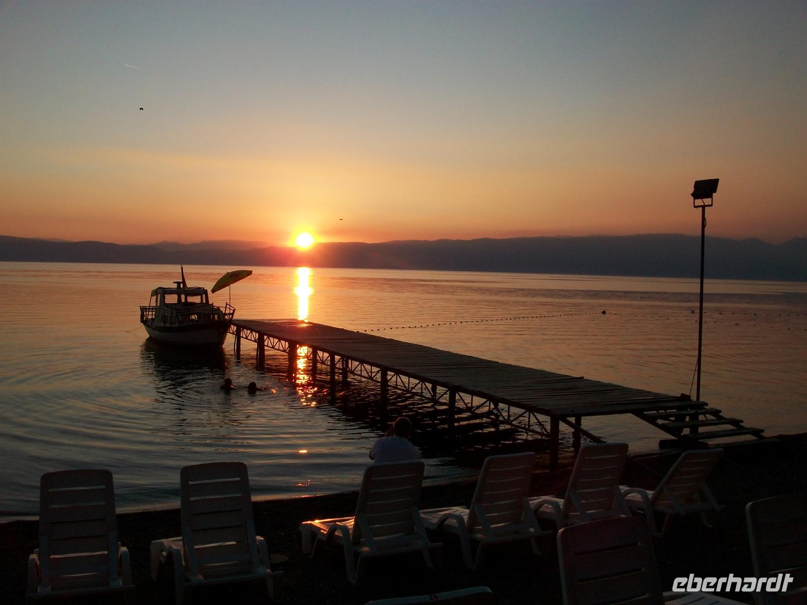 Unser Abendessen bekommen wir wieder in dem selben Restaurant wie gestern Abend; unsere Gastgeber haben draußen an der frischen Luft zwei Tafeln aufgestellt, mit einem schönen Blick auf den See ist es ein wunderbar romantischer Ausklang dieses Tages, glutrot geht die Sonne im Westen hinter den Bergen unter. Die zwei jungen Männer untermalen diese optischen Impressionen noch mit regionaler Folklore- es ist ein wahrhaftig stimmungsvoller Abend für die Reisegruppe. Als Krönung wird Herr Feudel, unser Senior, uns auf dem Instrument ein kleines Ständchen von deutschen Volksliedern bringen. Jetzt haben auch die Einheimischen ihre Gespräche eingestellt und lauschen den exotischen Klängen; es kommt wohl nicht so häufig vor, dass das Rennsteiglied über das Wasser des Ohridsees von Mazedonien in Richtung Albanien hallt…
