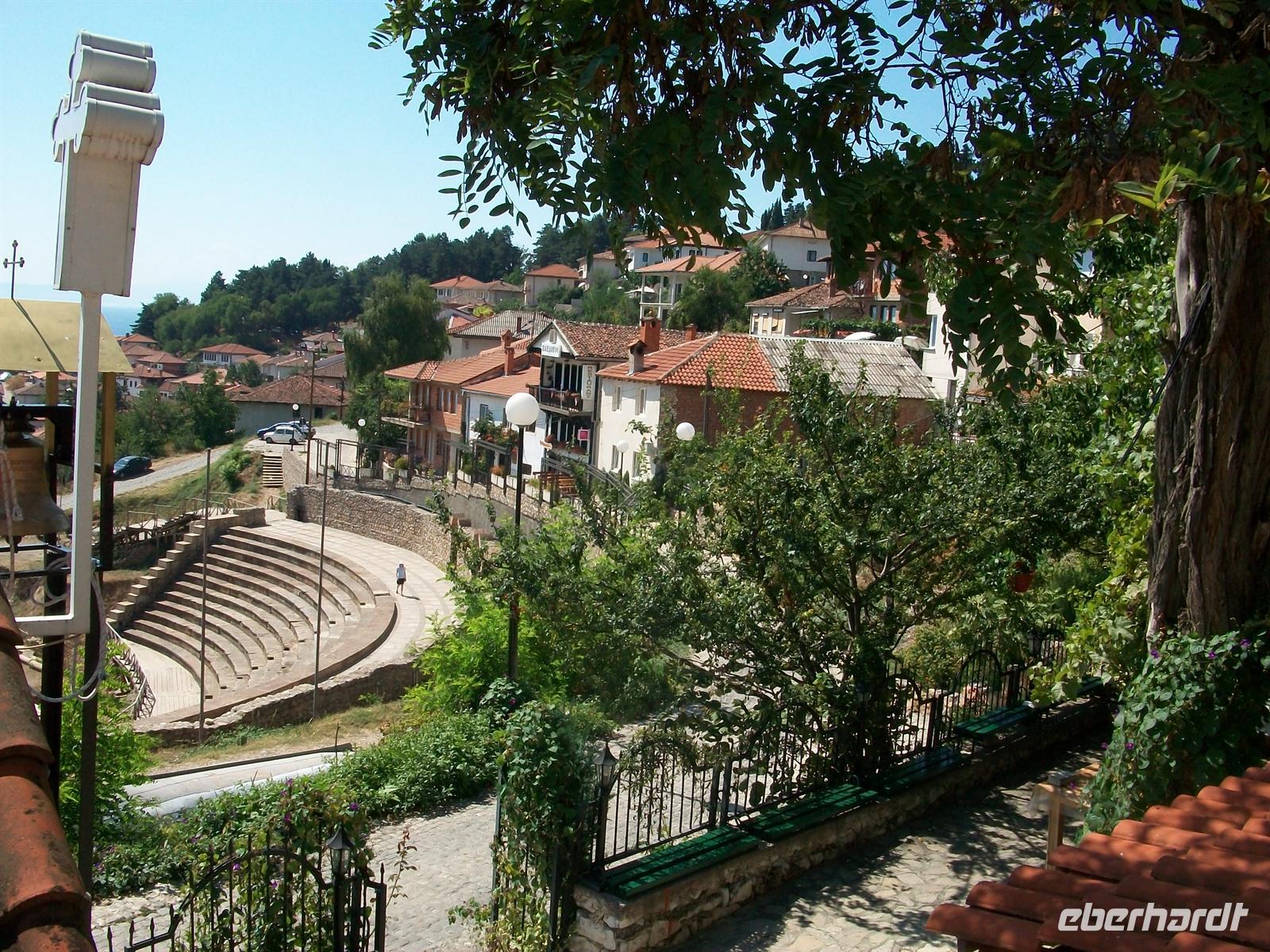 Aber, wir werden uns in den nächsten 90 Minuten mit der Historie und dem Leben von heute vertraut machen. Wir gehen entlang des Seeufers, besuchen eine kleine orthodoxe Kirche und gehen dann hinauf in Richtung der Festung und des Amphitheaters. Von hier oben hat man einen überwältigenden Ausblick auf den See in den sich Mazedonien und Albanien hineinteilen. Wir haben ein makelloses Wetter, der See liegt eingebettet zwischen den Bergen- hier ist es einfach schön. Dabei gibt es viel aus einer interessanten Geschichte zu erfahren, kurzum die Zeit der Führung vergeht wie im Flug. Dann beginnt die Freizeit in diesem schönen Ort, zahlreiche Restaurants laden zum sehr preisgünstigen Mittagessen ein, an der Seepromenade gibt es viele