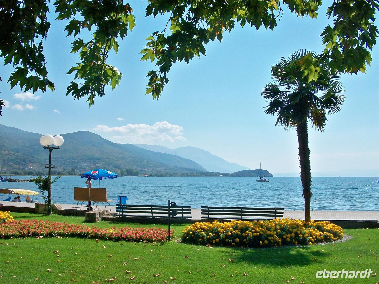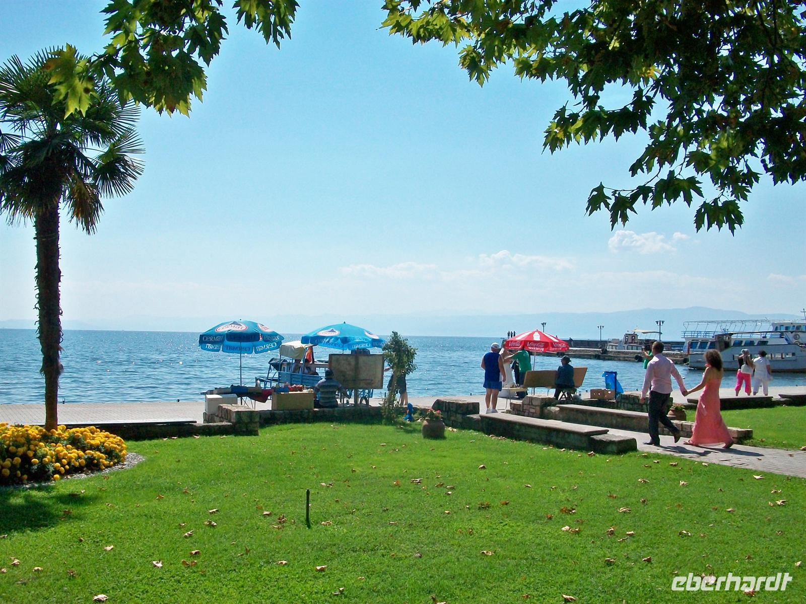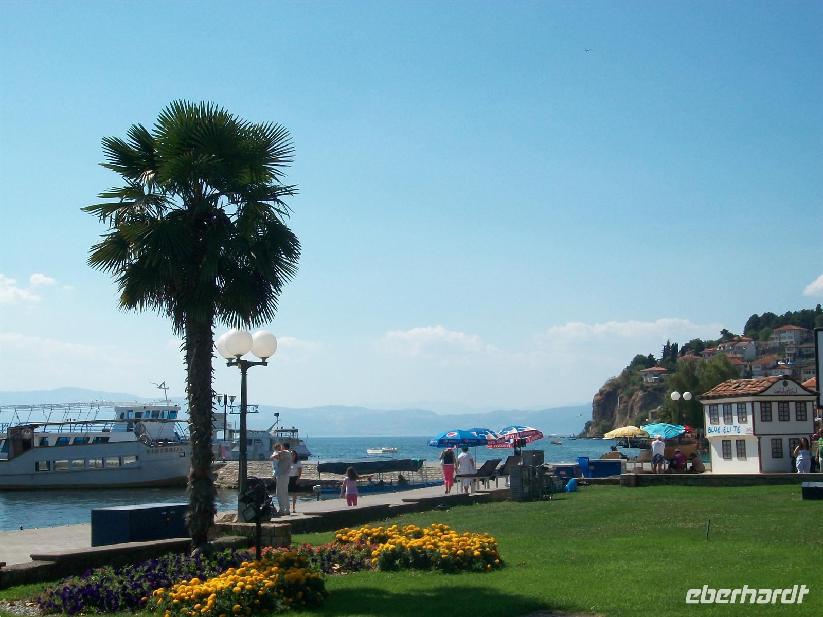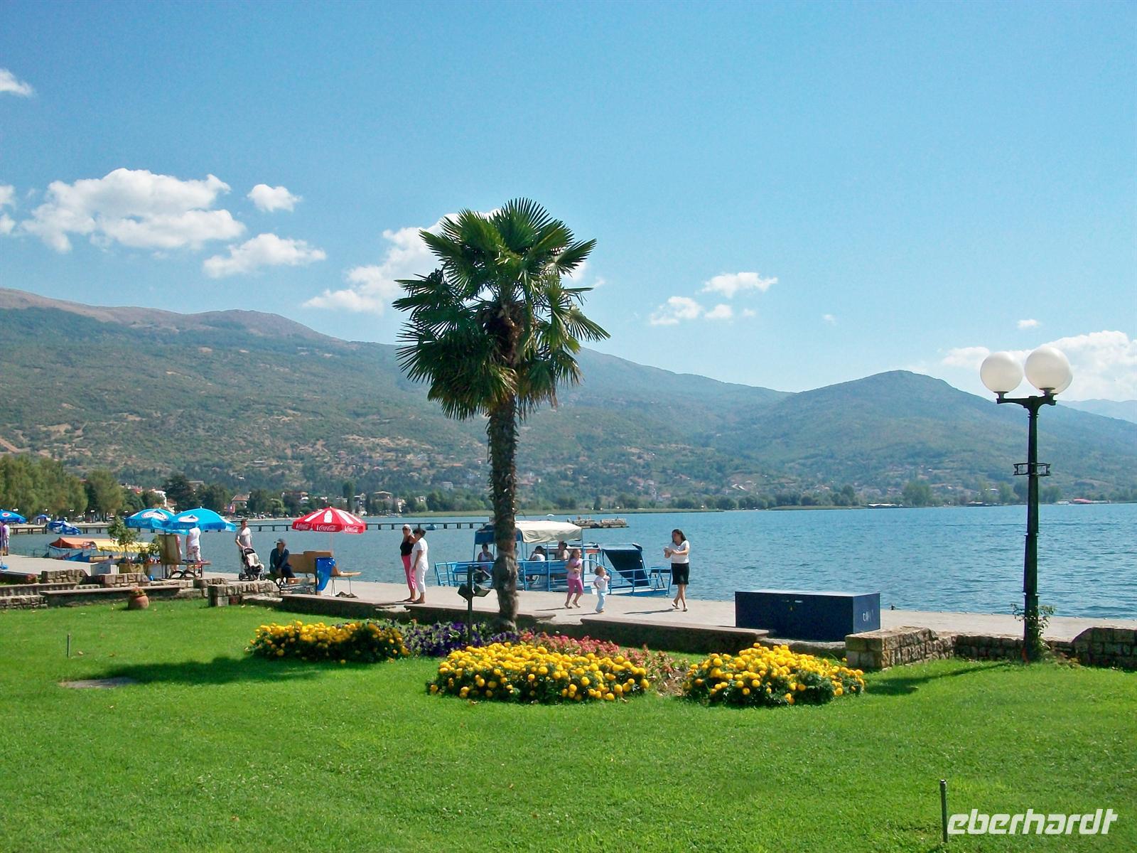 Wir schlendern durch die Fußgängerzone und kommen direkt am See heraus. Hier gibt es eine sehr schöne Palmenbewachsene Promenade, sauber und gepflegt. Mit etwas Phantasie könnte man annehmen man wäre an einem der Schweizer Seen oder am Gardasee. Da es hier am Ohridsee wenig Touristen gibt, ist daher alles sehr viel ruhiger als an anderen Urlaubsorten Europas und die Preise sind noch sehr niedrig- Ohrid ist ein Geheimtipp auch für Badetouristen!