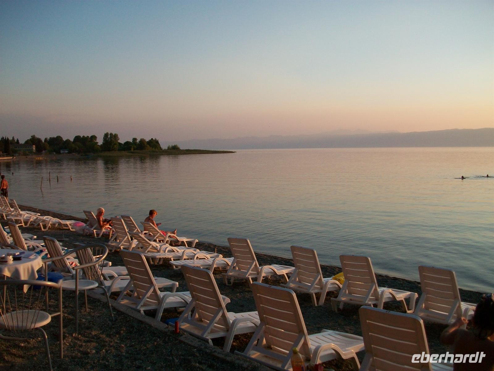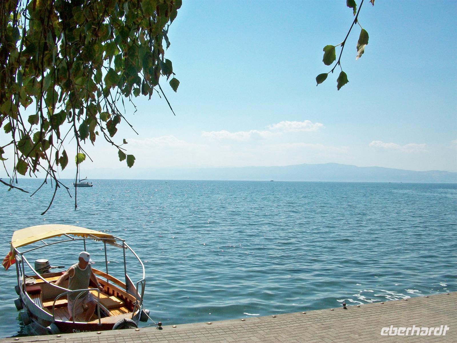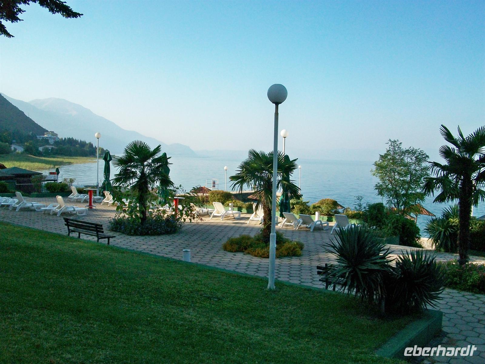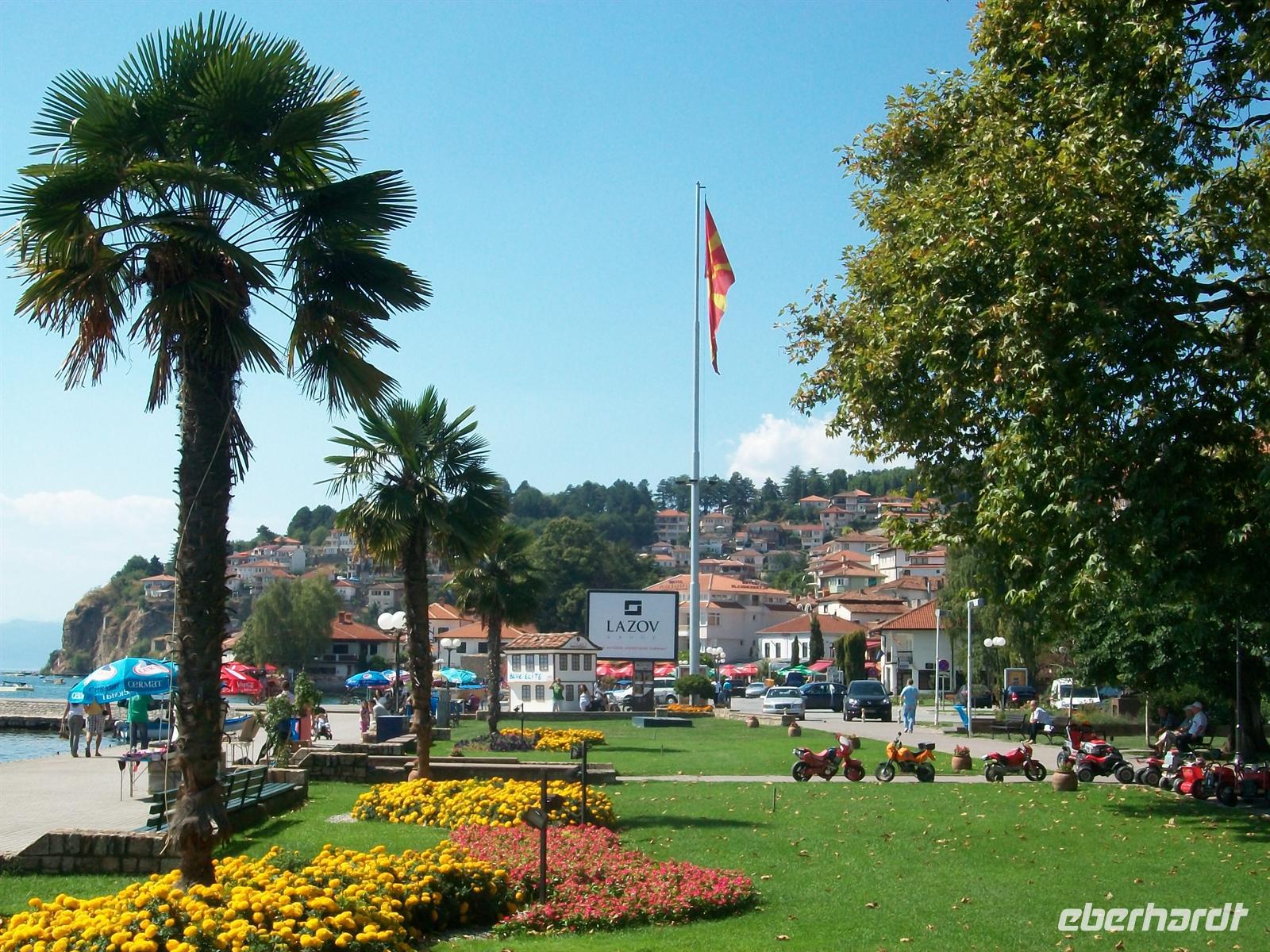Wir schlendern durch die Fußgängerzone und kommen direkt am See heraus. Hier gibt es eine sehr schöne Palmenbewachsene Promenade, sauber und gepflegt. Mit etwas Phantasie könnte man annehmen man wäre an einem der Schweizer Seen oder am Gardasee. Da es hier am Ohridsee wenig Touristen gibt, ist daher alles sehr viel ruhiger als an anderen Urlaubsorten Europas und die Preise sind noch sehr niedrig- Ohrid ist ein Geheimtipp auch für Badetouristen!