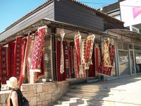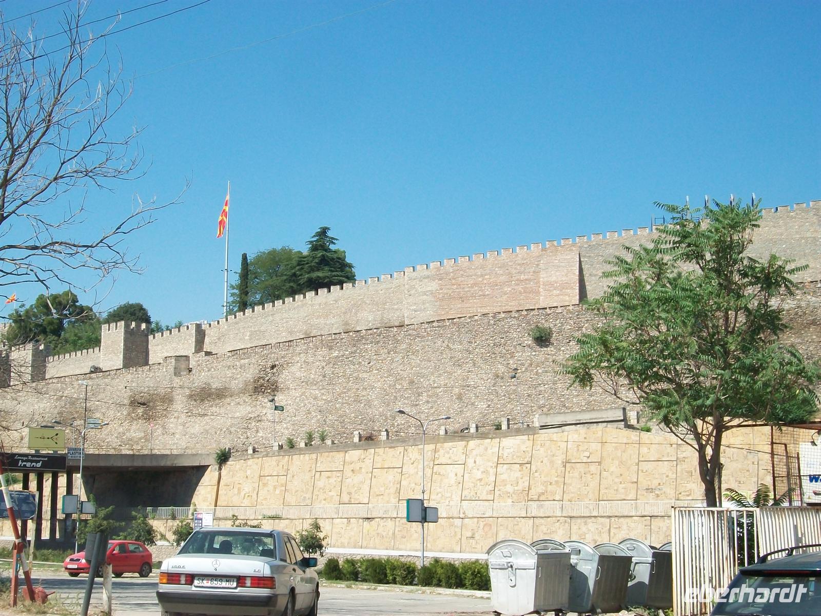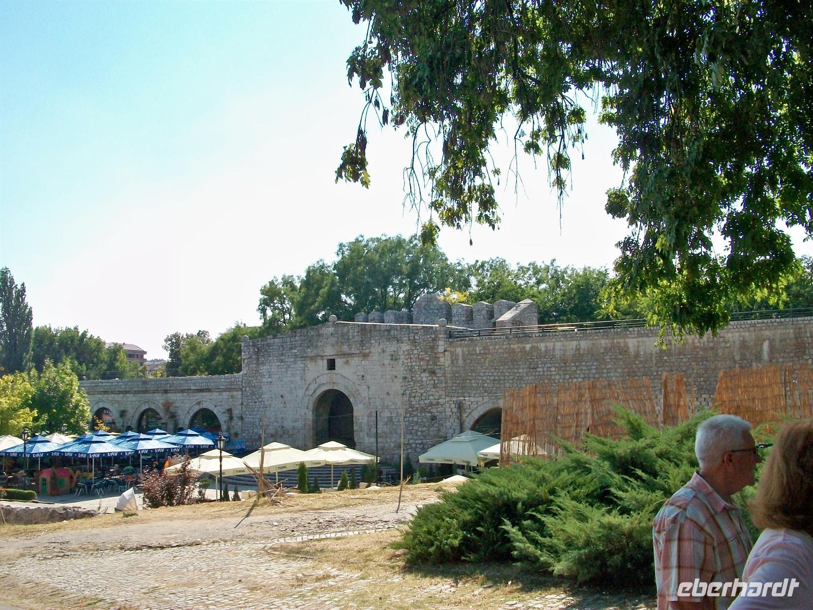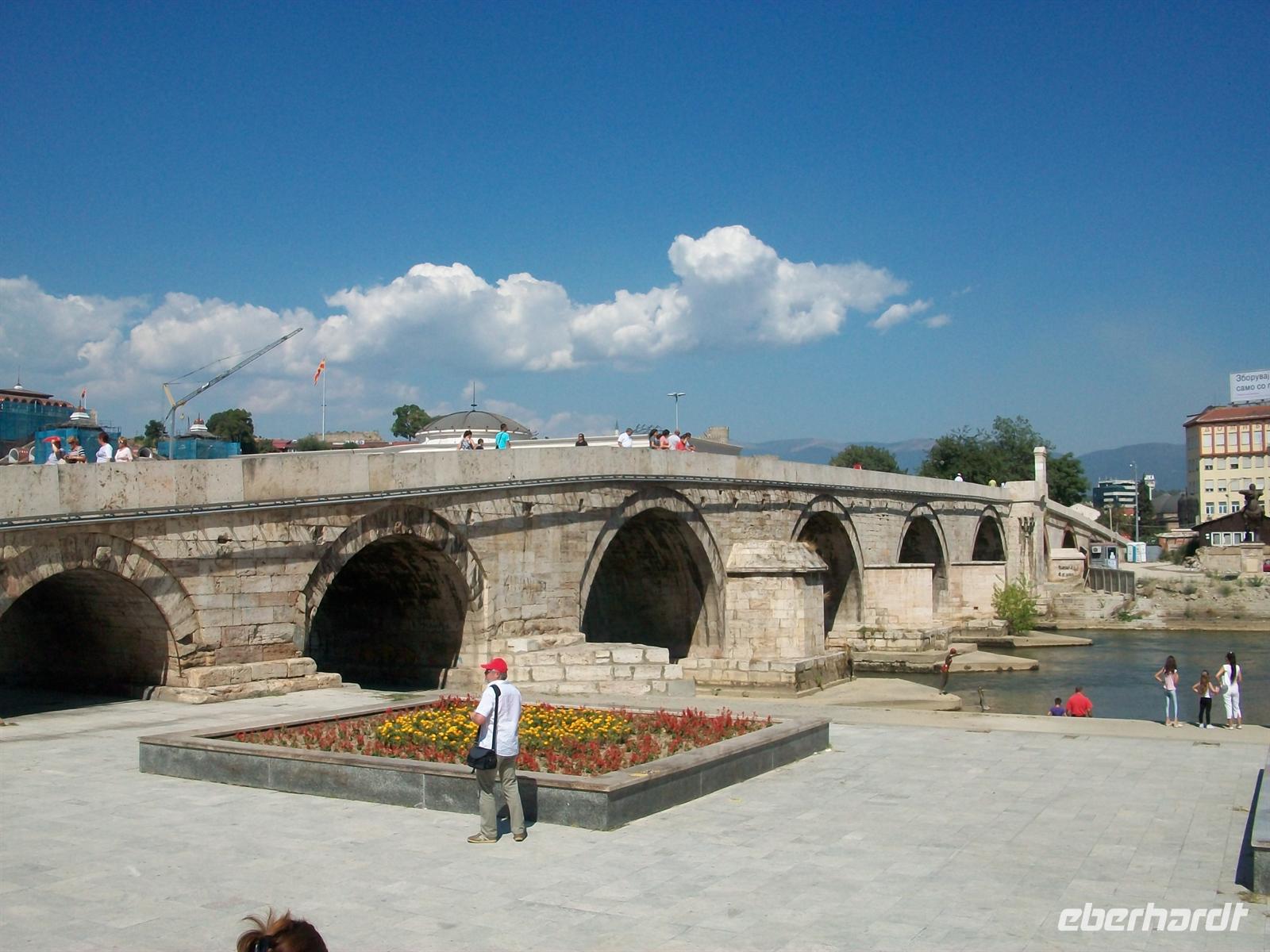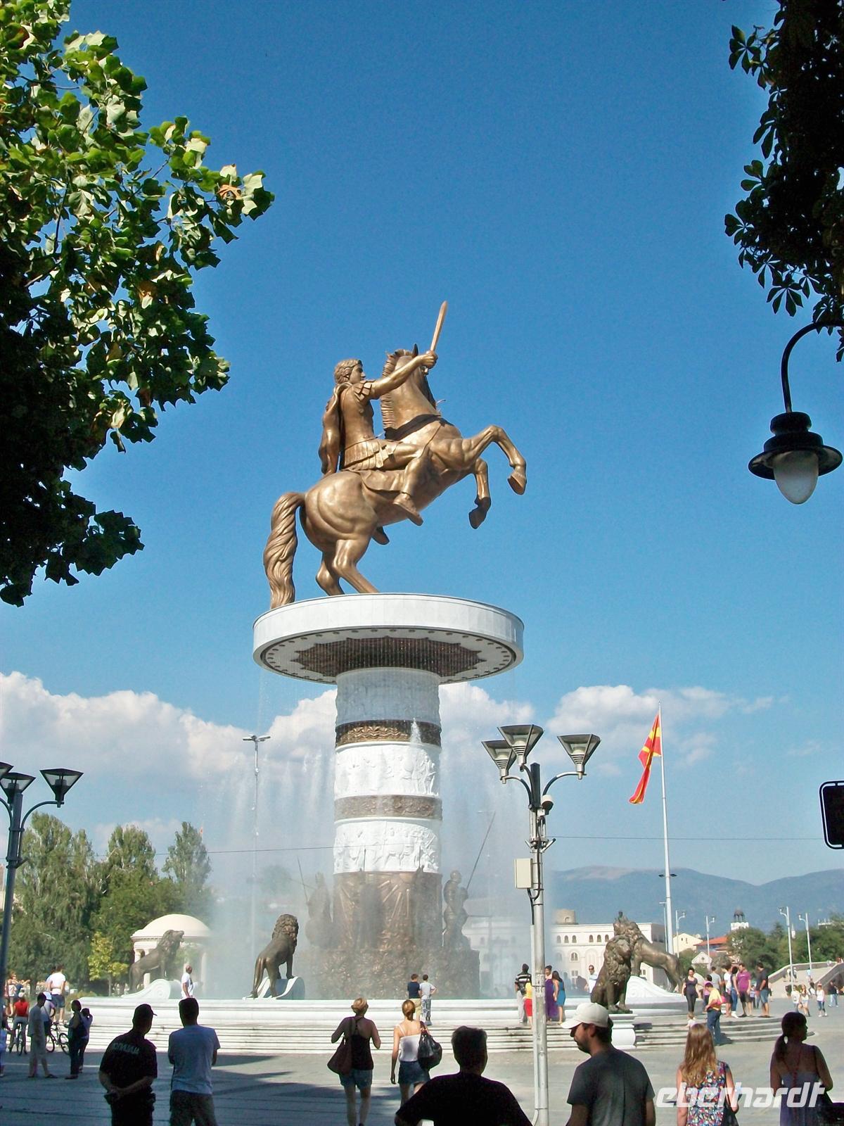Bald sind wir im Großstadtverkehr von Skopje unterwegs und auf dem Weg hinauf zur Festung. Hier werden wir schon von unserem Stadtführer Bogdan erwartet. Das Wetter kann eigentlich schöner nicht sein aber Petrus hat die Kontrolle über den Temperaturregler verloren, das Thermometer zeigt 32 Grad Celsius. Wir werden die nun folgende Führung ruhig angehen müssen. Leider werden große Teile der Festung renoviert, aber von hier oben hat man einen schönen Blick auf die quirlige Stadt. Wir gehen langsam bergab und durchqueren den osmanischen Teil, vorbei am Han (osmanische Herberge), einer Moschee und dem Basar. Sehr interessant, aber der Vergleich sei mit gestattet, nicht so schön wie Bašaršija in Sarajevo, jedoch auch nicht ohne Reiz. Leider ist es unerträglich heiß geworden, das ändert sich auch nicht als wir den Fluss erreichen. Die historische Steinbrücke bringt uns über den Vardar, dahinter beginnt der moderne Teil der Stadt. Am 26.Juli 1962 gab es hier ein verheerendes Erdbeben welches die Bausubstanz völlig zerstörte. Der Wiederaufbau musste schnell erfolgen, man brauchte Wohnraum und somit ist das Stadtbild geprägt von den Plattenbauten der Jugo- Moderne. Vor kurzem hat man hier die 20- jährige Unabhängigkeit und Loslösung vom jugoslawischen Staatenbund gefeiert und dabei ein sehr monumentales Reiterstandbild aufgestellt. Es stellt Alexander den Großen dar, eine wichtige Person, aber hier gilt: über Geschmack lässt sich streiten!