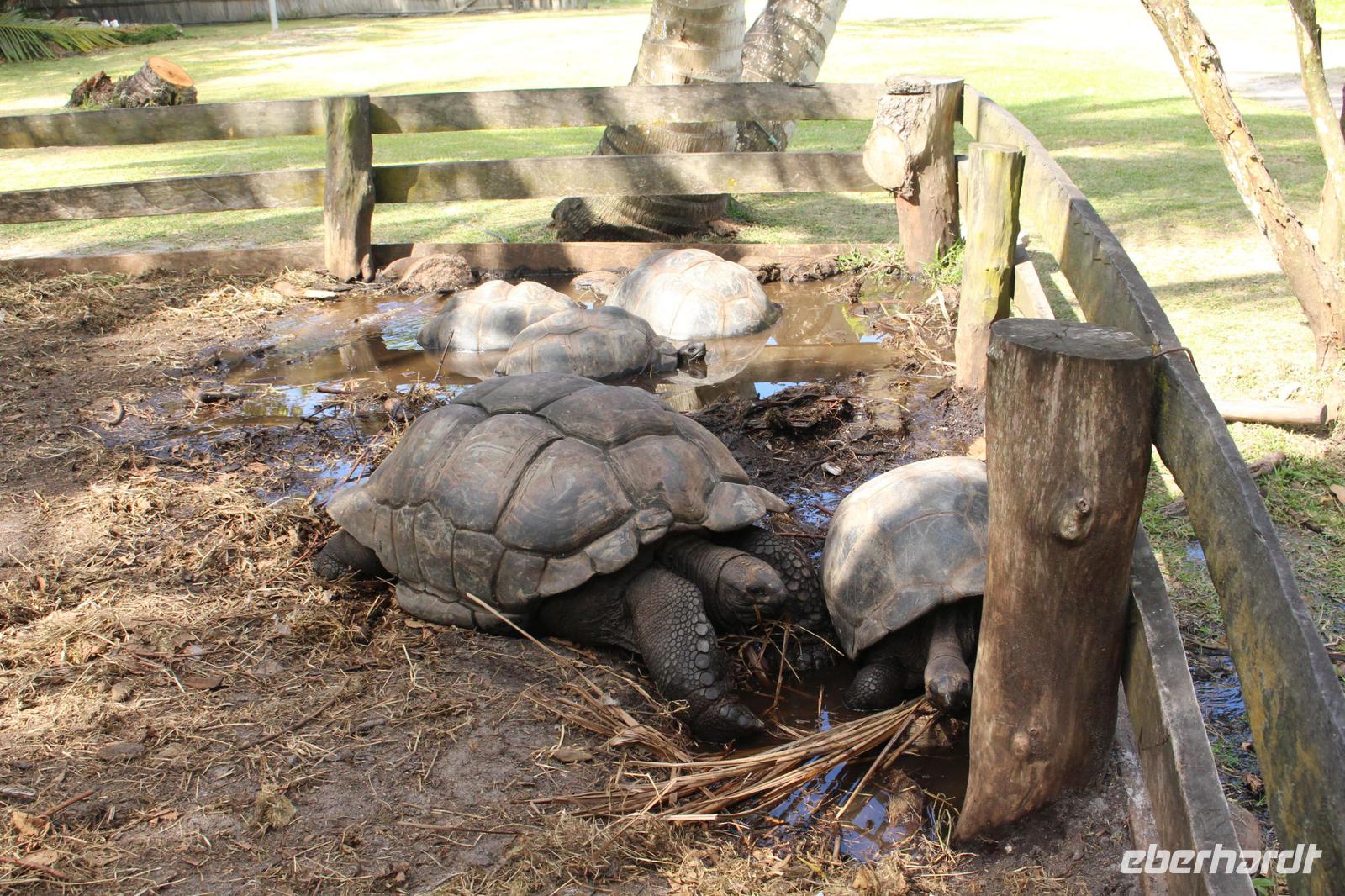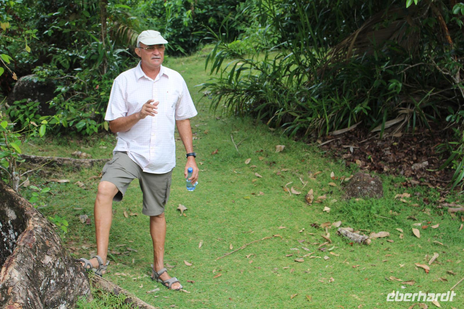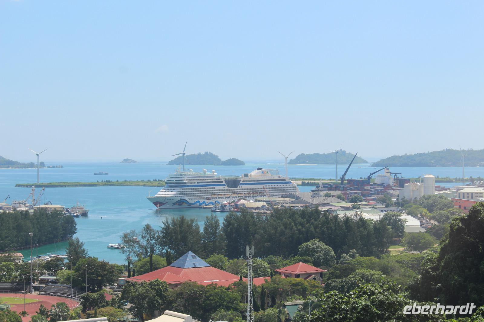 Auch heute haben wir wieder mit unserem Reiseleiter Cyril einen Eberhardt-Ausflug nur für unsere Gäste. Pünktlich nach dem Frühstück starten wir mit unserm Midibus und fahren zuerst zum Botanischen Garten. Cyril führt uns eine Stunde durch den tropischen Garten mit seiner einzigartigen Pflanzenwelt der Seychellen. Mitten in diesem herrlichen Garten gibt es ein großes Schildkrötengehegen, wo man für ein paar Rupie die Kröten füttern und anfassen darf. Als nächstes besuchen wir noch den Aussichspunkt - Mission Lodge. Hier sahen wir noch die Ruinen von alten Sklavenunterkünfte. Oben angekommen blickten wir auf wunderschöne grüne Wälder und auf die Westküste Mahés - was für ein Ausblick. Mittags stärken wir uns bei typisch kreolischem Essen im Restaurant Marie-Antoinette. Bevor es wieder aufs Schiff geht, fahren wir noch zur einzigsten Stadt die es auf den Seychellen gibt - die Hauptstadt Viktoria. Hier in der kleinsten Hauptstadt der Welt leben rund 25.000 Einwohner. Wir schlendern noch über den Wochenmarkt um noch die letzten Souveniers und Gewürze zu kaufen. Dann fahren vorbei am Little Big Ben - dem Wahrzeichen der Stadt - und nun geht es wieder auf´s Schiff. Da auf den Seychellen neue Gäste dazu gestiegen sind, müssen wir auch heute nochmals an der Seenotrettungsübung teilnehmen, bevor die AIDA Mahé verlässt und wir Kurs auf Madagaskar nehmen.