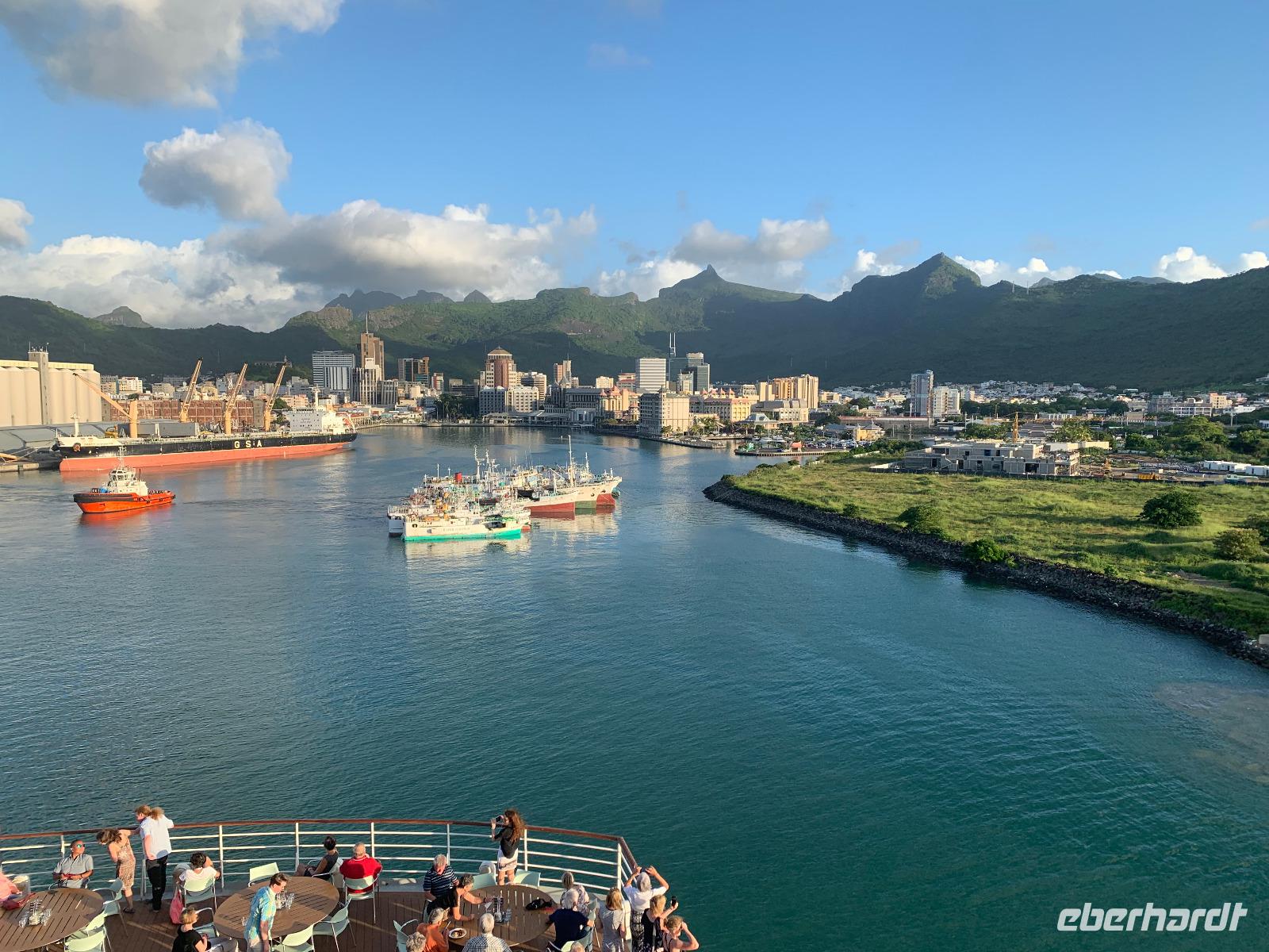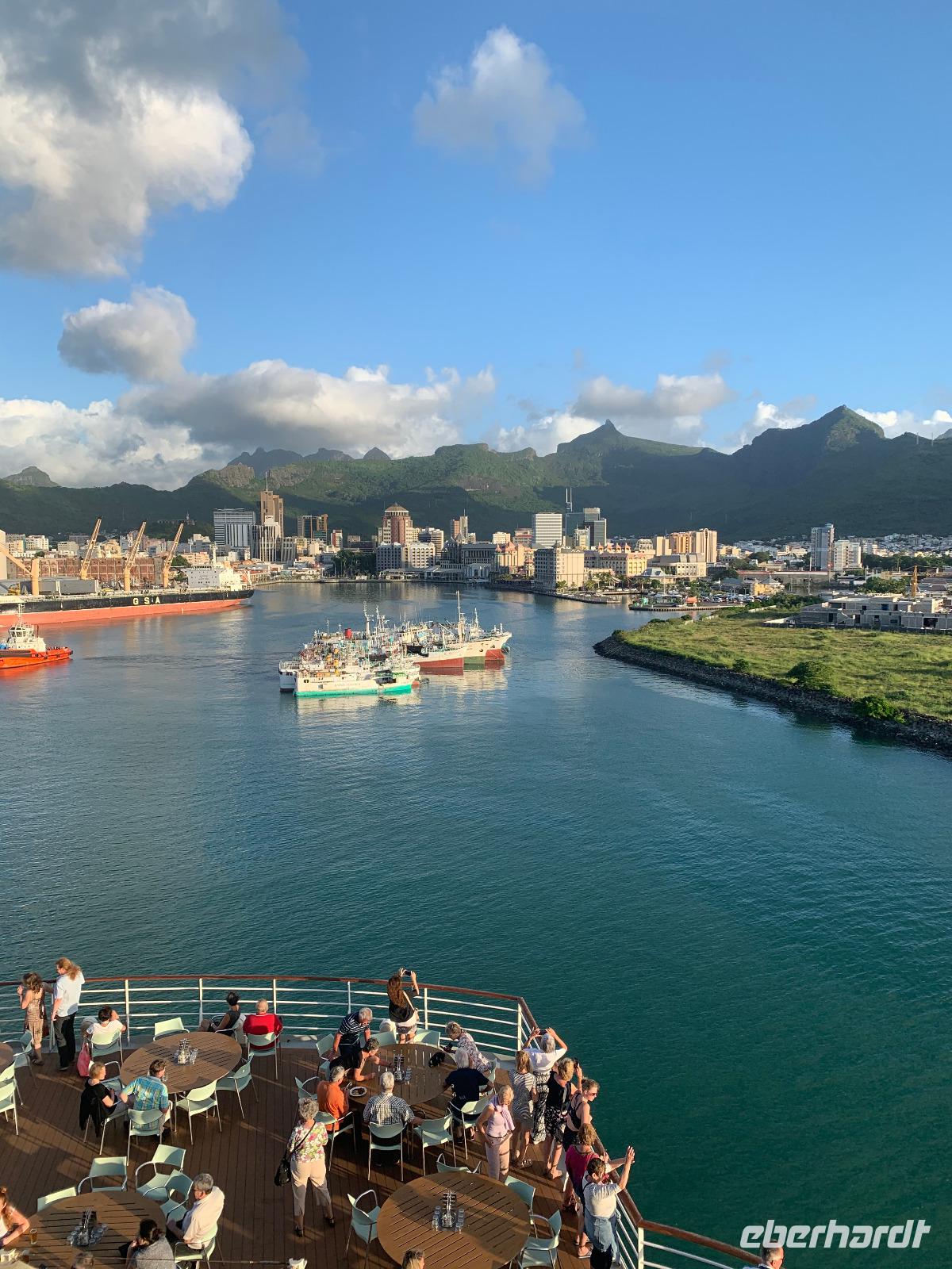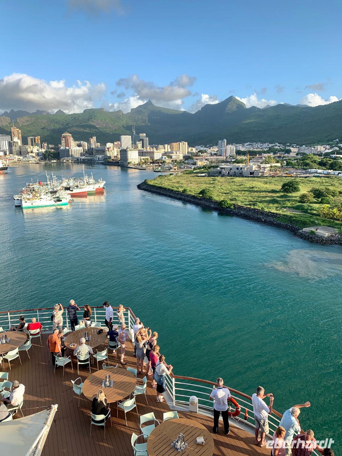 18.00 Uhr erleben wir beim schönstem Wetter das Auslaufen draußen an Deck. Wir hören zum ersten Mal auf dieser Reise den AIDA-Auslaufsong Sail Away, der bei jedem Ablegen immer wieder für Gänsehaut-Feeling sorgt. Der Blick auf Port Louis mit den Bergen im Hintergrund ist traumhaft schön! ...