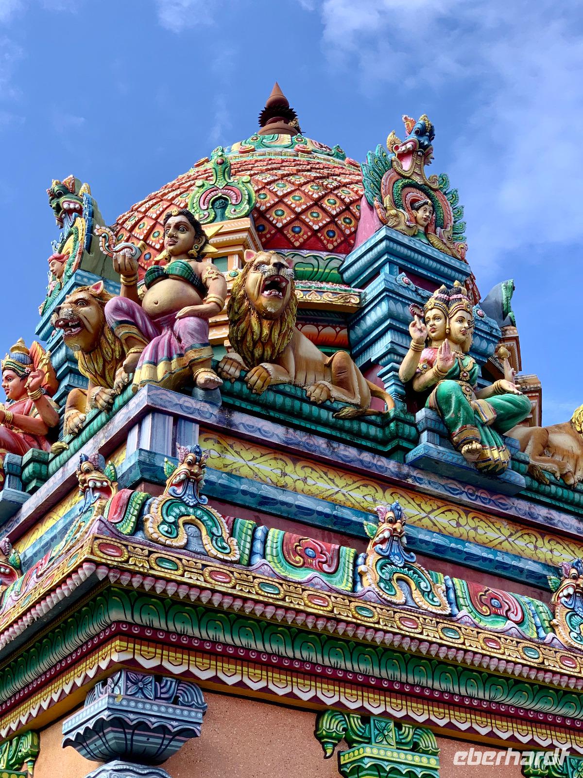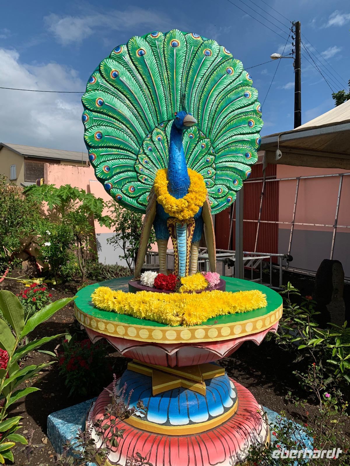 Liegeplatz der AIDAblu ist Le Port, eine weniger sehenswerte Hafen- und Arbeiterstadt im Nordwesten der Insel. Wir liegen bereits seit 05.30 Uhr vor Anker, da in Frankreich für heute wieder Streiks geplant sind und wir diesen somit voraus sind. Wir starten unseren AIDA-Ausflug über die französische Tropeninsel 08.30 Uhr bei 26 Grad Celsius und Sonnenschein. Zwei große Busse sind für die Große Inselrundfahrt geplant. Unser auf La Réunion lebender Reiseleiter David spricht perfekt Deutsch und wird uns auf den 220 Kilometern, die wir heute mit dem Bus zurücklegen werden, alles Wissenswerte über dieses grüne Kleinod im Indischen Ozean vermitteln. Wir fahren im Uhrzeigersinn um die Insel und streifen nach nur 15 Minuten Fahrt die 140.000 Einwohner zählende Hauptstadt Saint Denis. Wir passieren schier endlose Zuckerrohrfelder. Nach dem Tourismus zählt die Zuckerrohrindustrie zum wichtigsten Wirtschaftsfaktor der Insel. Erster Halt ist der Hindu-Tempel du Colosse in Saint-André. Er ist der größte und bedeutendste auf La Réunion. Circa 25% der Inseleinwohner sind Hindus und heute beginnt das traditionelle Nugura-Fest. Wir sehen, wie die Hindu-Frauen den Tempel mit unzähligen Blumen schmücken. Wir begnügen uns mit dem wunderschönen Anblick von außen auf die farbenfrohen, filigranen Kunstwerke, denn der Tamilen-Tempel ist leider nicht öffentlich zugänglich.