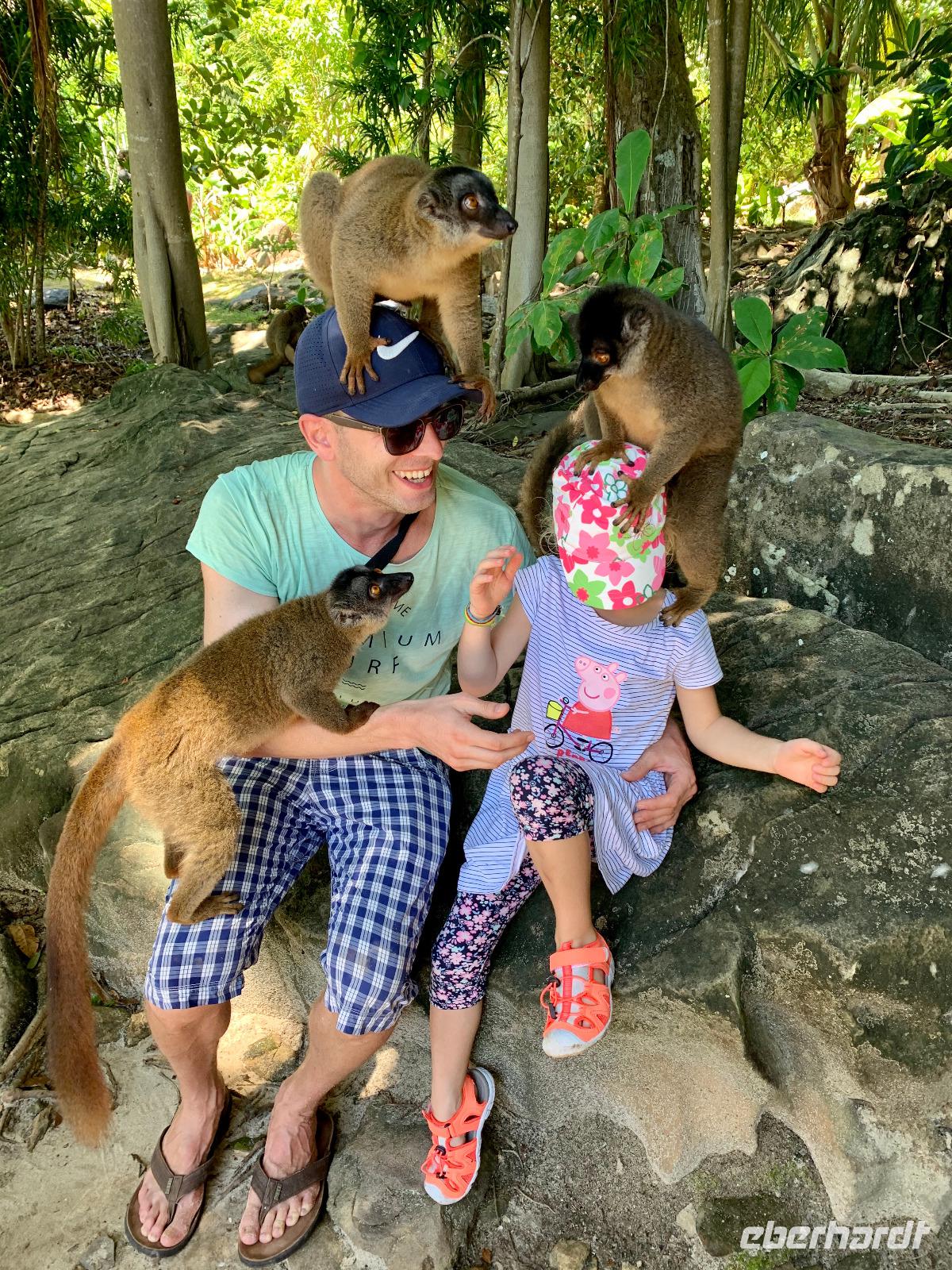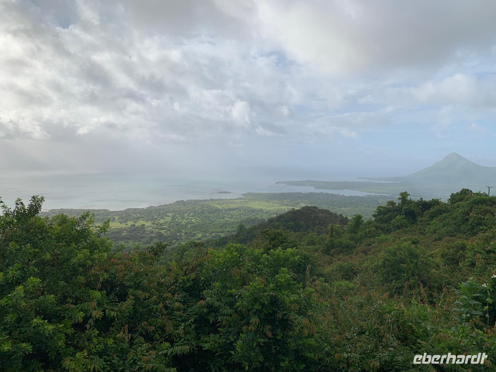 Nächster Halt ist der Black River Gorges Nationalpark. Wir halten an einem Aussichtspunkt, der durch den Regen und Nebel leider nur erahnen lässt, welche Naturschönheiten dieser riesige Park birgt, der aus mehreren Naturschutzgebieten besteht. Ein paar Makaken leisten uns Gesellschaft, während wir auf einen neuen Bus warten müssen, denn der alte hat seit unserer unwegsamen Fahrt durch die Teeplantage einen Reifenschaden.