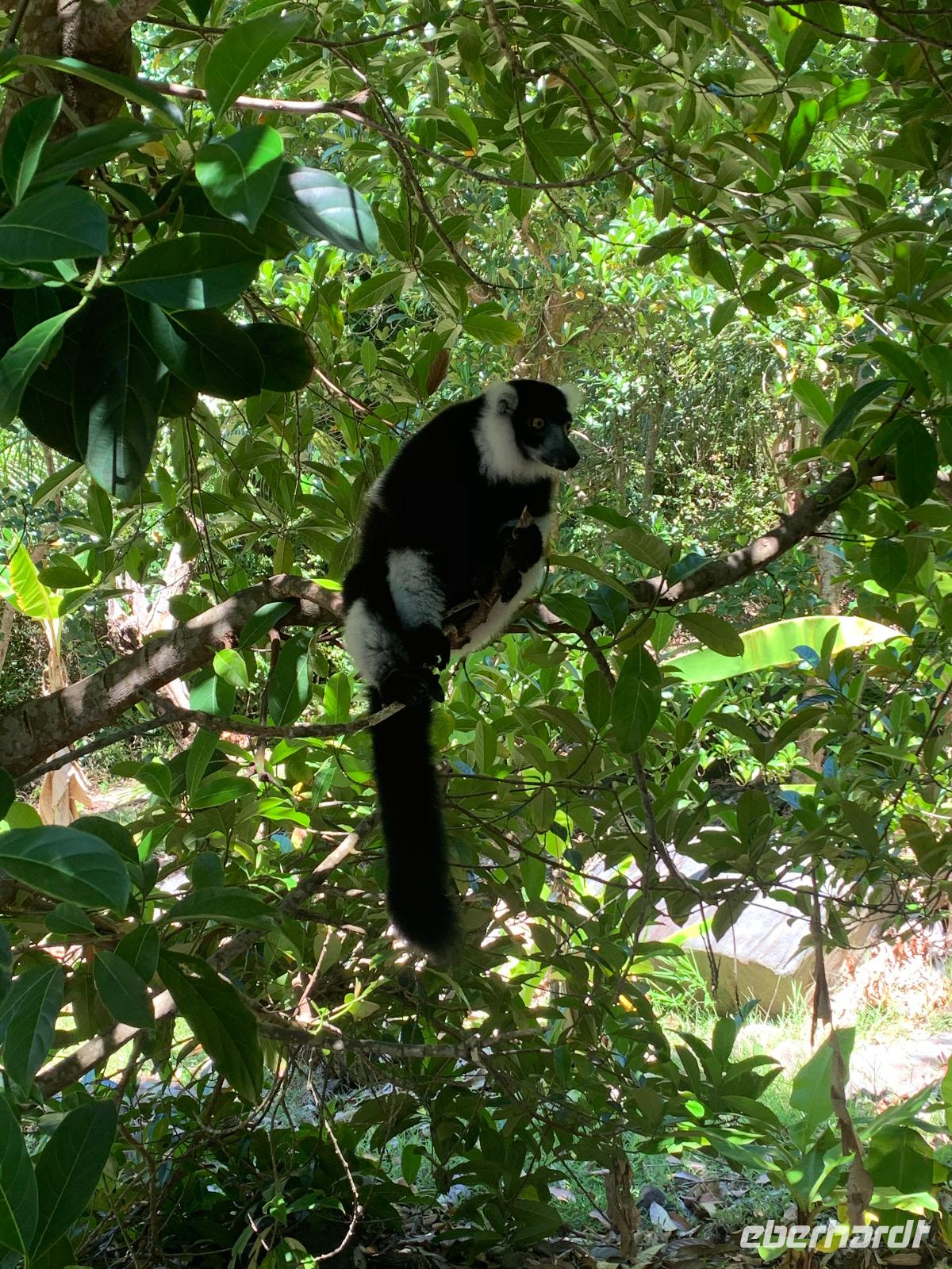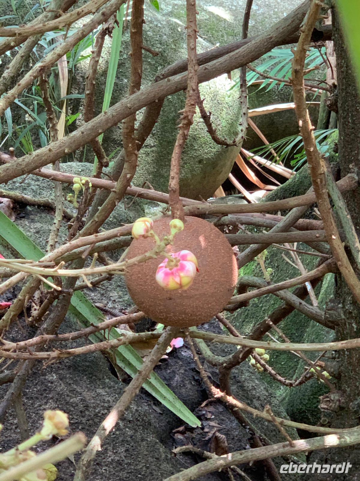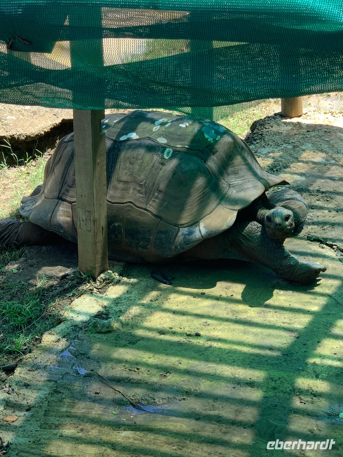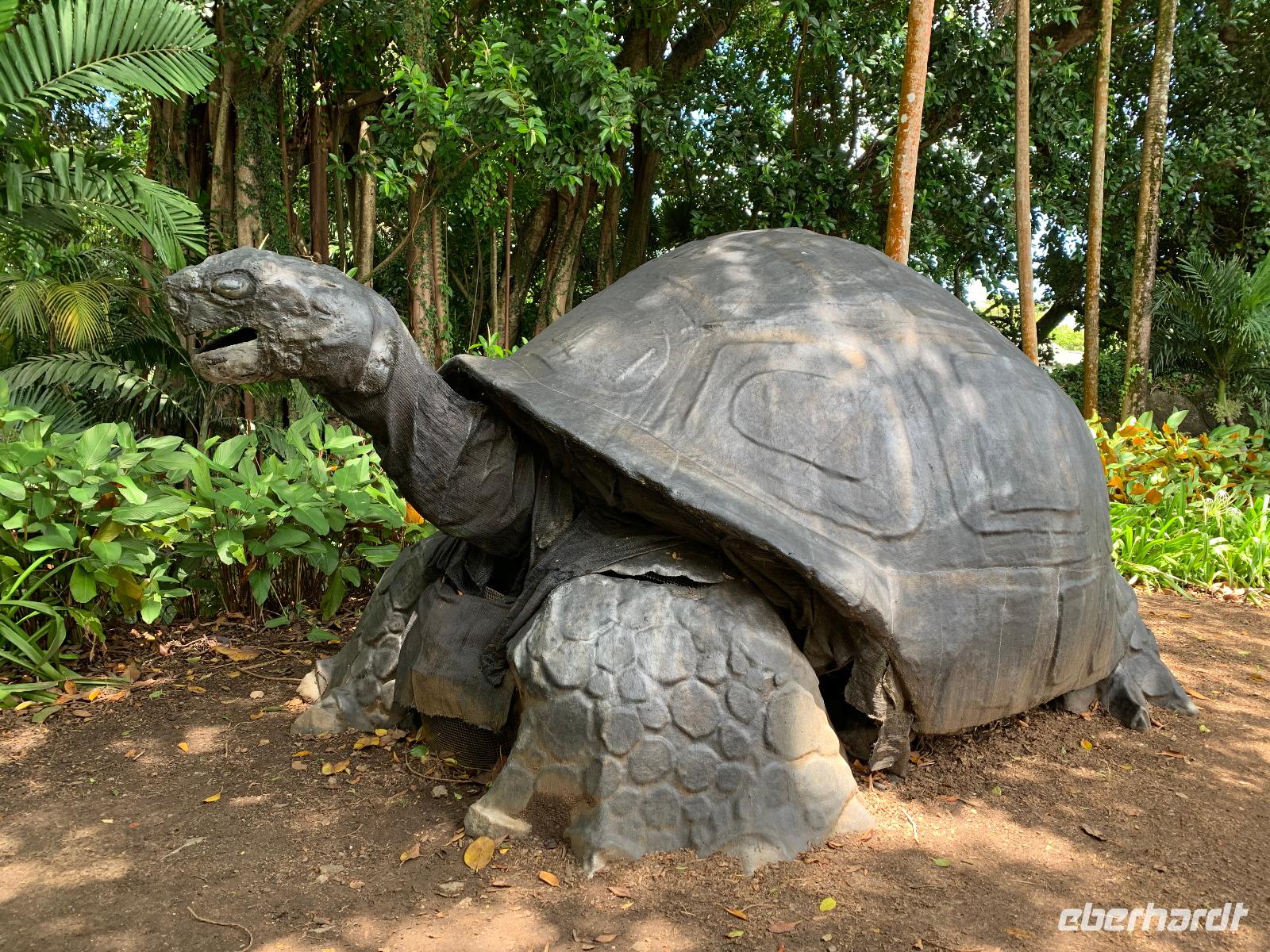 Unser Bus und Reiseleiter Steeve warten bereits vor dem Schiff auf uns und gegen 09.30 Uhr fahren wir ins Inselinnere ins kleine Städtchen Pamplemousses zum Botanischen Garten, der eine der Hauptsehenswürdigkeiten von Mauritius ist. Vor knapp 300 Jahren entstand aus der Idee eines Gemüsegartens dieser königliche, botanische Park. Hier fehlt kaum eine Pflanze, die in tropischen Gebieten wächst. Vor allem die Vielfalt an Palmen und sonstigen Bäumen ist beeindruckend. Unser Reiseleiter Steeve beeindruckt uns mit seinem großen Wissen über all diese Pflanzen, ob Informationen zum Leberwurstbaum oder über einige der 80 verschiedenen Palmenarten hier. Ganz oben in den Baumwipfeln sehen wir zahlreiche Flughunde. Auf unserem Rundgang bestaunen wir von der Arokarie über den Soursop-Baum bis hin zu Ylang Ylang tropische Pflanzen in all ihrer Schönheit. Zu den Höhepunkten zählen definitiv der Riesenseerosenteich und der Lotusblumenteich. Bevor wir den Botanischen Garten verlassen, besuchen wir noch eine besonders lahme Gattung von Riesenschildkröten.