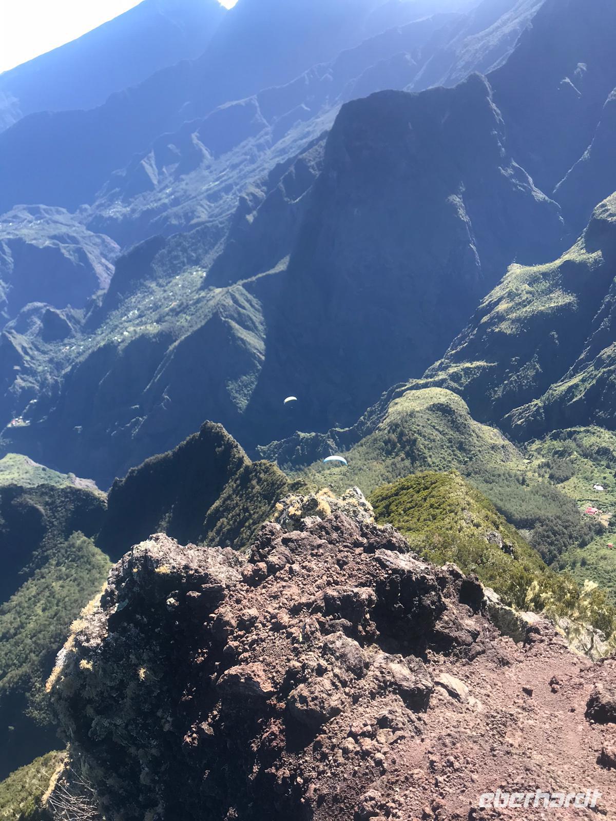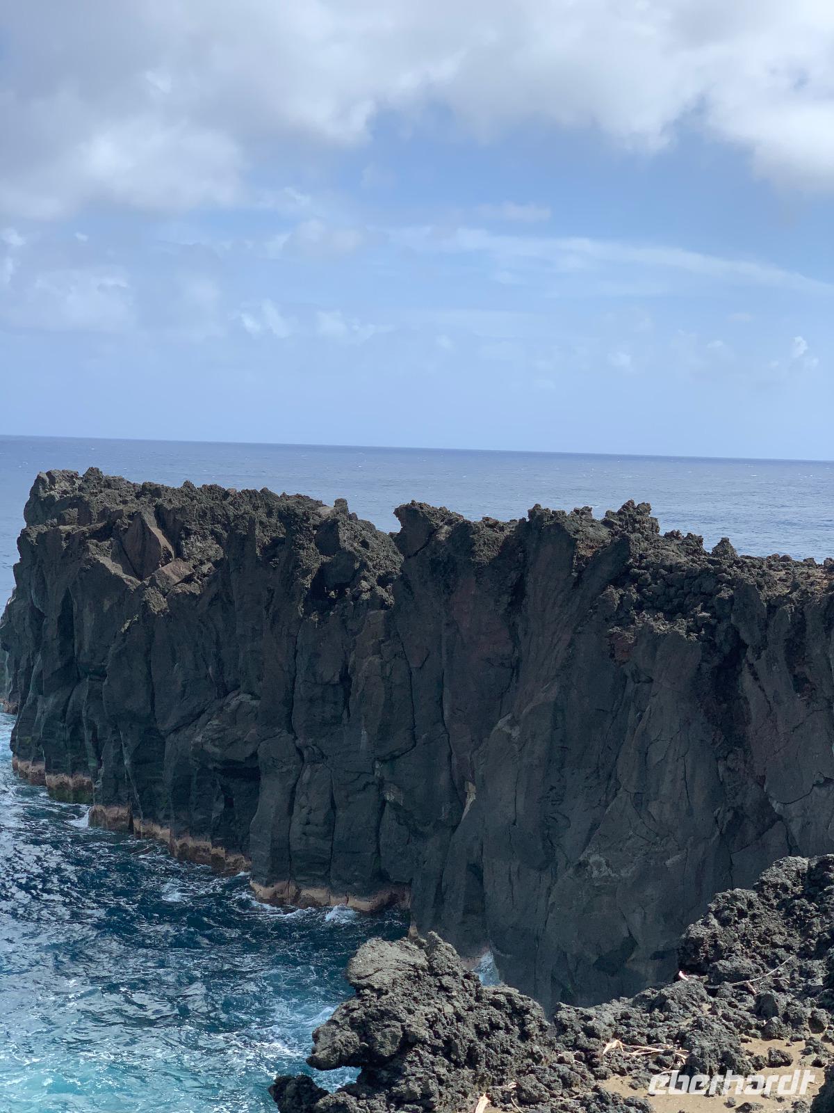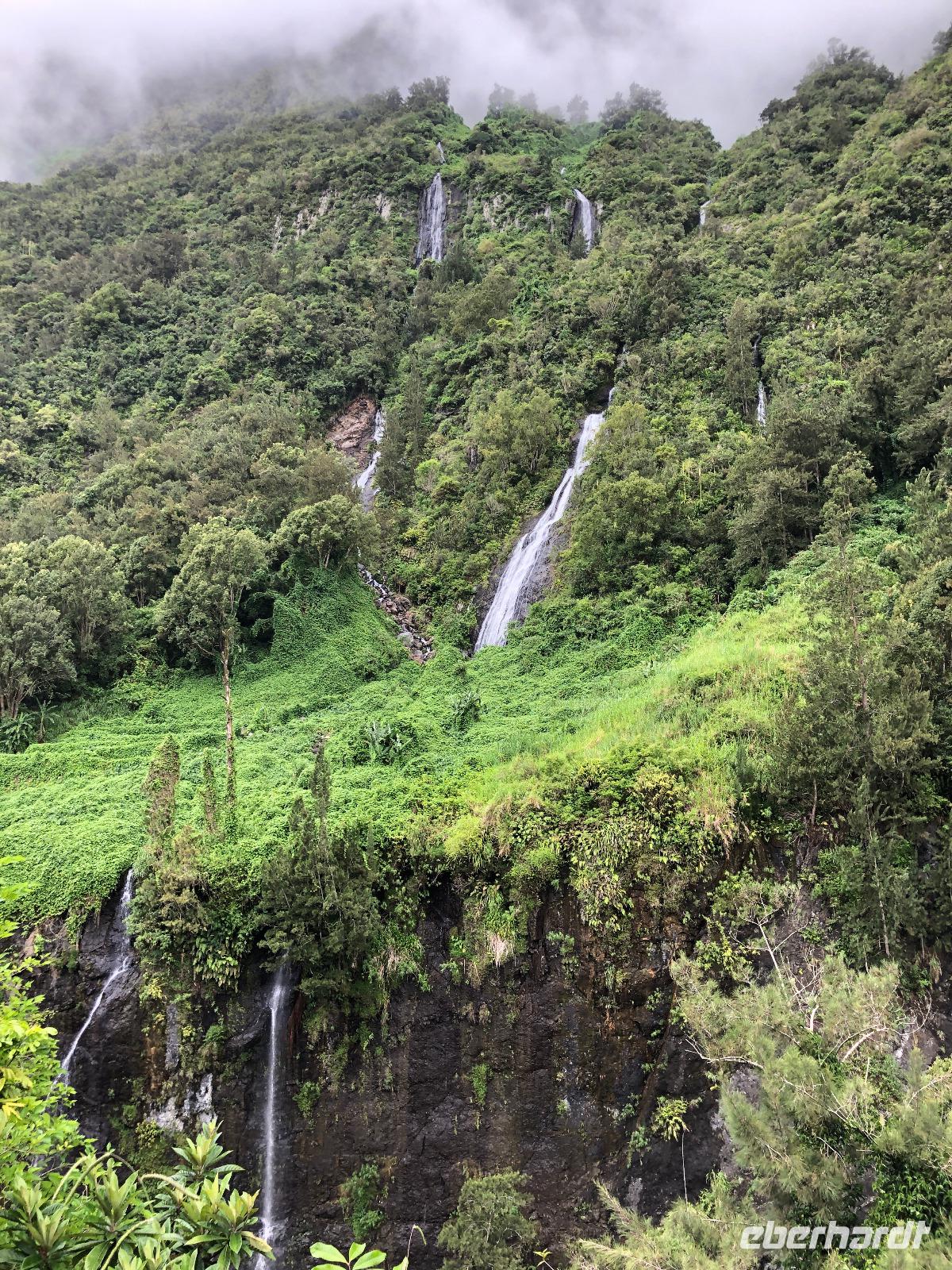 Unsere Busfahrt führt uns weiter entlang der Küste um die Insel. Unser nächster Halt ist im Südosten der Insel, wo wir eine neu gebaute Straße befahren. Wir sind umgeben von erkalteten Lavaströmen und halten im Gebiet von Grand Brulé. Wenn wir in Richtung Inselinneres blicken, sehen wir sogar noch heißen Dampf vom Ausbruch des Piton de la Fournaise im Oktober 2019 aufsteigen. Leuchtend grüne kleine Pflanzen bilden einen hübschen Kontrast zu dem dunklen Gestein und zeigen uns, wie fruchtbar dieser Boden doch ist.