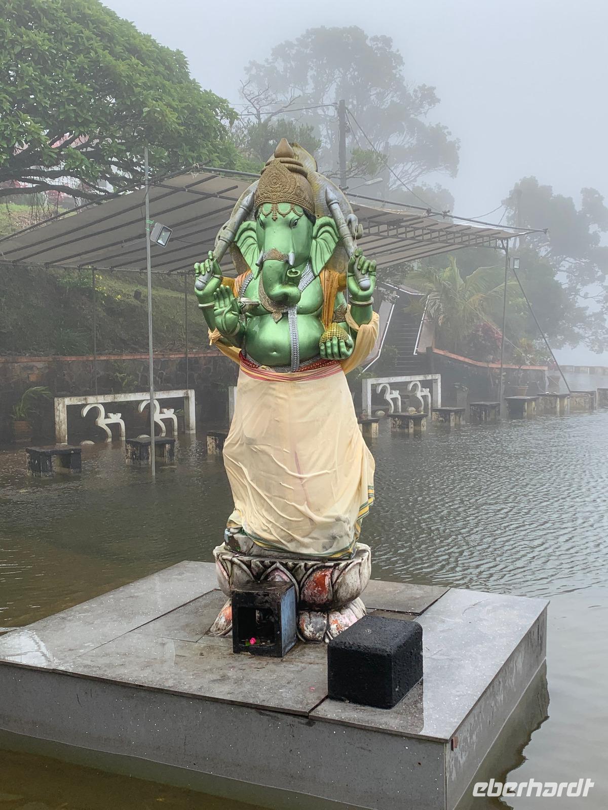 15 Minuten später erreichen wir Ganga Talao, auch bekannt als Grand Bassin. Dies ist die heiligste Pilgerstätte der Hindus auf Mauritius. Wir trotzen dem Dauerregen und besuchen diese Hindustätte. Sie liegt am Kratersee und die Atmosphäre hier ist regelrecht mystisch. Die wunderschönen Statuen der Hindu-Götter erheben sich im Nebel aus dem See und die Hindus legen ihre Opfergaben nieder. Den Tempel selbst muss man barfuß betreten.