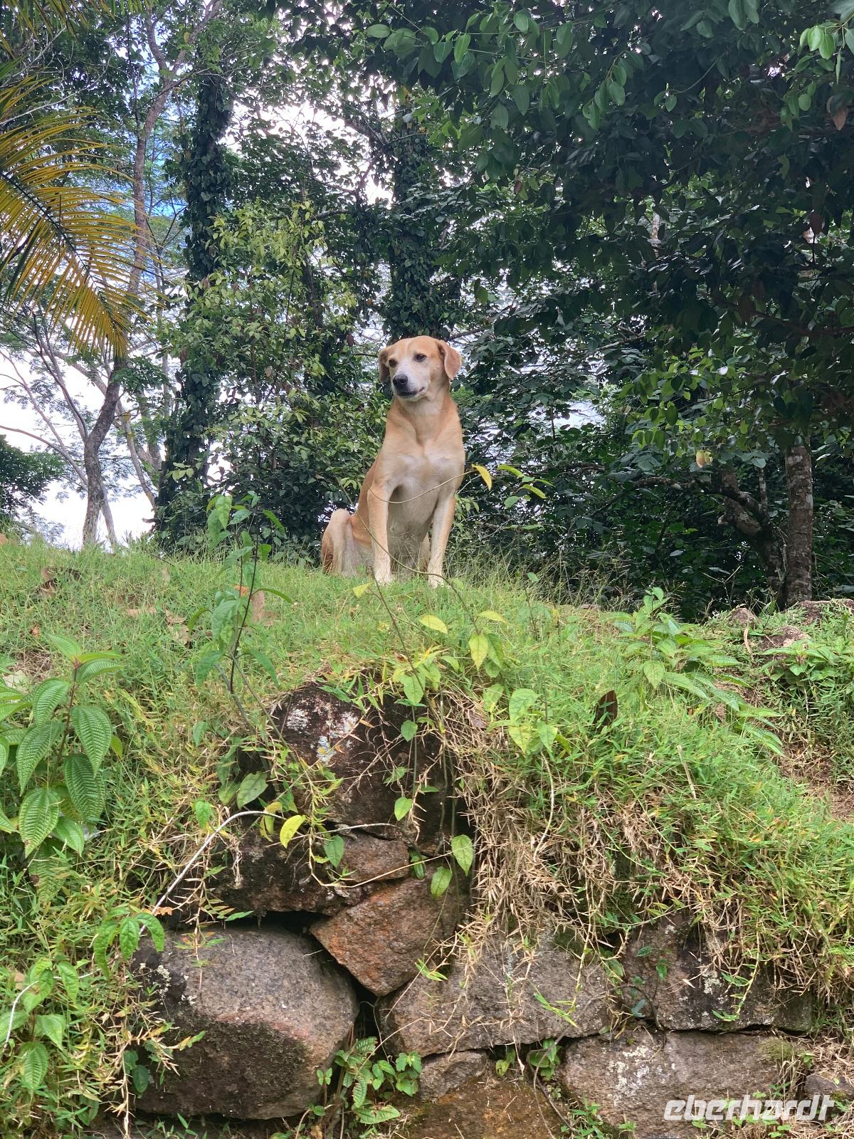 Bevor uns die nächsten Regentropfen erfrischen, steigen wir zurück in den Bus und fahren weiter entlang der Ostküste zur Anse de Cascade, was übersetzt so viel heißt wie die Bucht mit den Wasserfällen. Angekommen in diesem wunderschönen grünen Tal, hört der Regen auf und sogar ein paar Sonnenstrahlen blinzeln uns entgegen. Zahlreiche kleinere Wasserfälle ergießen sich heute dank des vielen Regens besonders schön in diese Bucht. Ein Spazierweg führt uns an den Wasserfällen vorbei bis zum Meer und auf dem Rückweg laufen wir an einem wunderschönen Garten mit unzähligen, riesigen Kokospalmen vorbei. Mittendrin sieht man für einen Augenblick einen hübschen Farbtupfer: den leuchtend orangefarbenen Kardinalvogel. Nach weiteren 20 Minuten Busfahrt erreichen wir das Restaurant Ferme Auberge La Cayenne. Wunderschön an der Steilküste über dem Meer gelegen genießen wir den tollen Ausblick, das besondere Ambiente und ein kreolisches Menü, welches wirklich vorzüglich schmeckt. Auf dieser Basis lässt es sich im Anschluss gut ein paar der verschiedenen eingelegten Rumliköre verkosten.