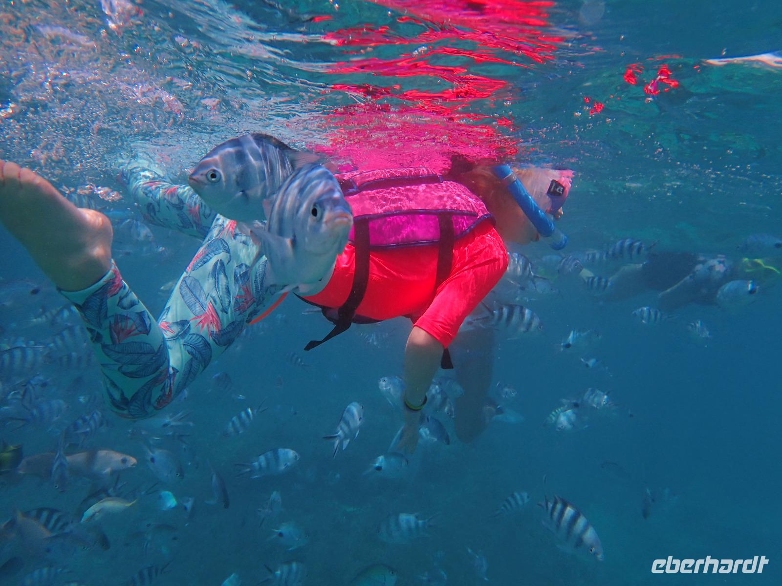 Aber Badeschuhe nicht vergessen!Den Nachmittag lassen die meisten entspannt am Strand mit leckeren Getränken von der Strandbar oder bei einem Spaziergang durch die schöne Hotelanlage ausklingen. Es ist leicht bewölkt und die Sonne gibt uns Zeit, sich an diese Extraportion Vitamin D langsam zu gewöhnen. Wir gehen mit dem Meer auf Tuchfühlung - unserem Wegbegleiter Nummer 1 für die nächsten zwei Wochen!