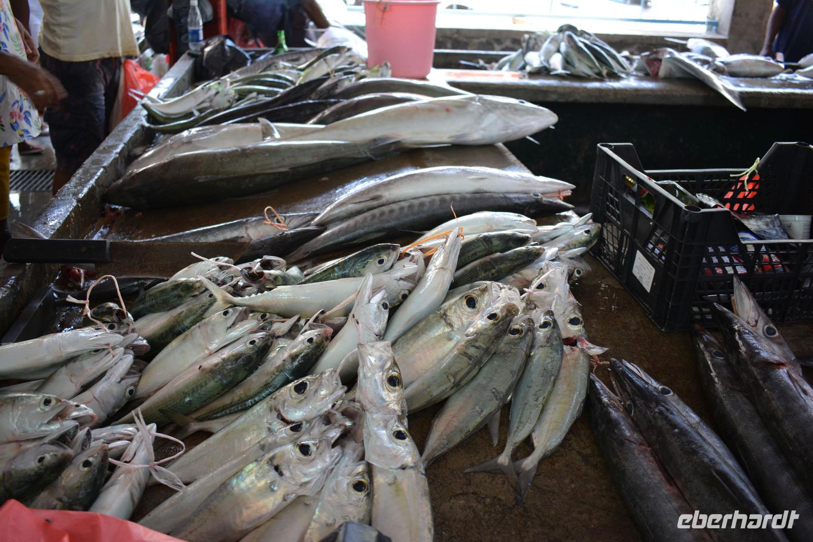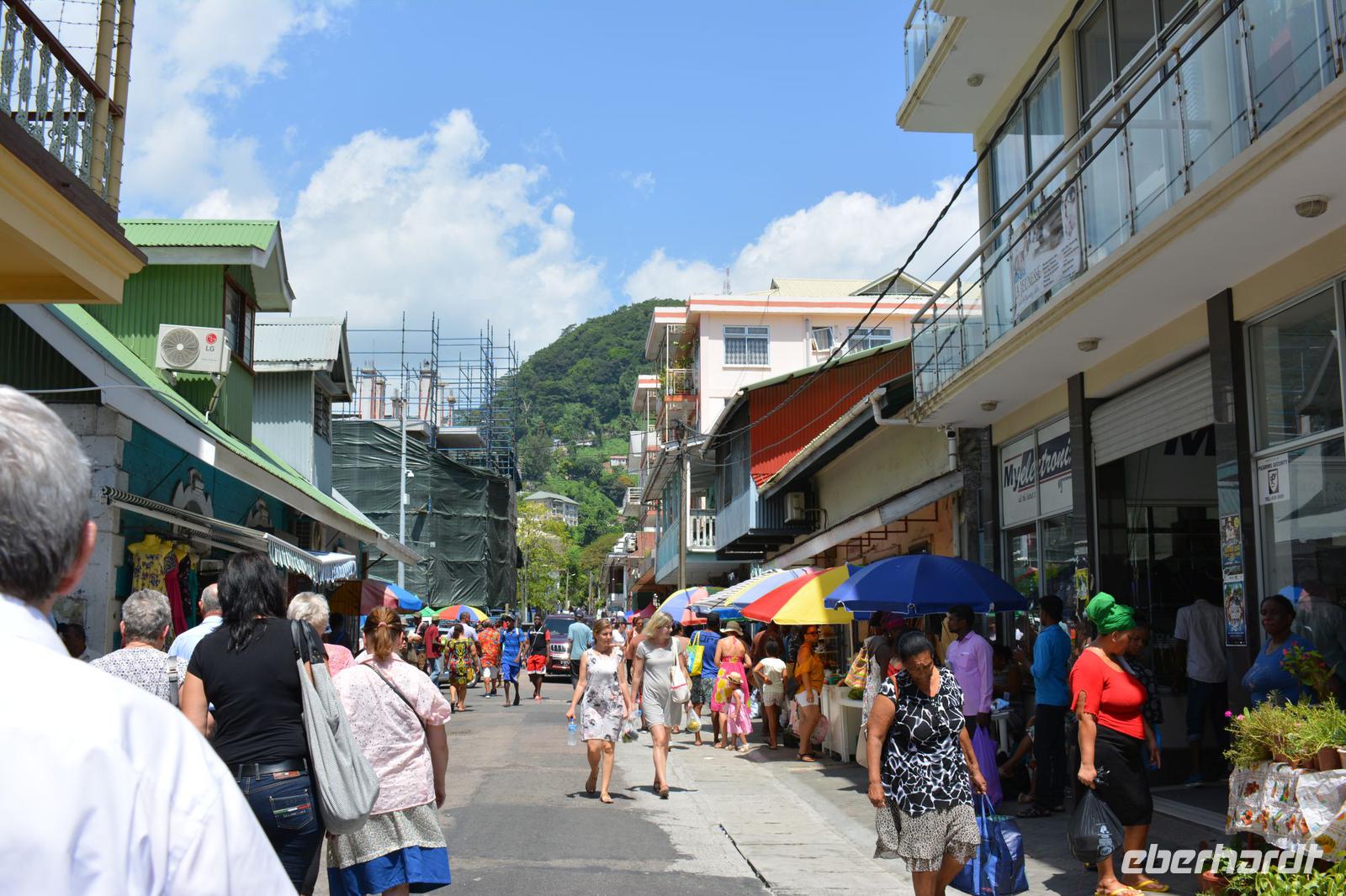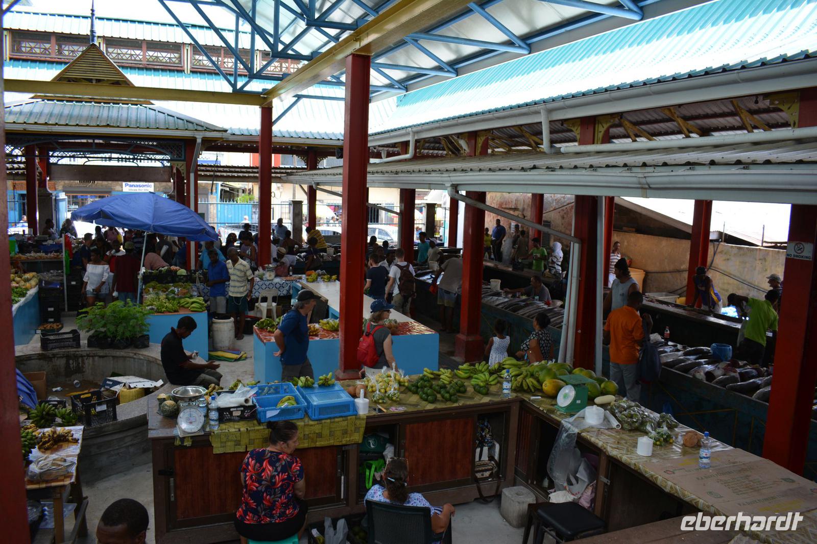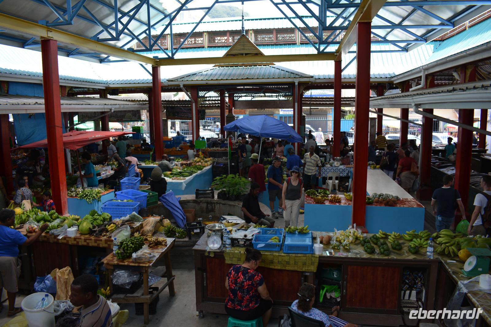 Nach einem kleinen Snack und dem ersten frisch gepressten Saft im Restaurant, zeigt uns Cyril die Hauptstadt Victoria. „Die kleinste Hauptstadt der Welt" wird sie genannt. In der Markthalle ist viel Trubel, die Einheimischen kaufen ein und viele Touristen wollen sich die verschiedenen Früchte und das Angebot der Fische anschauen. Leider muss viel Obst und Gemüse importiert werden, schade.