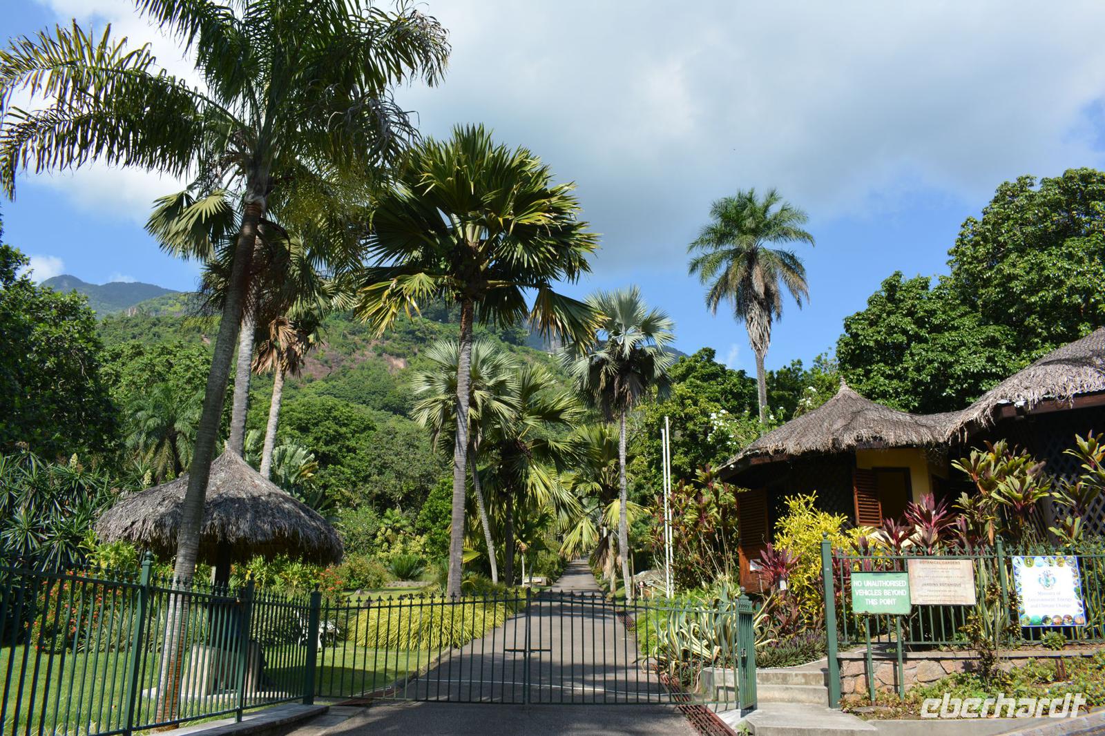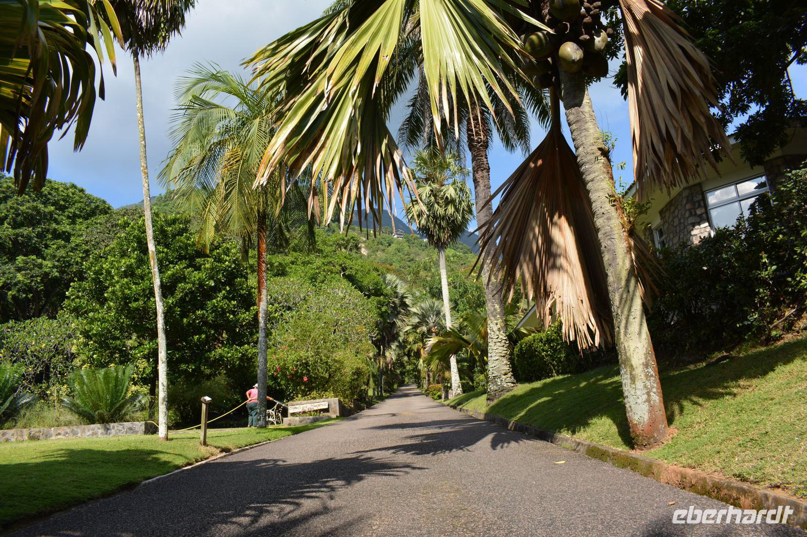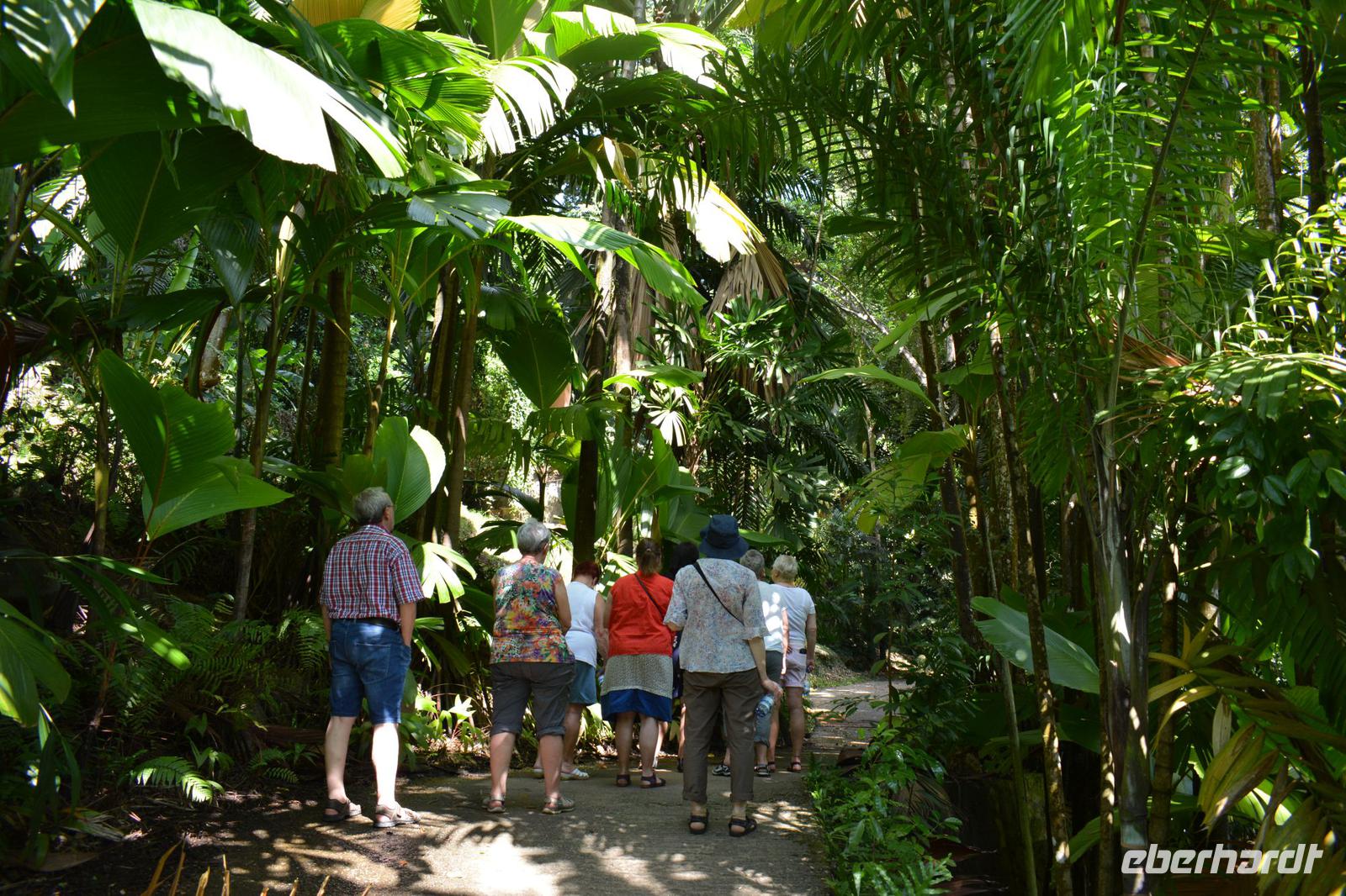 Unser Tag startet mit einer Inselrundfahrt auf Mahé. Als erstes wollen wir in den botanischen Garten, hier ist es kurz nach neun noch sehr ruhig und unter den großen Palmen auch noch sehr angenehm. Cyril erklärt uns viele von den Bäumen und Pflanzen und lässt die Reisegruppe auch raten, um welche Art es sich handelt. Entweder die Gewächse stehen gerade in voller Blüte oder tragen leckere Früchte. So haben die Seychellos das ganze Jahr über leckere Früchte. Die Regenzeit ist auch noch nicht lange vorbei, daher ist auch noch alles schön grün. Hoch in den Bäumen sehen wir viele Flughunde die ihre Nachtruhe halten.
