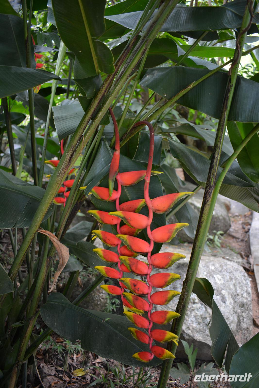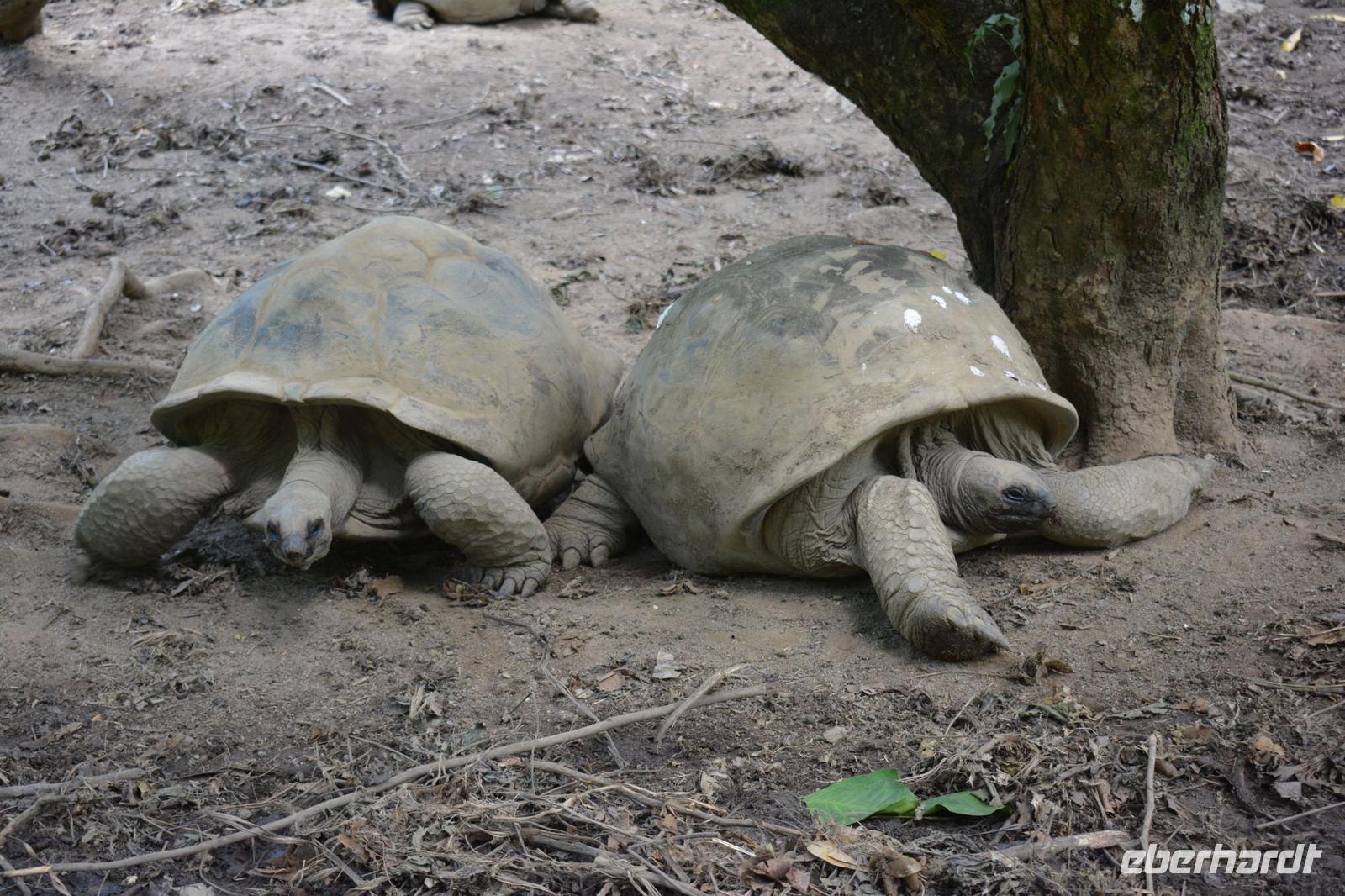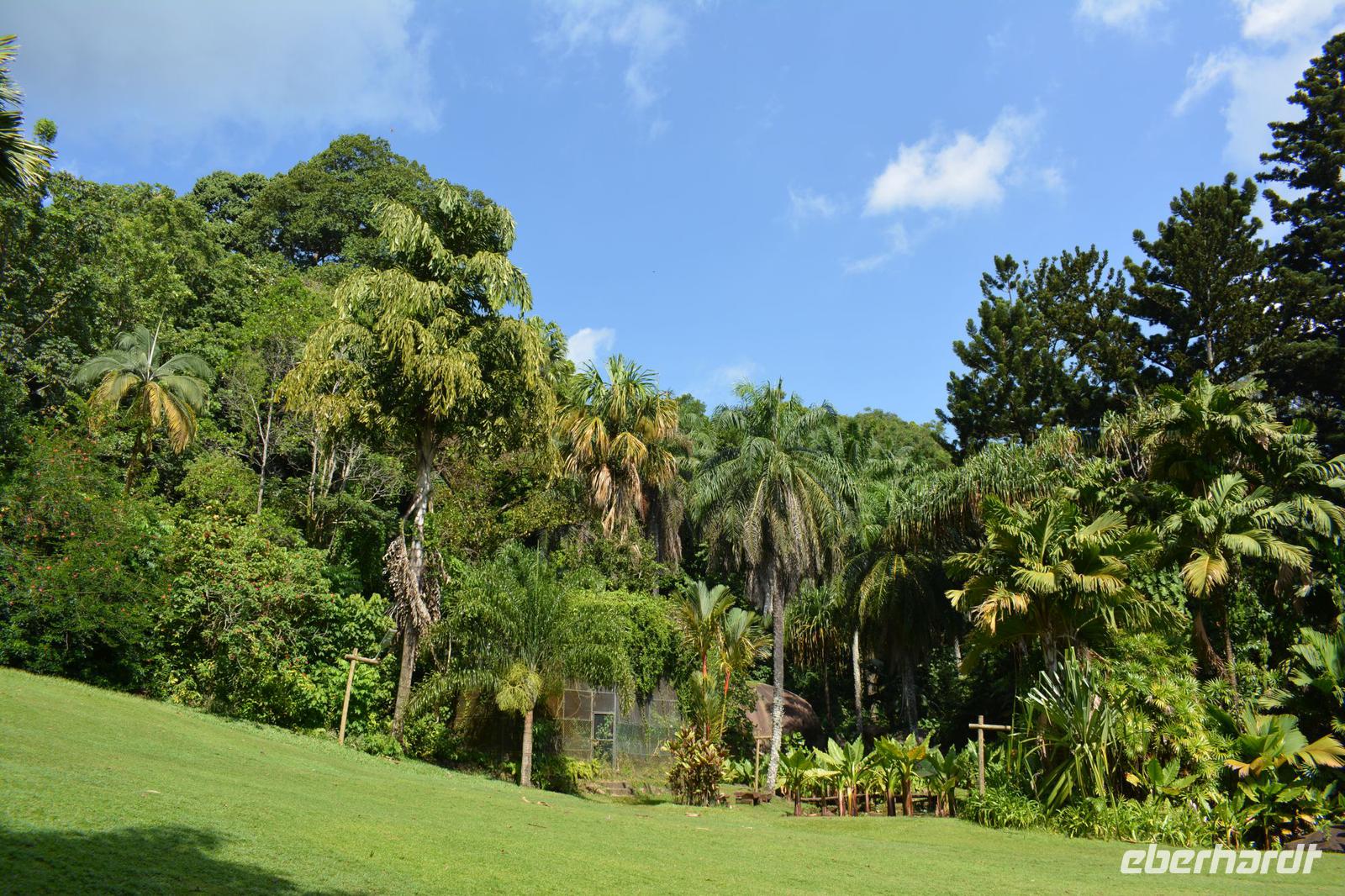 Unser Tag startet mit einer Inselrundfahrt auf Mahé. Als erstes wollen wir in den botanischen Garten, hier ist es kurz nach neun noch sehr ruhig und unter den großen Palmen auch noch sehr angenehm. Cyril erklärt uns viele von den Bäumen und Pflanzen und lässt die Reisegruppe auch raten, um welche Art es sich handelt. Entweder die Gewächse stehen gerade in voller Blüte oder tragen leckere Früchte. So haben die Seychellos das ganze Jahr über leckere Früchte. Die Regenzeit ist auch noch nicht lange vorbei, daher ist auch noch alles schön grün. Hoch in den Bäumen sehen wir viele Flughunde die ihre Nachtruhe halten.