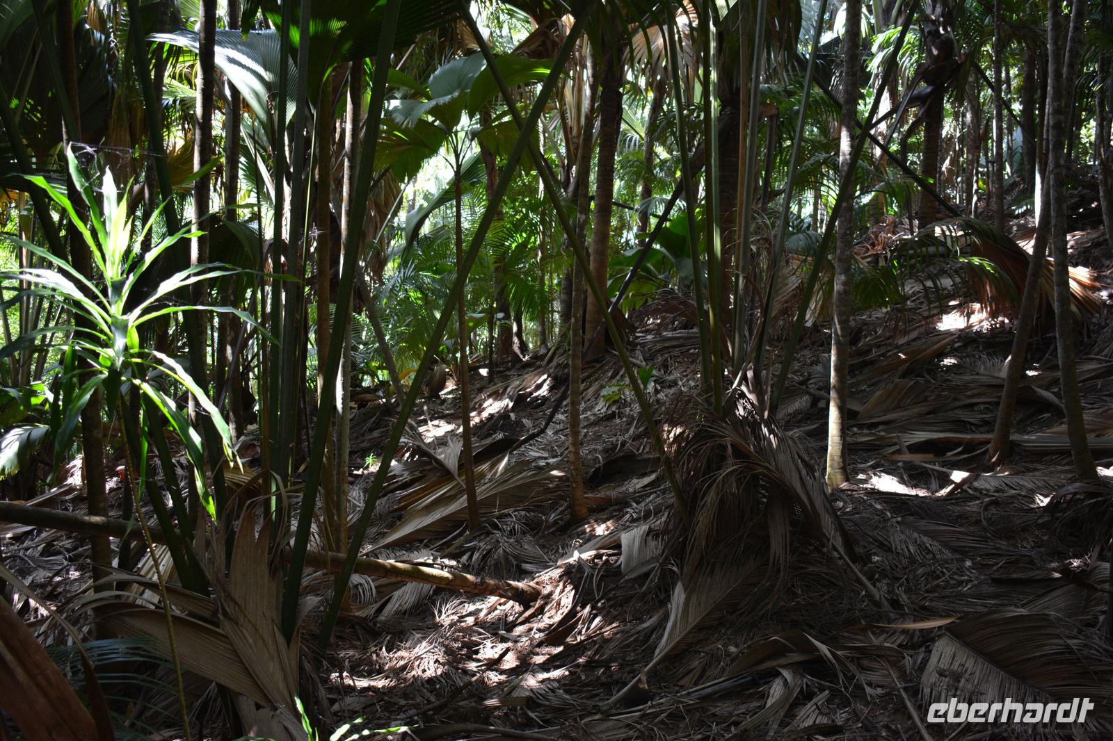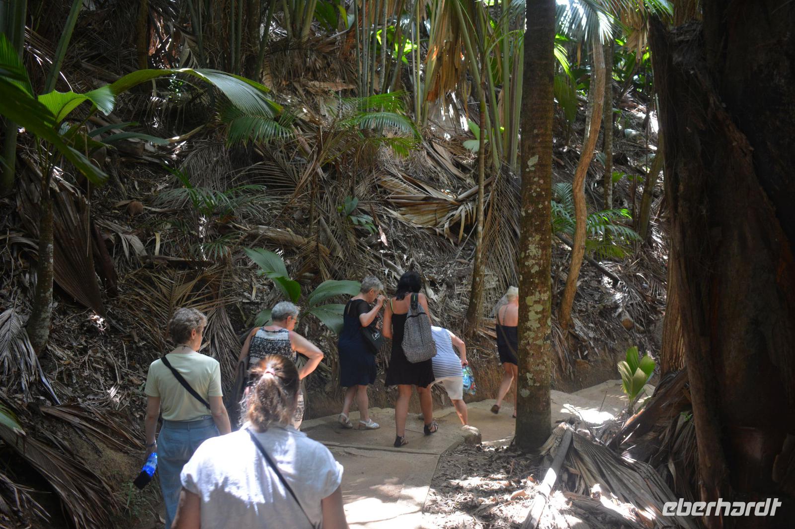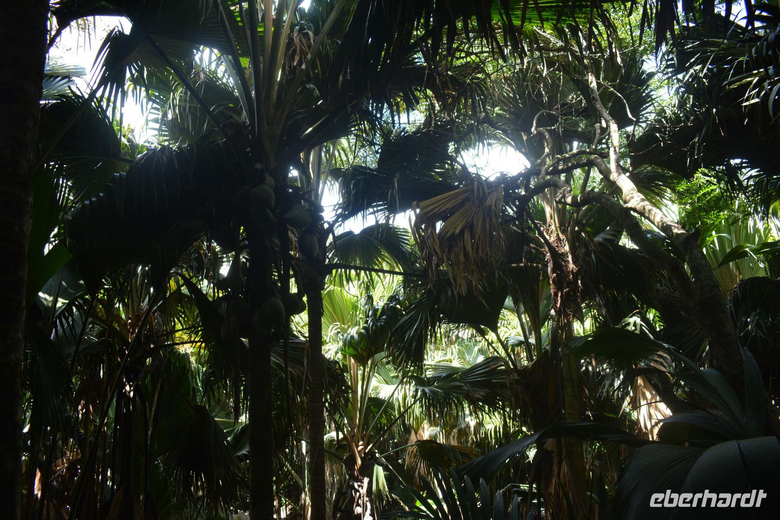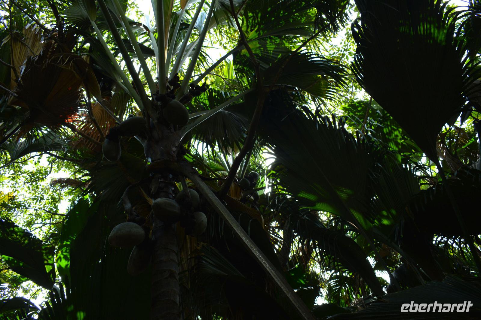 Mitten durch den Palmenwald geht es durch La Digue zum Vallee De Mai. Die traditionelle Heimat der Coco de Mer steht bereits seit 1983 auf der Liste des UNESCO-Weltkulturerbe. Außerdem besonders ist hier das Vorkommen des schwarzen Papagei. Entlang schmaler Wege gesäumt von den sieben verschiedenen Palmenarten bahnen wir uns den Weg durch den Park. Hier werden nur die Wege sauber gehalten. Alle Pflanzenabfälle bleiben unter den Palmen als Dünger liegen.Den seltenen schwarzen Papagei haben wir leider nicht gesehen. Dafür viele Coco de Mer hoch oben in den Palmenkronen. Kleine Bäche fließen durch den Park, Cyril erzählt uns, dass man sich mit dem Bachwasser und der rechten Hand das Gesicht waschen soll und sich dabei etwas wünschen soll, dieser Wunsch soll in Erfüllung gehen.
