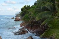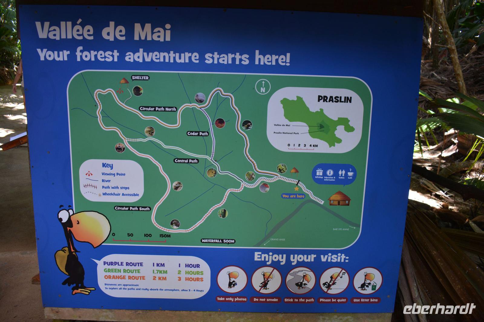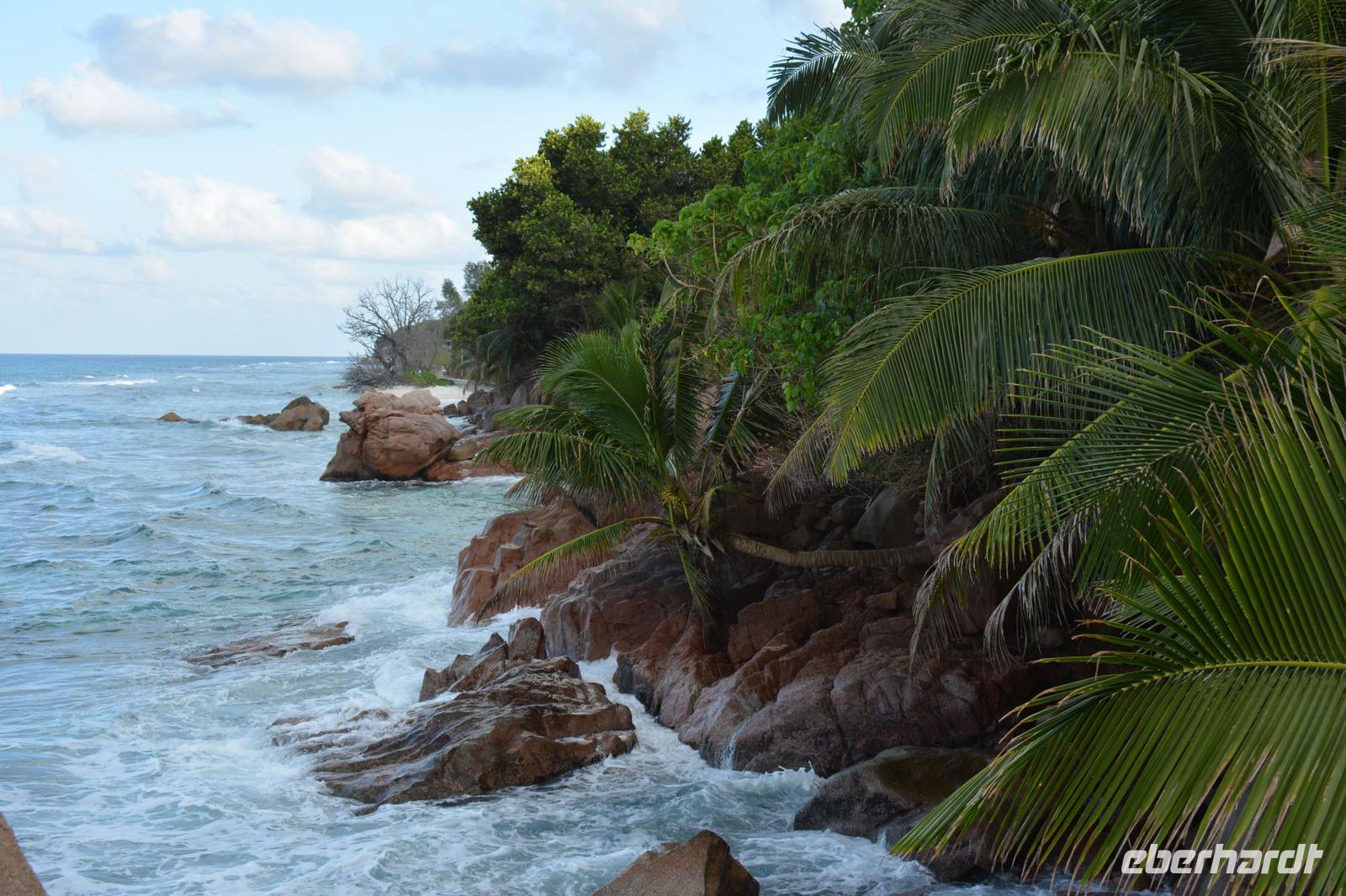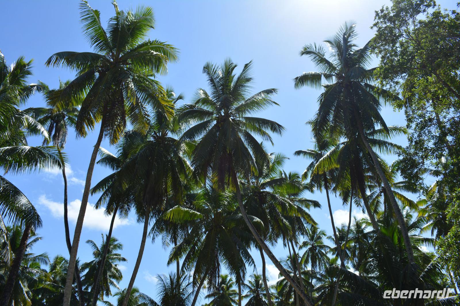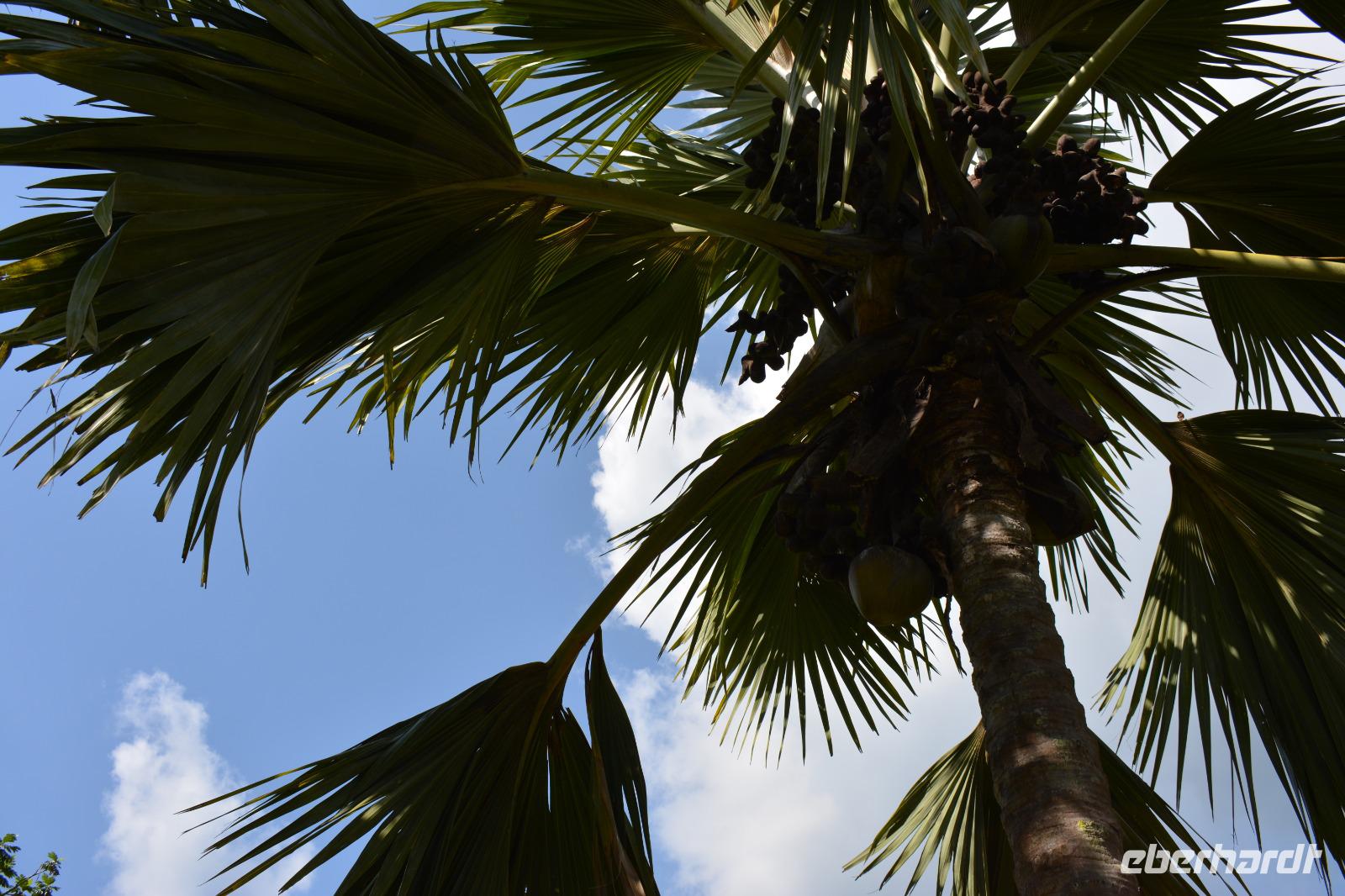 Mitten durch den Palmenwald geht es durch La Digue zum Vallee De Mai. Die traditionelle Heimat der Coco de Mer steht bereits seit 1983 auf der Liste des UNESCO-Weltkulturerbe. Außerdem besonders ist hier das Vorkommen des schwarzen Papagei. Entlang schmaler Wege gesäumt von den sieben verschiedenen Palmenarten bahnen wir uns den Weg durch den Park. Hier werden nur die Wege sauber gehalten. Alle Pflanzenabfälle bleiben unter den Palmen als Dünger liegen.Den seltenen schwarzen Papagei haben wir leider nicht gesehen. Dafür viele Coco de Mer hoch oben in den Palmenkronen. Kleine Bäche fließen durch den Park, Cyril erzählt uns, dass man sich mit dem Bachwasser und der rechten Hand das Gesicht waschen soll und sich dabei etwas wünschen soll, dieser Wunsch soll in Erfüllung gehen.