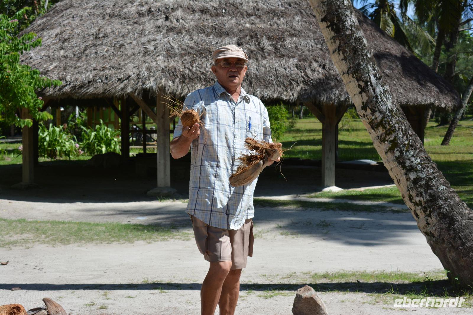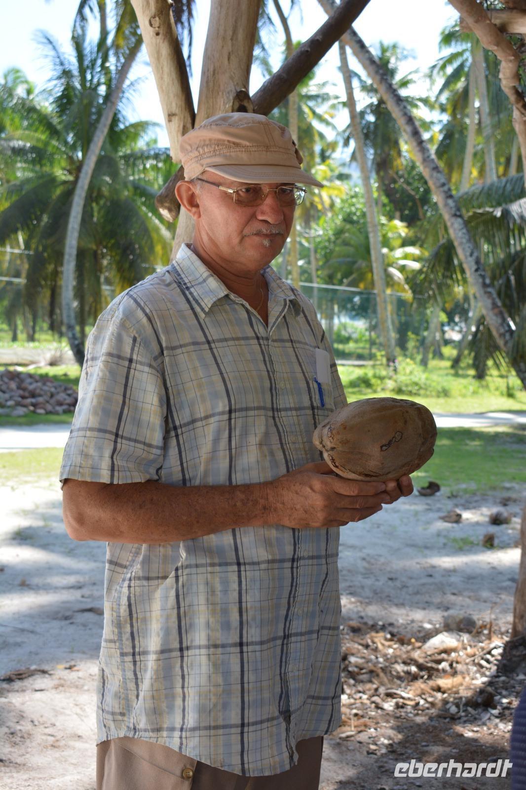 Nach dem reichhaltigen Frühstück mit vielen frischen Früchten und individuell zubereiteten Eierspeisen holt uns Romeo wieder mit seinen umgebauten Laster am Hotel ab. Zuerst fahren wir entlang der östlichen Küste bis zum Ende der befahrbaren Straße. Hier entstehen neue Hotels und Restaurants. Zurück geht es zum nördlichsten Punkt, wo unser Hotel steht, weiter an der westlichen Seite von La Digue. Unser Ziel für den Vormittag ist die Kokosnussplantage.Cyril zeigt uns, wie Kokosnüsse geschält und anschließend geknackt werden. Das sieht geübt aus! Natürlich dürfen wir im Anschluss auch kosten.