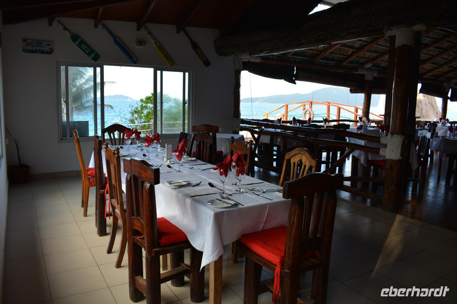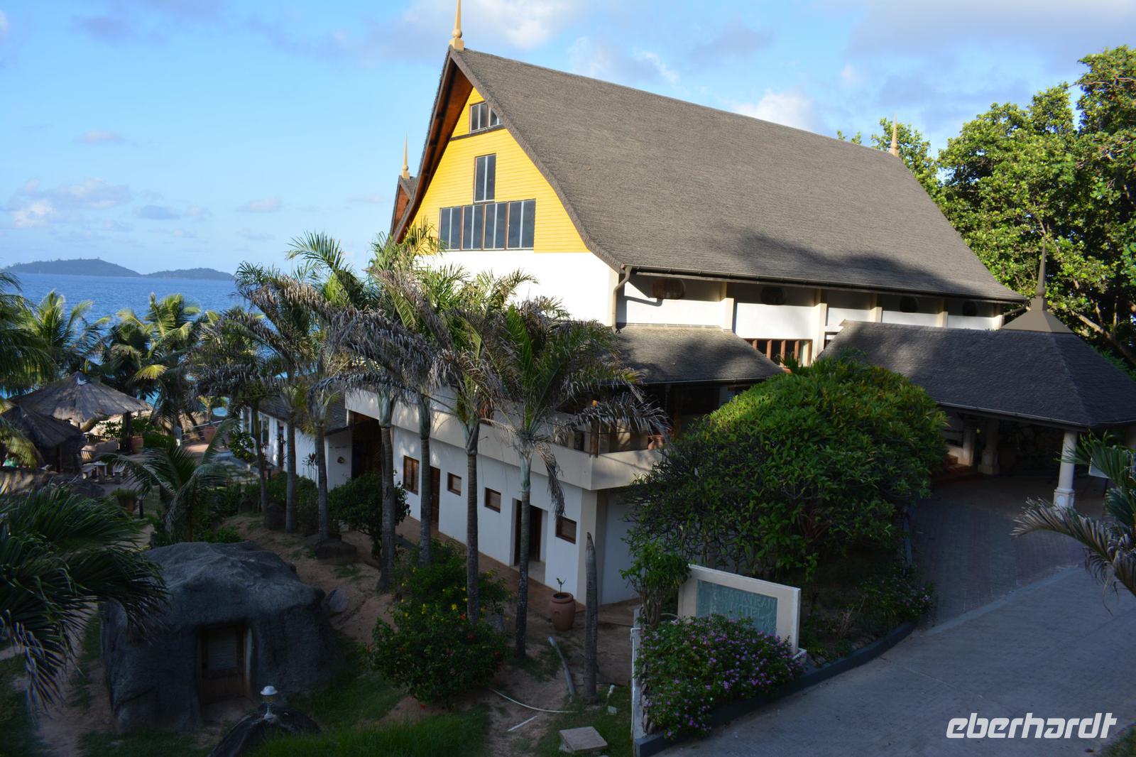 Nach dem Rundgang im Vallee de Mai fahren wir auf die westliche Seite von Praslin. Dort schauen wir uns vom Bus aus den kleinen Flughafen an und fahren entlang des Grande Anse, bevor wir zum Mittagessen im Britannia Hotel zum Mittagessen einkehren. Nur für uns wird dort ein kleines Buffet mit kreolischen Spezialitäten aufgebaut.