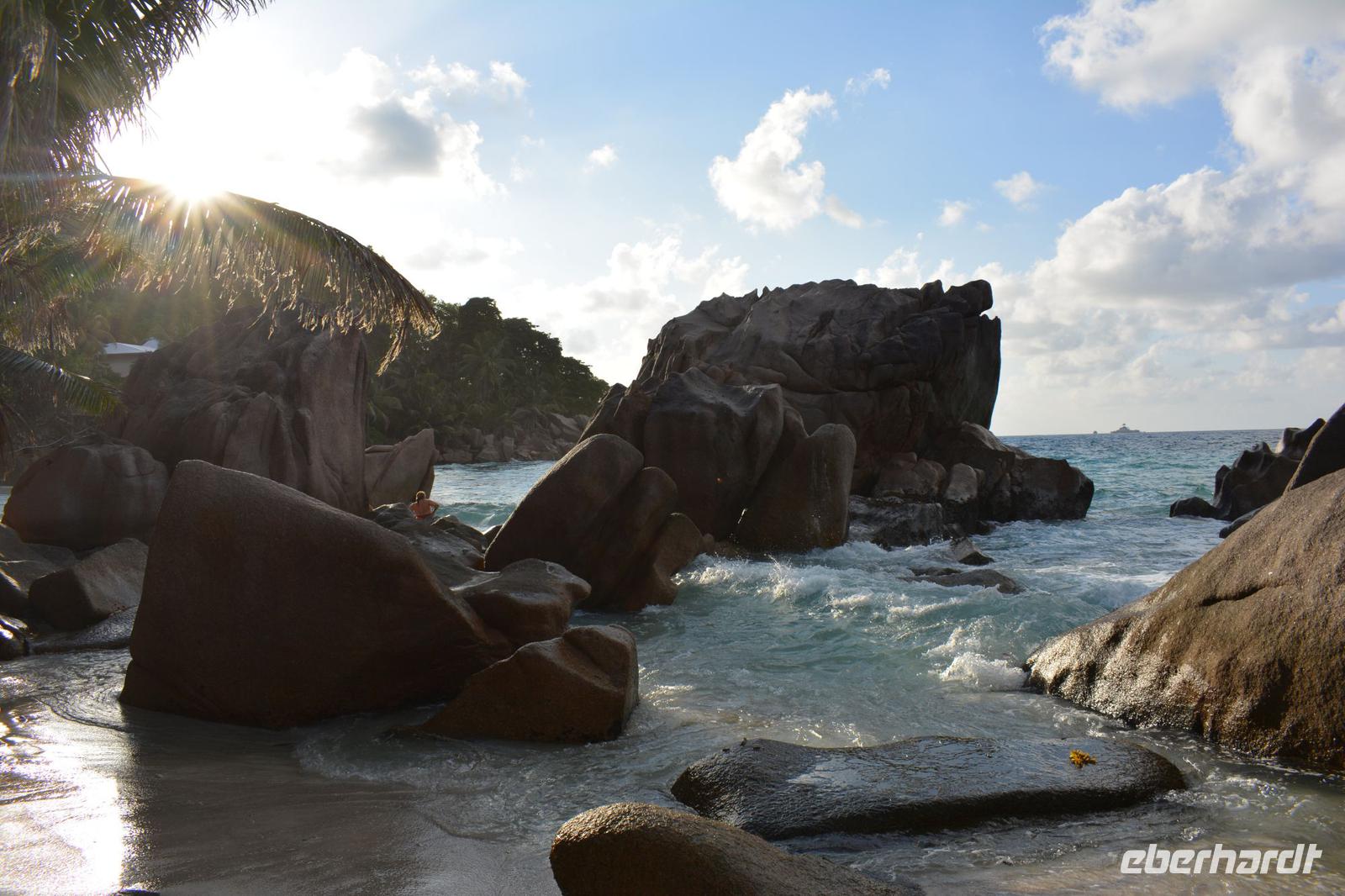 Leider gibt es am Strand keinen Schatten und so entscheiden wir uns an den Anse Source d'Argent zurück zu fahren und dort den restlichen Nachmittag zu verbringen.