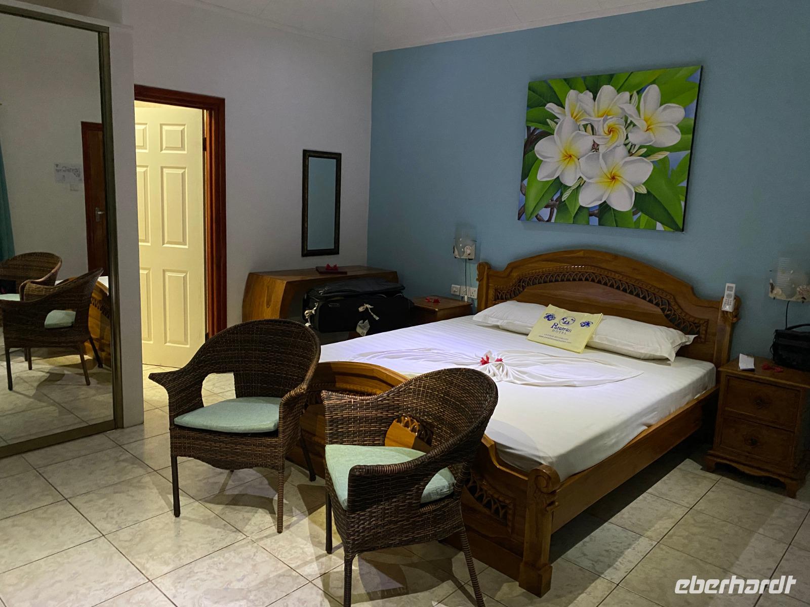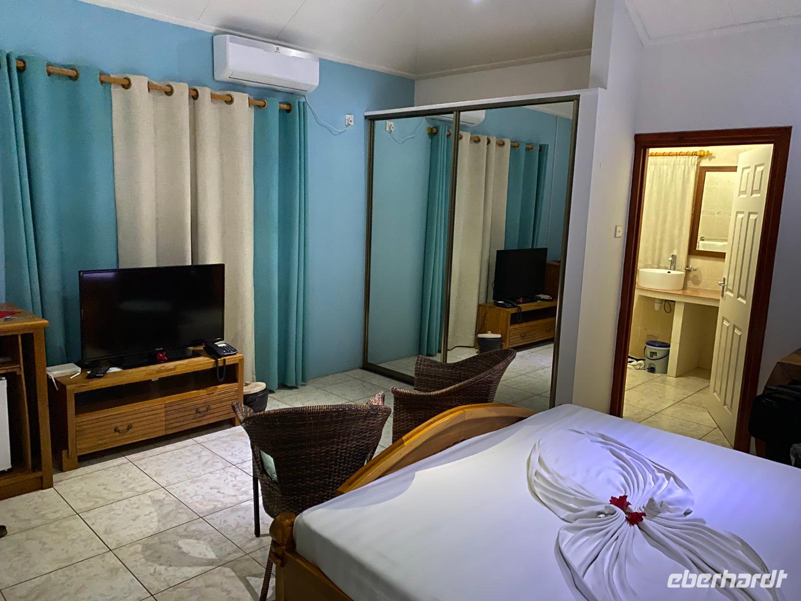 Unser Fahrer Romeo bringt uns in das „Patatran Hotel", wo wir die nächsten fünf Nächte verbringen werden. Nach dem Check-in und einem Begrüßungsgetränk beziehen wir unsere Zimmer und treffen uns kurze Zeit später zum Abendessen.