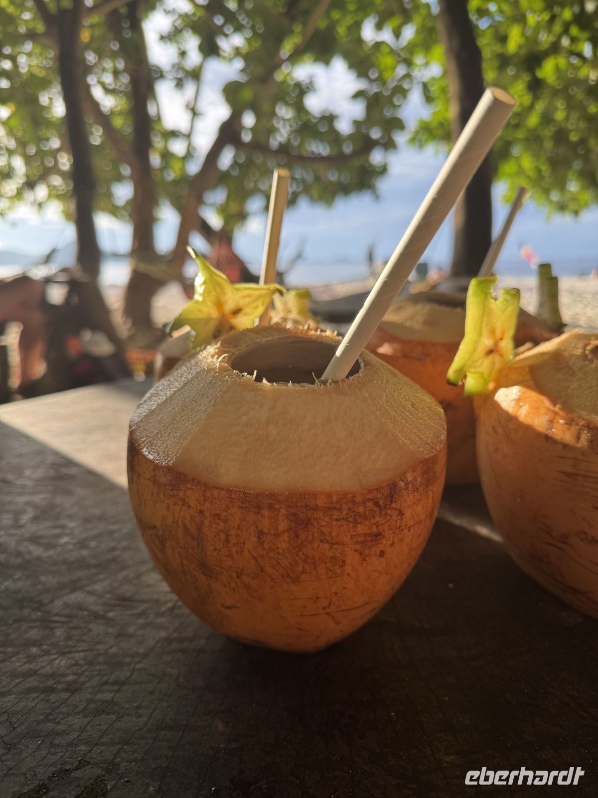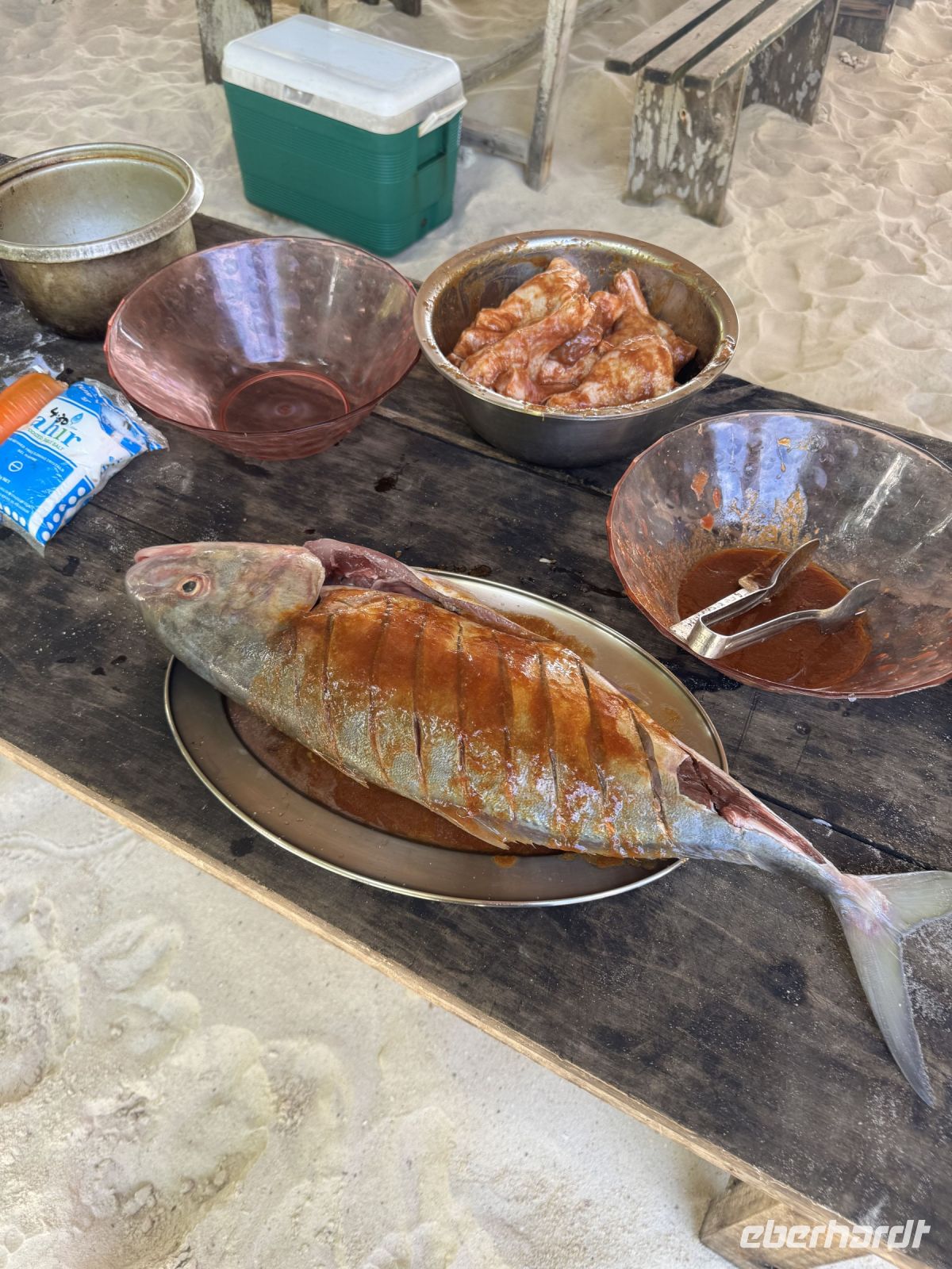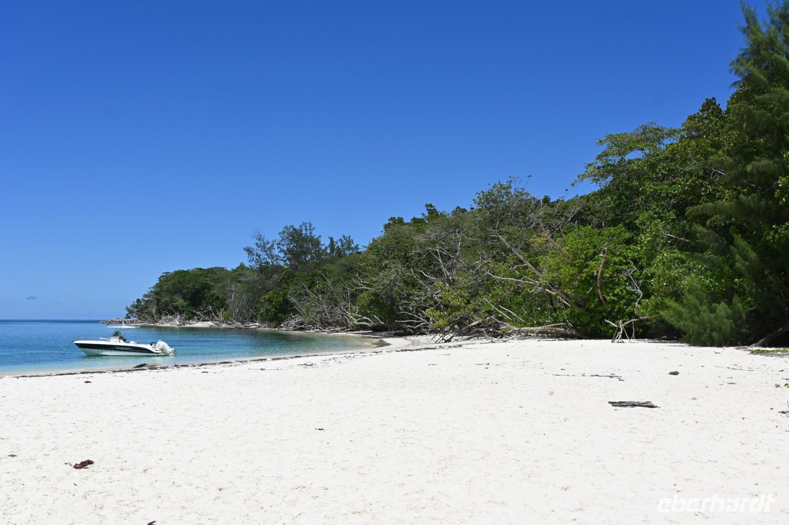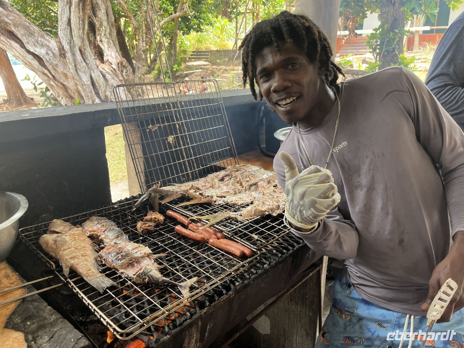 Unser Tag startet so wie gestern, nur mit etwas Nieselregen von oben. Sobald wir an Bord gehen, hat dieser sich aber wieder verzogen. Von unserem Hotel können wir bereits unser heutiges Ziel sehen, es geht zur Nachbarinsel Grand Soeur - der großen Schwester. Direkt vor dem Strand ist ein großes Riff, dass wir mit unserem Boot nicht überqueren können, daher müssen wir in ein kleineres Boot umsteigen. Die Crew hat bereits den frischen Fisch vom Markt geholt und macht sich bei Ankunft an Land, direkt an die Zubereitung des Mittagessens. Wir entdecken derweilen die Insel, freunden uns mit den Schildkröten an und gehen schnorcheln. Leider ist aktuell Ebbe und man muss vorsichtig sein, nicht mit den Korallen in Berührung zu kommen.