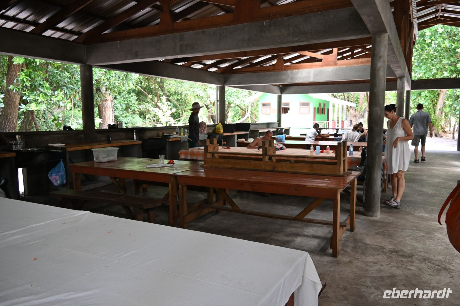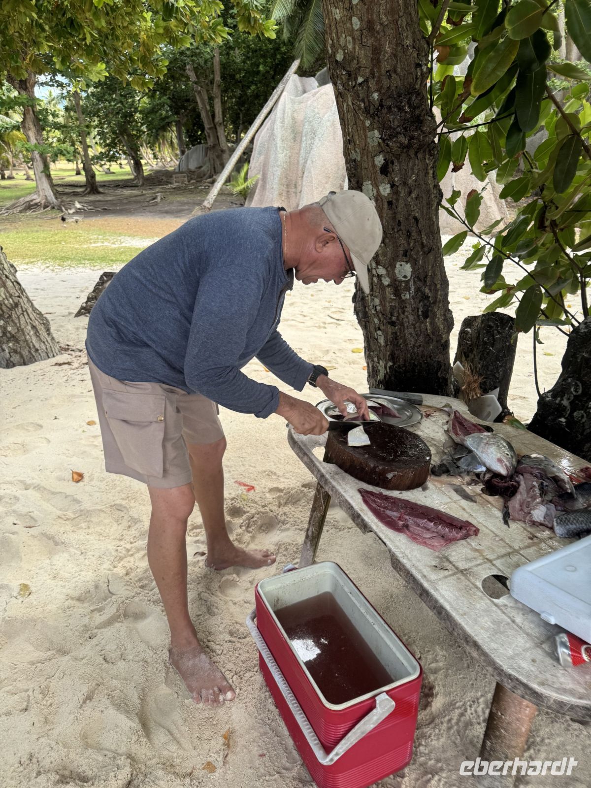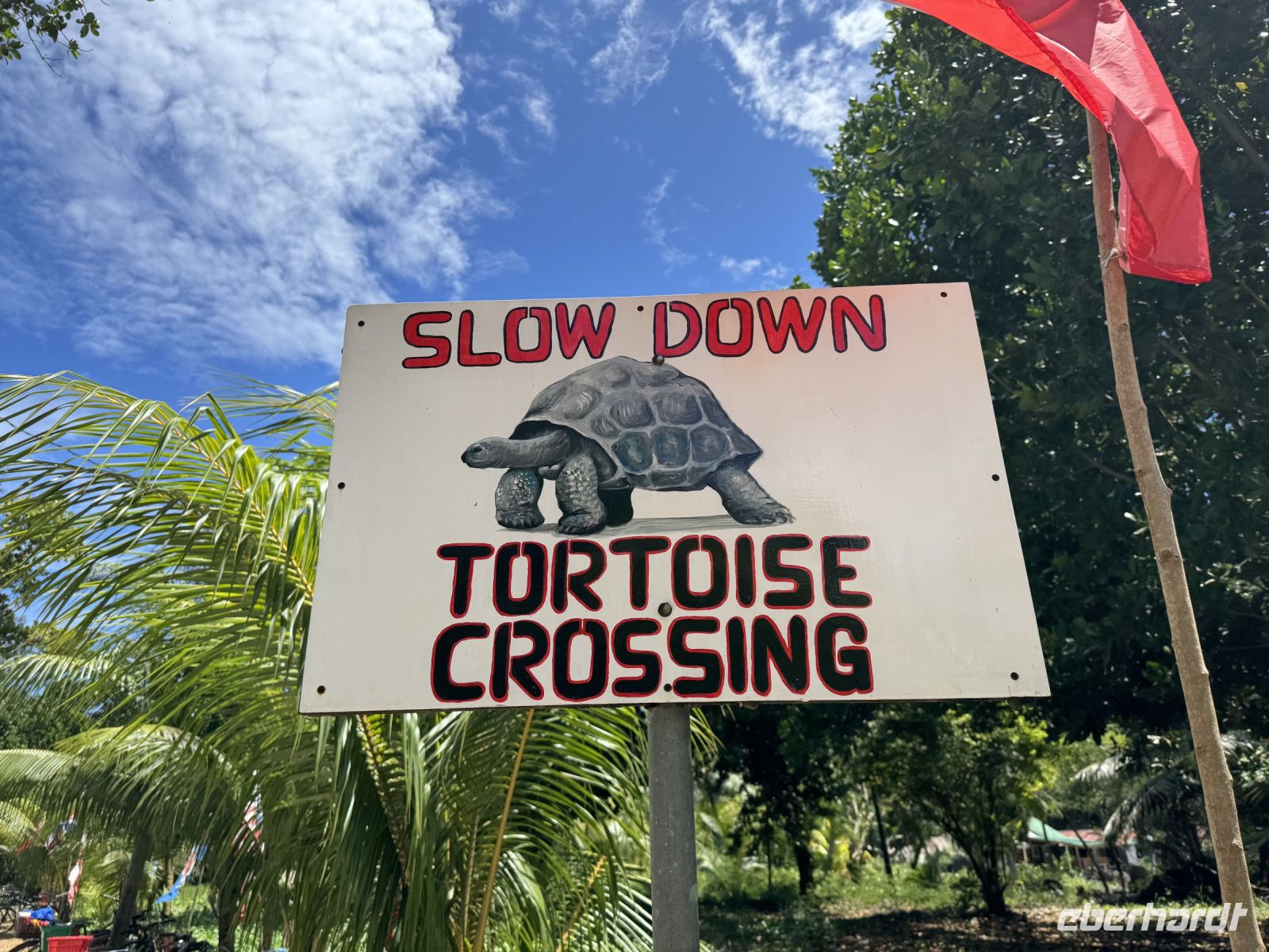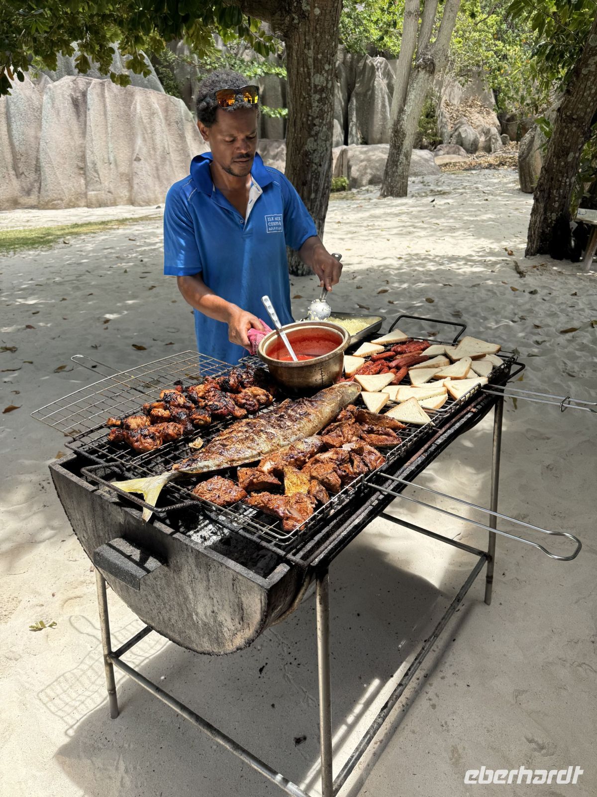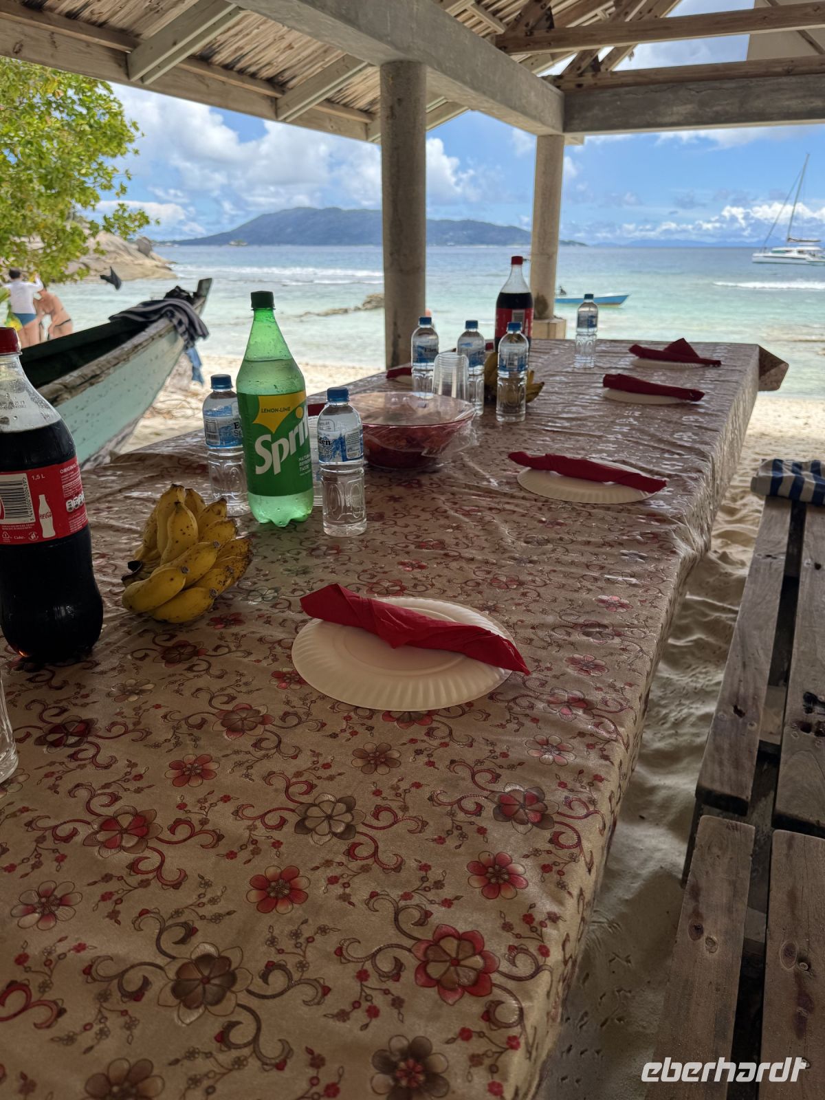 Pünktlich 12.30 Uhr ist unser Mittagessen fertig. Es gibt gegrillten Fisch, Hähnchen und Würstchen, dazu Kartoffelsalat, Reis und Rohkost. Unser Nachtisch, bestehend aus Bananen, wird teilweise an die neugierige Schildkröte verfüttert, die die meiste Zeit in unser Nähe verbracht hat. Da das schnorcheln hier am Strand nicht so einfach war, beschließen wir den Nachmittag an den Schnorchelstopps an den Inseln Coco und Felicite zu verbringen.