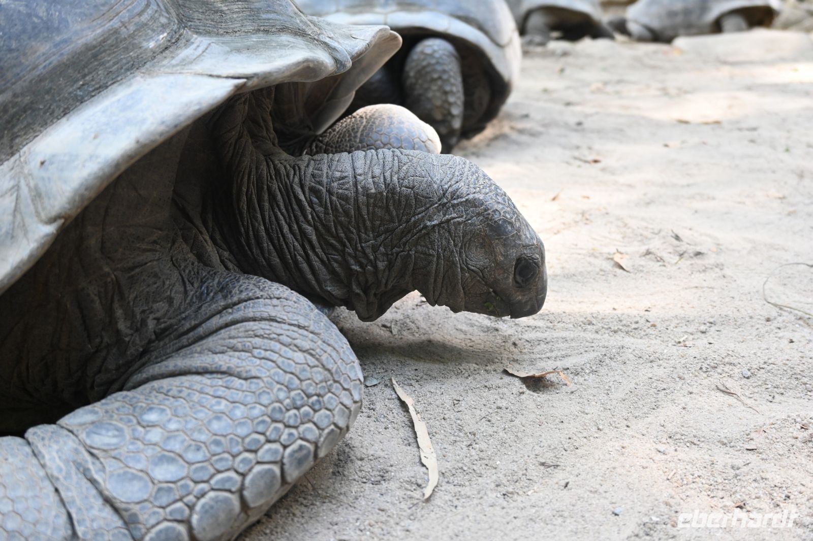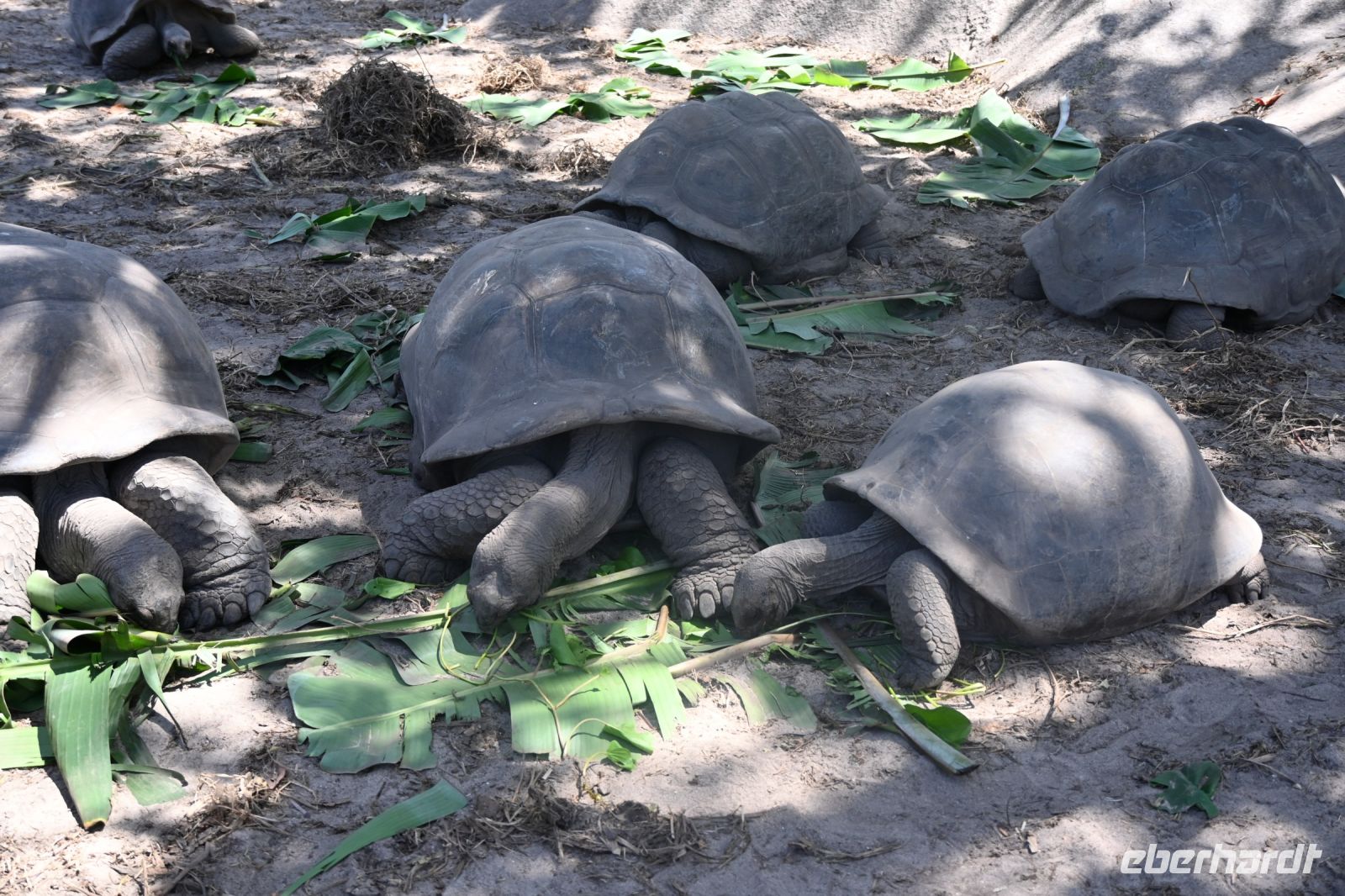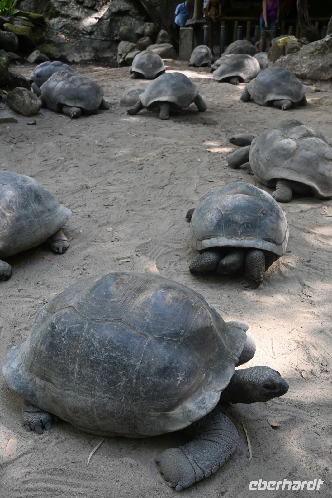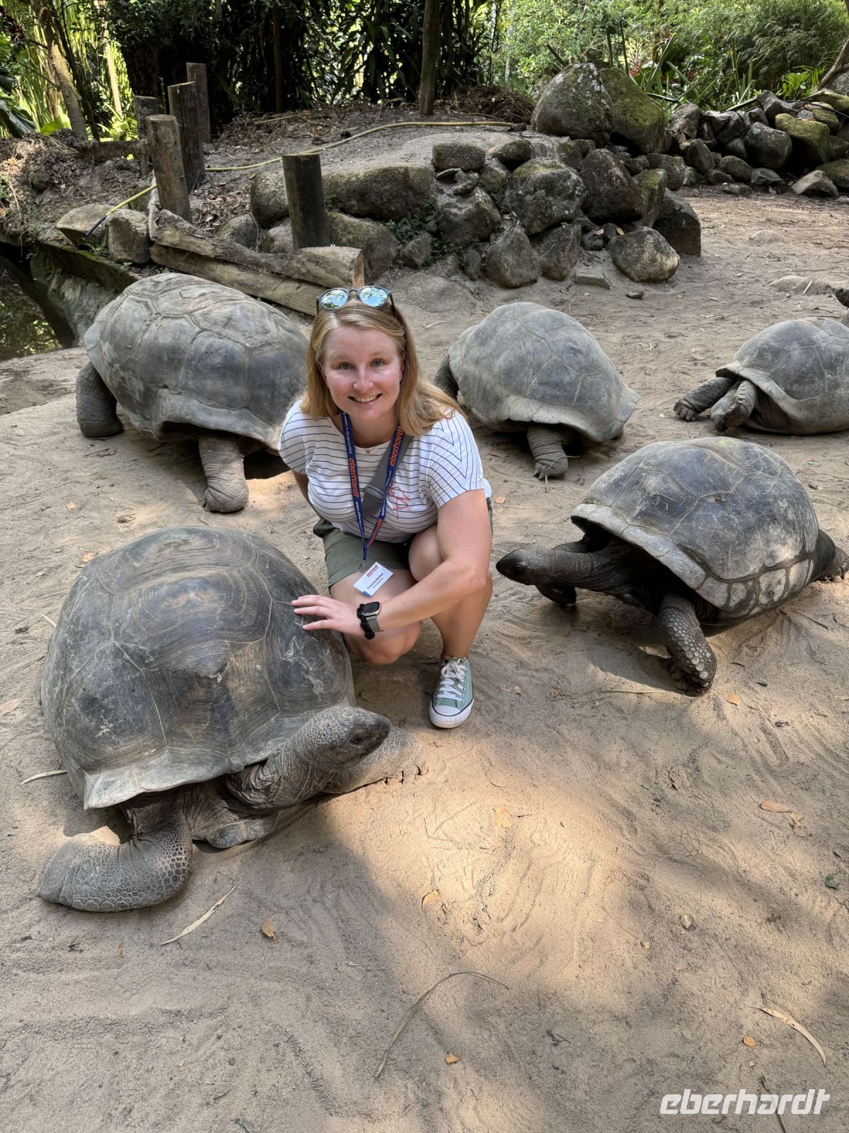 Die Insel haben wir bereits gut zu Fuß und mit dem Wagen erkundet, daher geht es für uns jetzt aufs Wasser. Die Bade- und Schnorchelsachen sind gepackt und als wir am Hafen ankommen, legt auch gerade unser Boot an. Der Schreck ist anfangs etwas groß, da wir daran zweifeln, dass wir alle Platz haben. Sobald wir losfahren, uns der Wind um Nase und Ohren weht und wir eine tolle Aussicht haben, sind alle Sorgen vergessen. Nach 30 Minuten landen wir auf der Insel Curieuse. Am Anse St. José leg unser Boot an und wir haben Zeit zum Schnorcheln. Da einige von uns zum ersten Mal schnorcheln, ist hier ein schöner Platz zum Üben. Gleich hinter dem Strand wird schon unser Mittagessen vorbereitet. Von 1833 bis zur Mitte des 20. Jahrhundert gab es hier eine Quarantänestation für Leprakranke, nur noch das ehemalige Arzthaus, ein französischer Kolonialbau, erinnert heute noch daran. Das Gebäude wird aktuell renoviert und soll bald ein Museum zur Geschichte der Insel beherbergen. Nach dem Mittagessen bieten sich uns zwei Optionen, wie wir zum Anse Papaie gelangen. Zum einen transferiert uns die Bootscrew bequem dorthin oder man wählt den Weg quer durch die Insel. Der angelegte Wanderweg ist ca. 1,7 Kilometer lang und führt teilweise über Holzbrücken, die quer durch den Mangrovenwald führen. Ebenso entdecken wir viele Meeresschnecken und große Krabben auf dem Weg. In der großen Bucht vor unserem Ziel gab es einst eine große Mauer, die die Bucht vom offenen Meer trennte. In der Bucht wurden Meeresschildkröten gefangen gehalten und später für den Verzehr geschlachtet. Nachdem die Mauer eingestürzt war, gab es keine Renovierung und die Schildkröten konnten wieder freier leben. Nach der traurigen Vergangenheit, ist es jetzt umso schöner, dass am Anse Papaie eine Aufzuchtstation für Landschildkröten errichtet wurde und diese dort ein glückliches Leben führen.