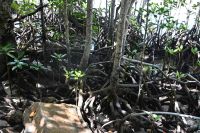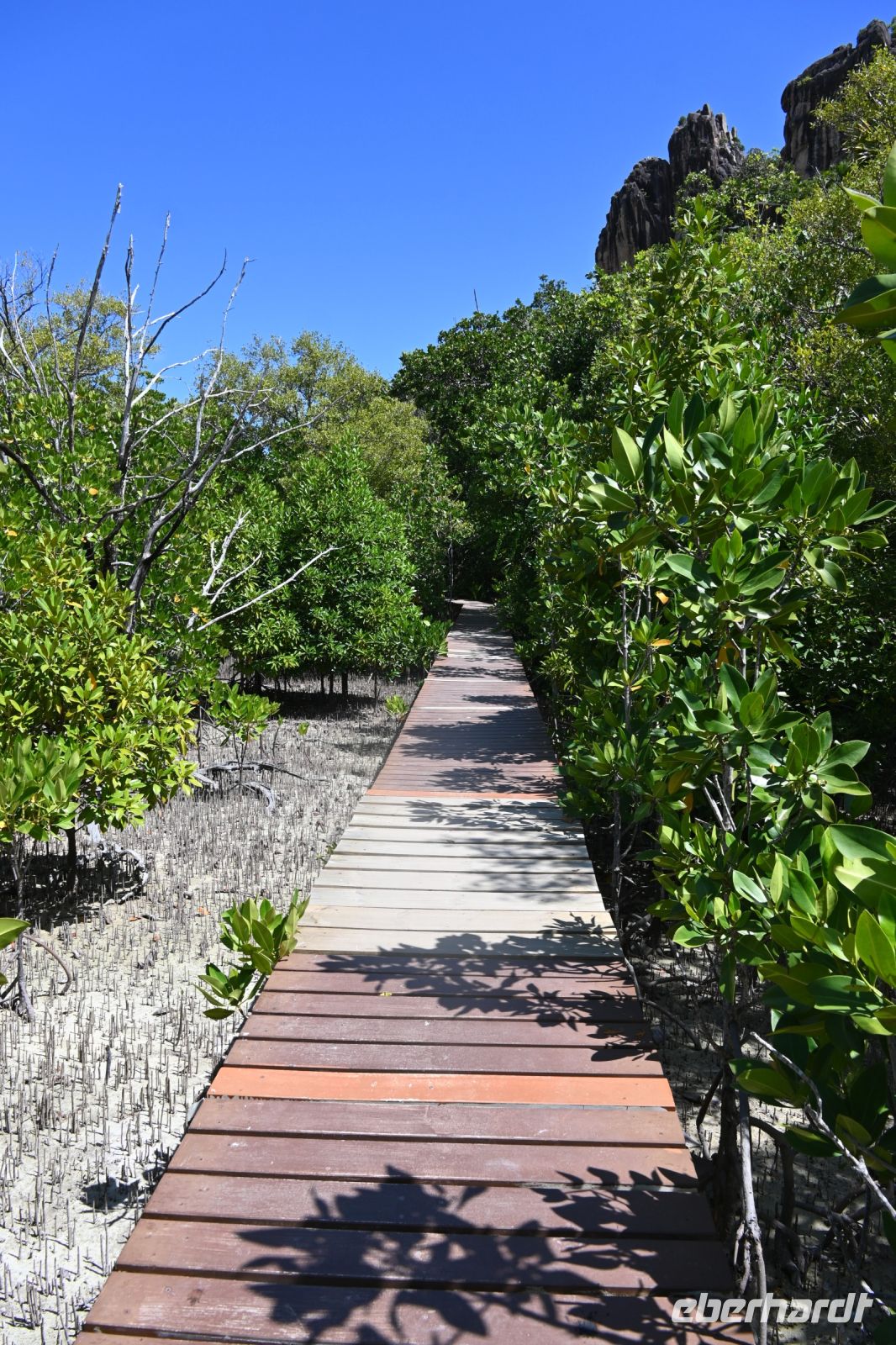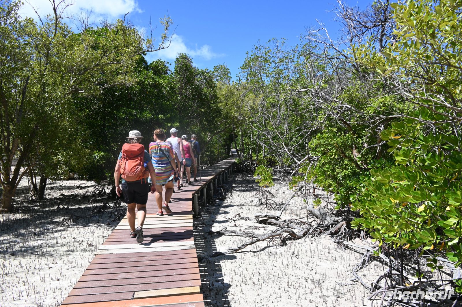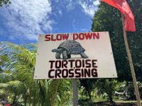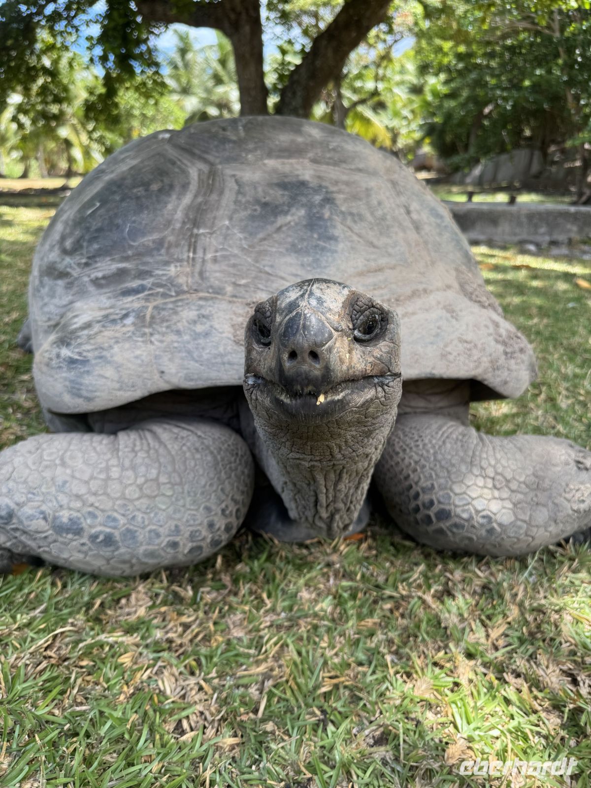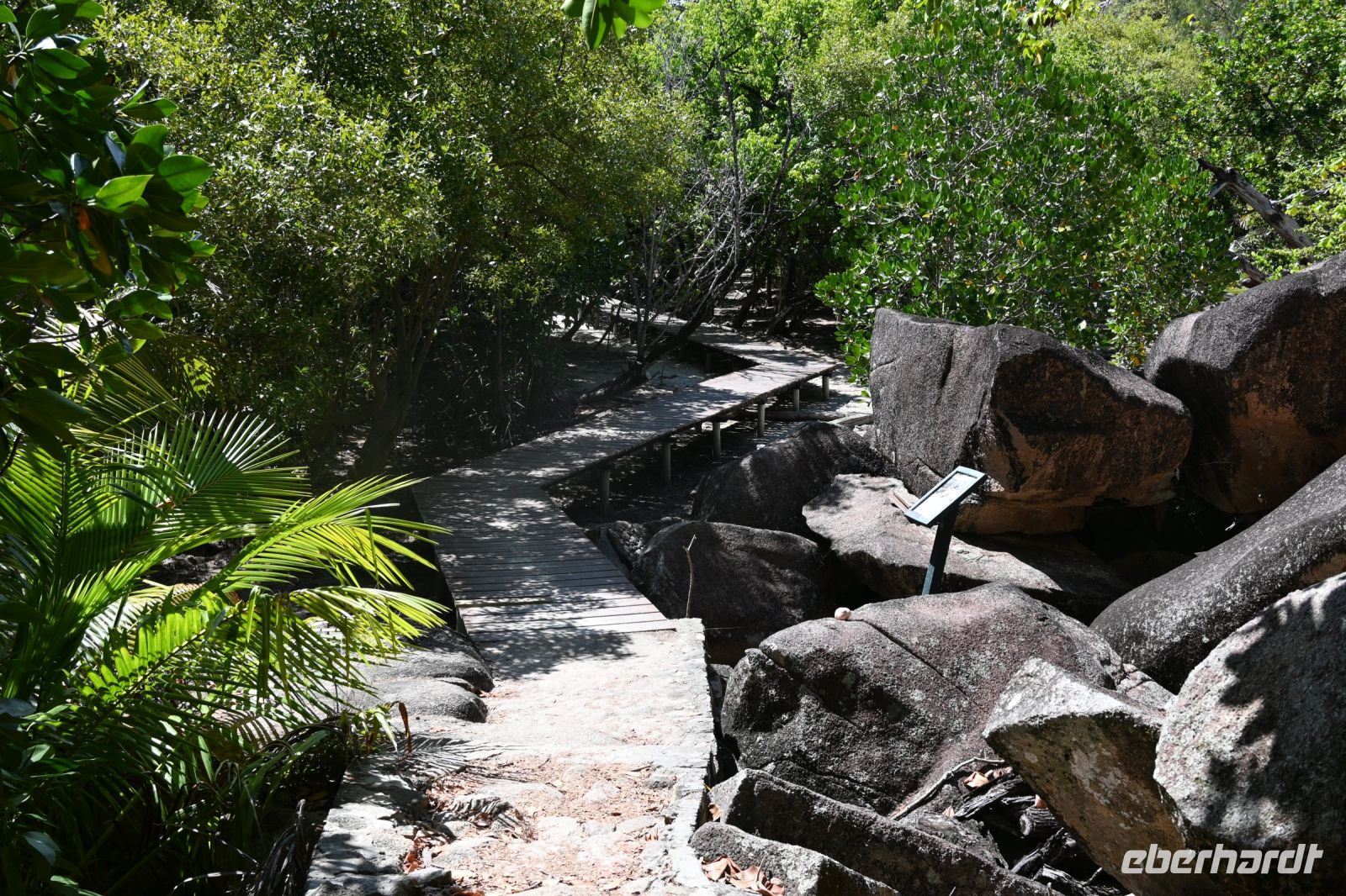 Die Insel haben wir bereits gut zu Fuß und mit dem Wagen erkundet, daher geht es für uns jetzt aufs Wasser. Die Bade- und Schnorchelsachen sind gepackt und als wir am Hafen ankommen, legt auch gerade unser Boot an. Der Schreck ist anfangs etwas groß, da wir daran zweifeln, dass wir alle Platz haben. Sobald wir losfahren, uns der Wind um Nase und Ohren weht und wir eine tolle Aussicht haben, sind alle Sorgen vergessen. Nach 30 Minuten landen wir auf der Insel Curieuse. Am Anse St. José leg unser Boot an und wir haben Zeit zum Schnorcheln. Da einige von uns zum ersten Mal schnorcheln, ist hier ein schöner Platz zum Üben. Gleich hinter dem Strand wird schon unser Mittagessen vorbereitet. Von 1833 bis zur Mitte des 20. Jahrhundert gab es hier eine Quarantänestation für Leprakranke, nur noch das ehemalige Arzthaus, ein französischer Kolonialbau, erinnert heute noch daran. Das Gebäude wird aktuell renoviert und soll bald ein Museum zur Geschichte der Insel beherbergen. Nach dem Mittagessen bieten sich uns zwei Optionen, wie wir zum Anse Papaie gelangen. Zum einen transferiert uns die Bootscrew bequem dorthin oder man wählt den Weg quer durch die Insel. Der angelegte Wanderweg ist ca. 1,7 Kilometer lang und führt teilweise über Holzbrücken, die quer durch den Mangrovenwald führen. Ebenso entdecken wir viele Meeresschnecken und große Krabben auf dem Weg. In der großen Bucht vor unserem Ziel gab es einst eine große Mauer, die die Bucht vom offenen Meer trennte. In der Bucht wurden Meeresschildkröten gefangen gehalten und später für den Verzehr geschlachtet. Nachdem die Mauer eingestürzt war, gab es keine Renovierung und die Schildkröten konnten wieder freier leben. Nach der traurigen Vergangenheit, ist es jetzt umso schöner, dass am Anse Papaie eine Aufzuchtstation für Landschildkröten errichtet wurde und diese dort ein glückliches Leben führen.