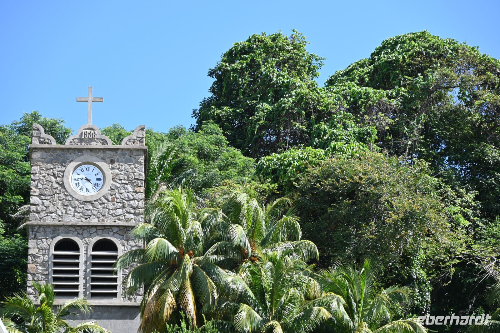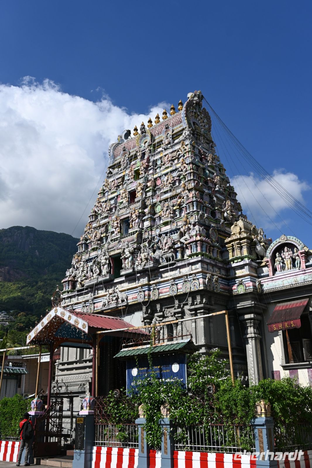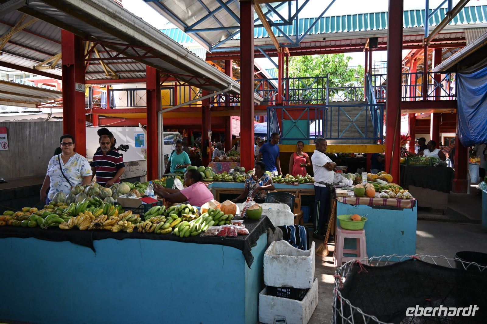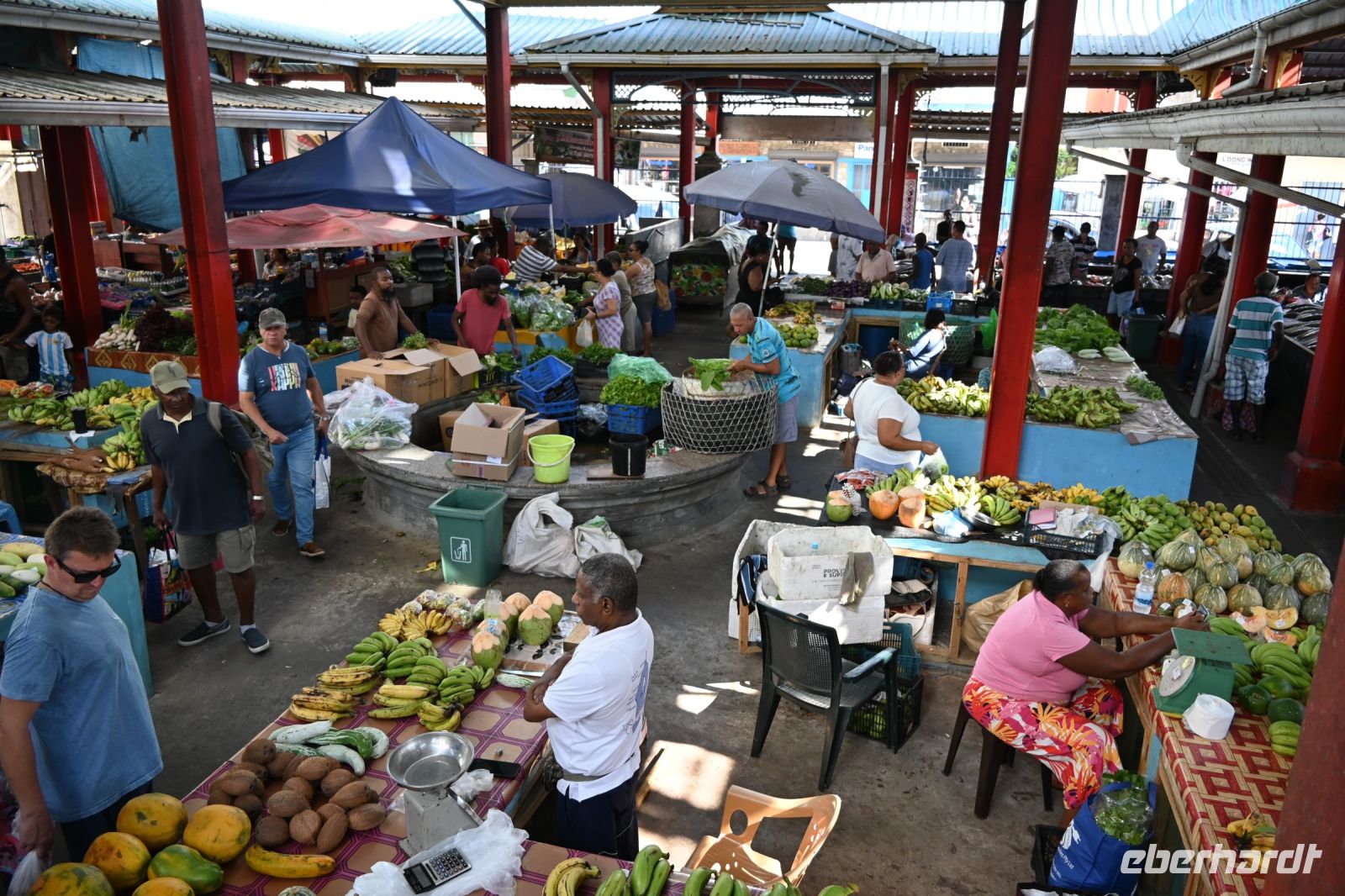 Als wir in die Hauptstadt Victoria fahren, ist es dort immer noch sehr ruhig. Obwohl 90% der Bevölkerung hier auf der Hauptinsel wohnen. Es sind auch nur acht der 115 Inseln bewohnt. Die Einheimischen haben die unterschiedlichsten Abstammungen. Geprägt wurde die Bevölkerung von den französischen Kolonialisten und den afrikanischen Sklaven. Somit gibt es auch die verschiedensten Religionen, die hier friedlich zusammen leben. Auf unserem Rundgang besuchen wir einen Hindu-Tempel, eine anglizistische und eine Katholische Kirche. Das meiste Treiben herrscht heute zum Samstag in der Markthalle. Hier kaufen alle fleißig für das Wochenende ein. Fisch, Obst, Gemüse, Gewürze usw. es gibt alles, was zu einem leckeren kreolischen Essen dazugehört.