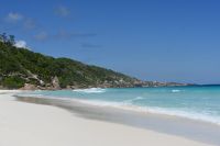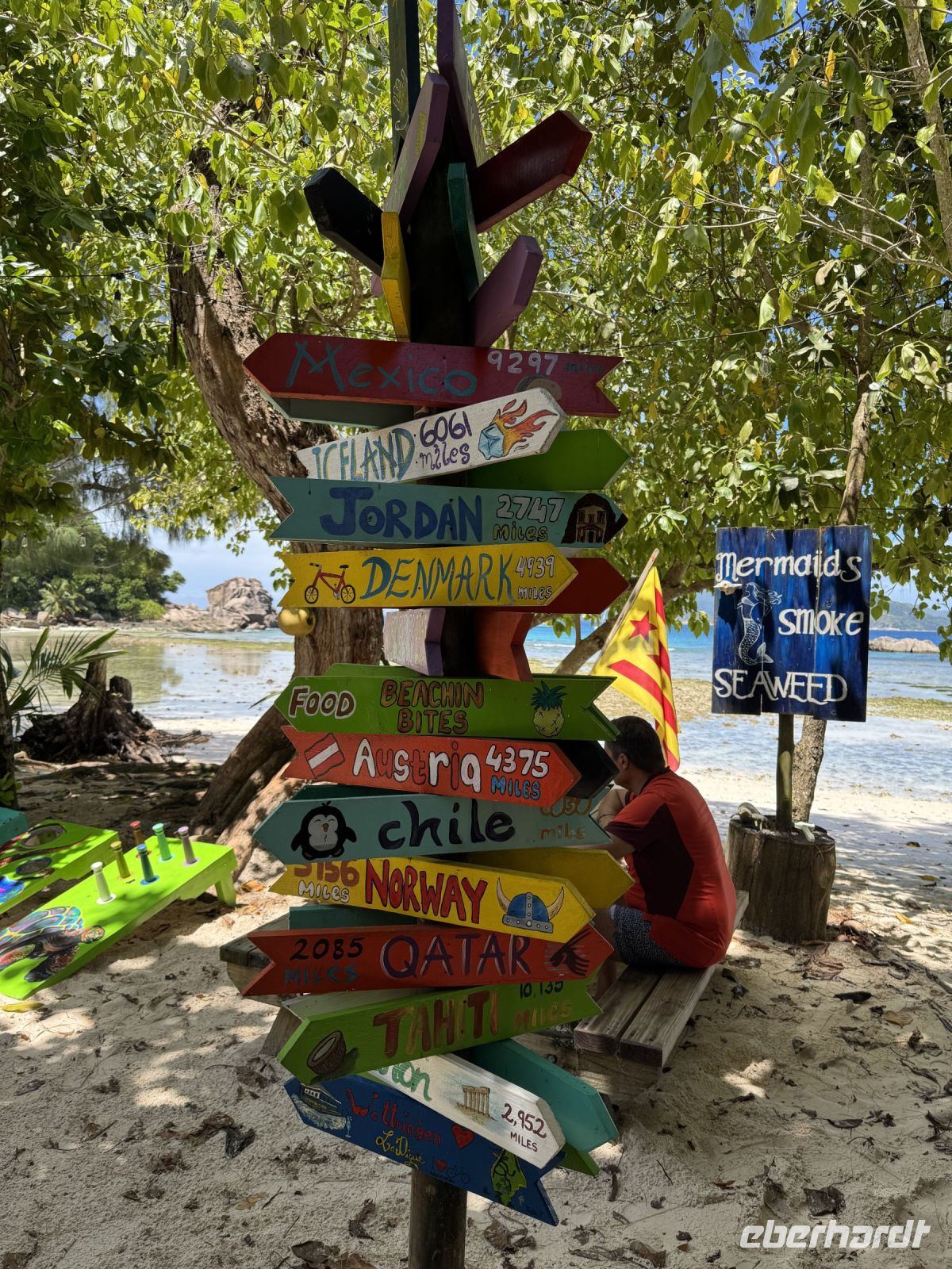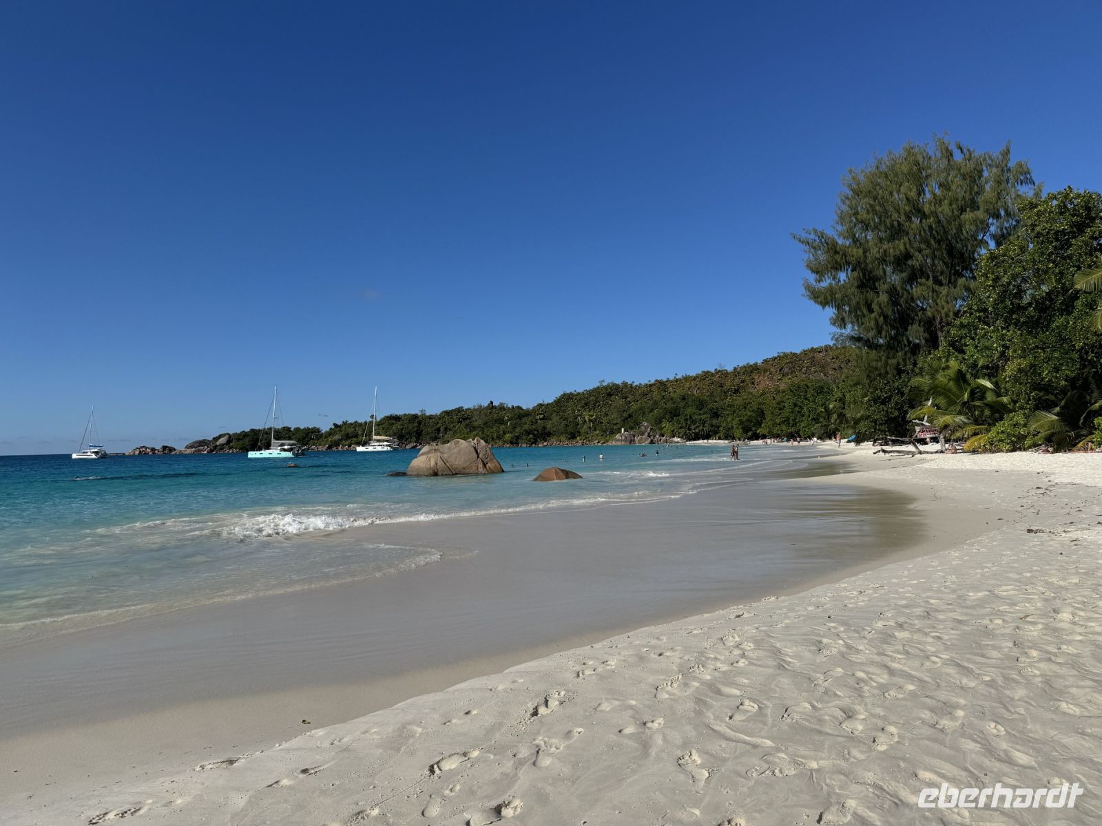 Nach dem Mittagessen statten wir dem schönsten Strand der Insel, dem "Anse Lazio" einen Besuch ab. Wir ziehen heute schon den Entschluss: Jeder Strand hat auf seine Art etwas schönes und jeder ist irgendwie anders. Der breite Sandstrand bietet am Rand einige Schattenplätze und lädt wunderbar zum Relaxen ein. Bevor wir zurück zum Hafen fahren nutzen wir noch die Möglichkeit einige Souvenirs zu erwerben.