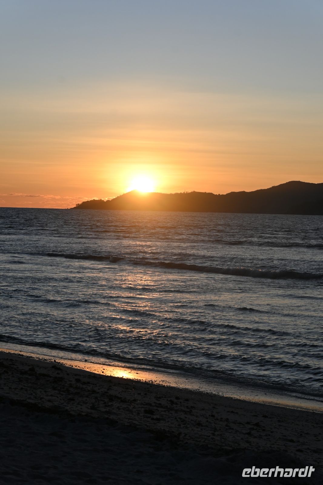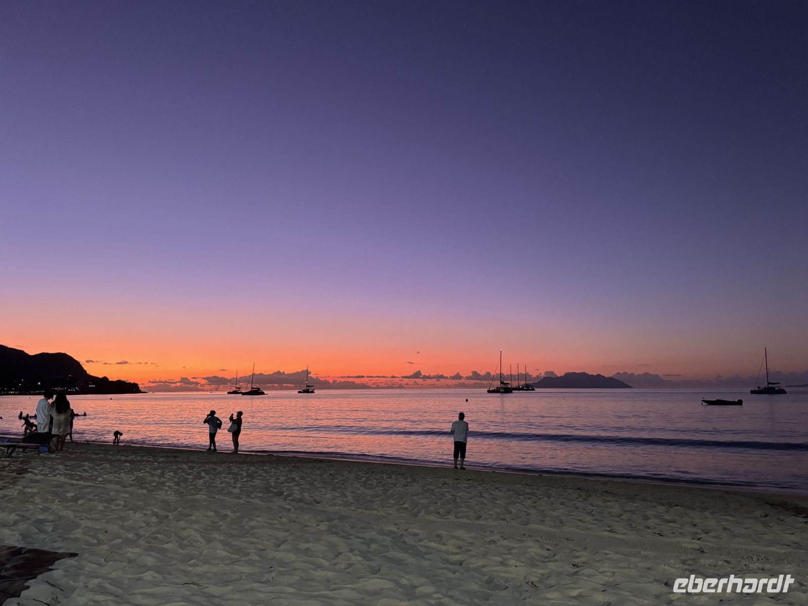 Für den späten Nachmittag ist wieder ein Bootsausflug geplant. Wir werden wieder zum Hafen gefahren und nehmen die ein oder andere Welle bis zu einer Bucht der Insel Praslin. Von hier haben wir einen wundervollen Blick auf den nahenden Sonnenuntergang. Bei Takamaka und einigen Snacks lassen wir die Reise Revue passieren. Prost! Auf schöne Erinnerungen im Paradies.