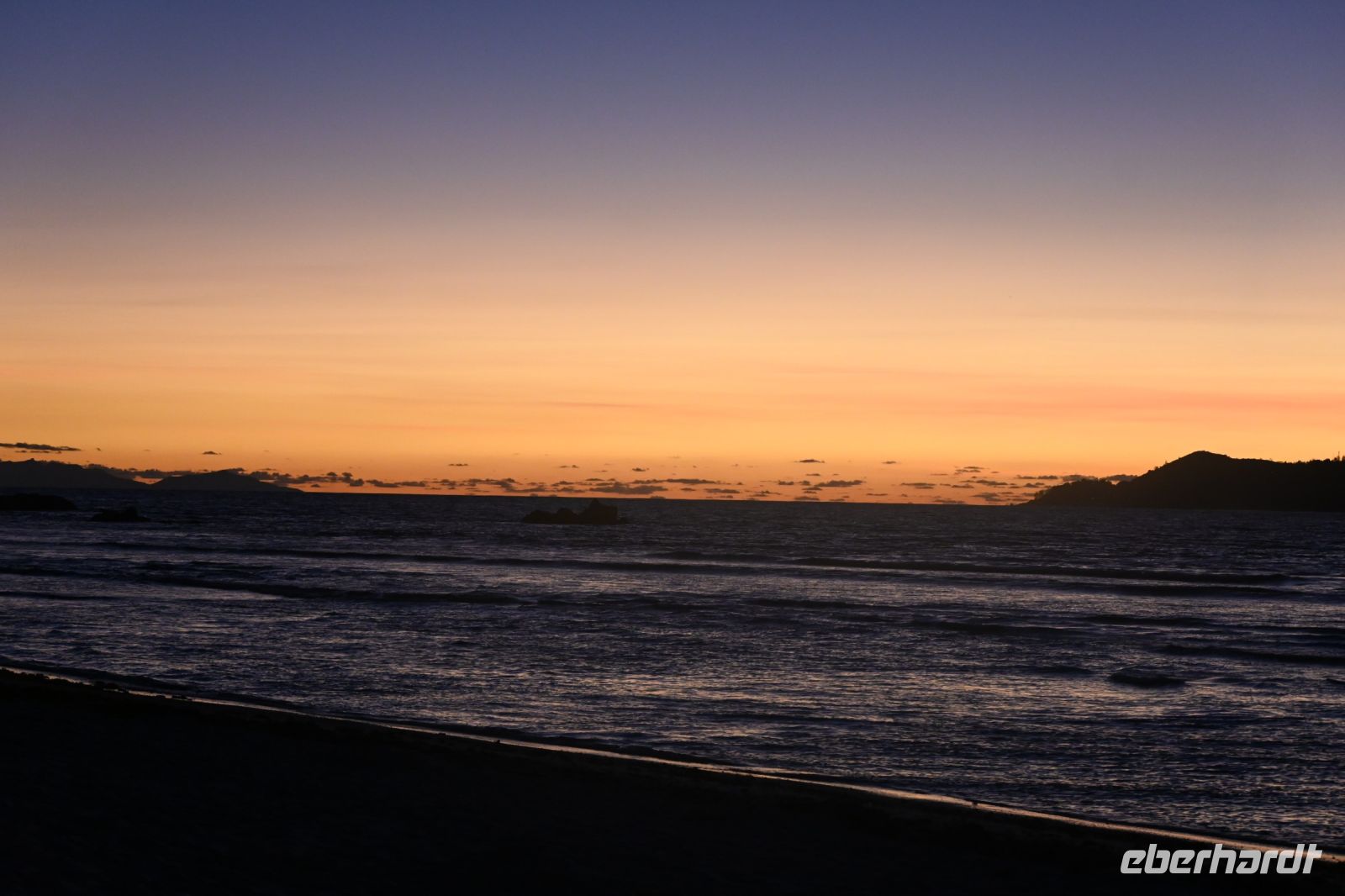 Zurück am Hafen geben wir unseren Koffer ab und betreten als einer der ersten die Fähre, damit sichern wir uns die begrenzten Plätze im Außenbereich ganz vorn. Hier lassen wir uns den Wind um die Ohren wehen und genießen den Ausblick. Mit einem kurzen Zwischenhalt auf Praslin erreichen wir gegen 18 Uhr unser Ziel für die kommenden sechs Nächte - La Digue. Da die Sonne bereits eindrucksvoll untergegangen ist, können wir noch gar nicht erahnen, was uns hier erwartet.